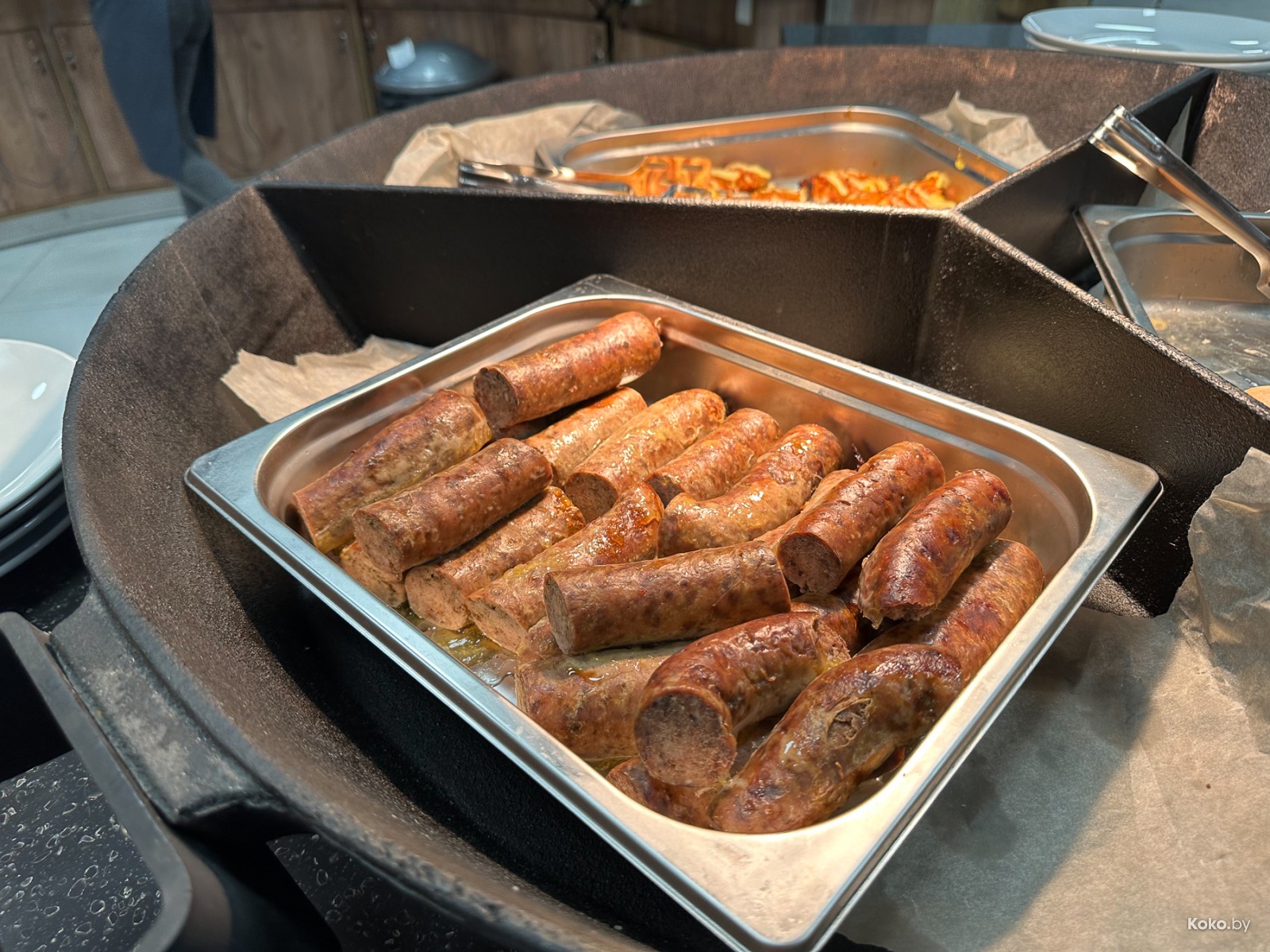 Суп из того, что растет в лесу - гуд! Колбаска из печени - топ, но нужны к ней соусы, квашеная капуста - огонь, куриное бедро, как дома. За 2 колбаски, бедро, драники два раза, блинчики, суп, капуста и чай - 25р.