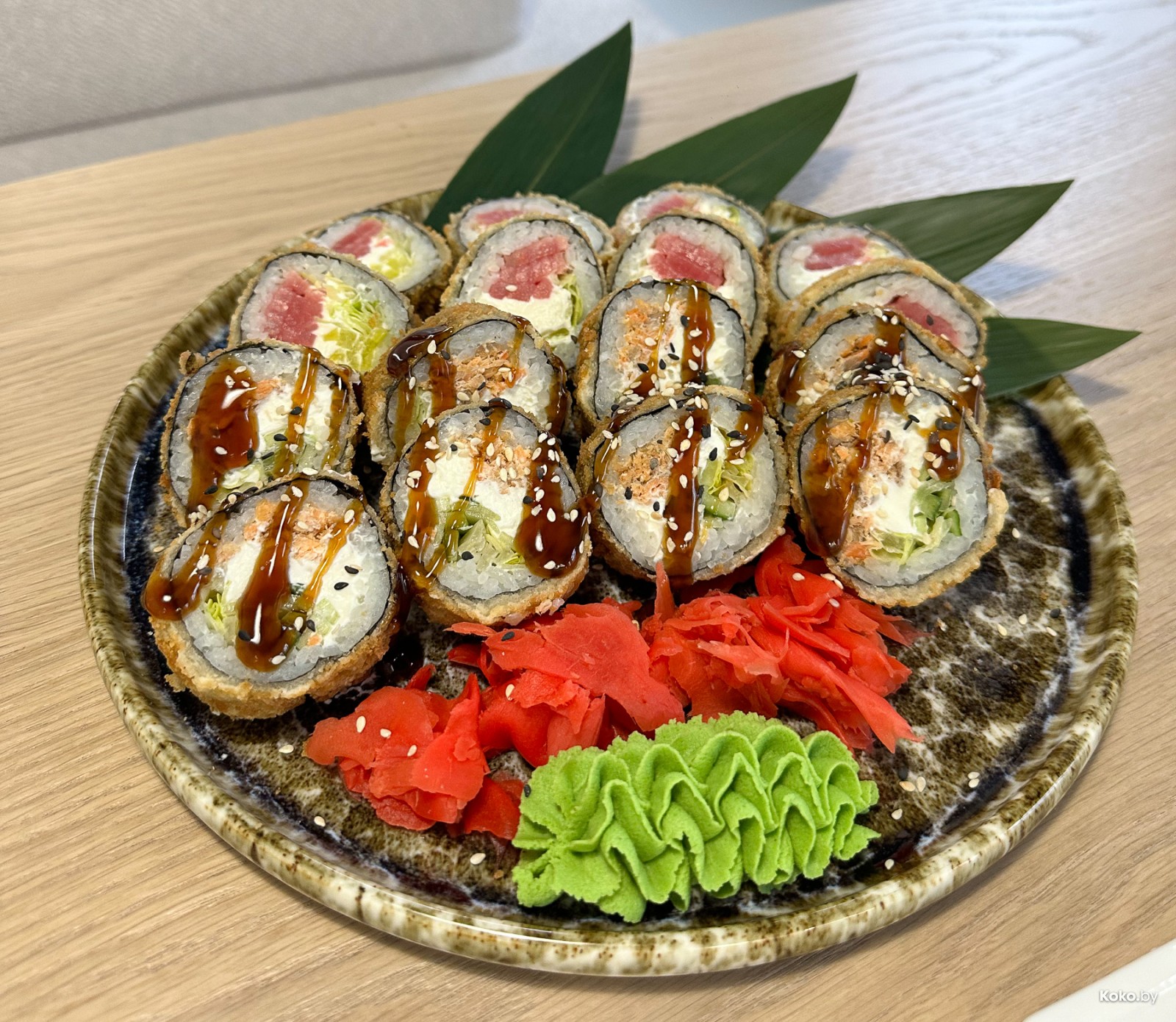 В первый день затестил самый дешёвый сет за 48р/1000г + гарниры за деньги. Сет на двух тарелках, роллы скручены хорошо, лосось есть, но мало, в основном тунца напихали. Сытый животик - топ за эти деньги.