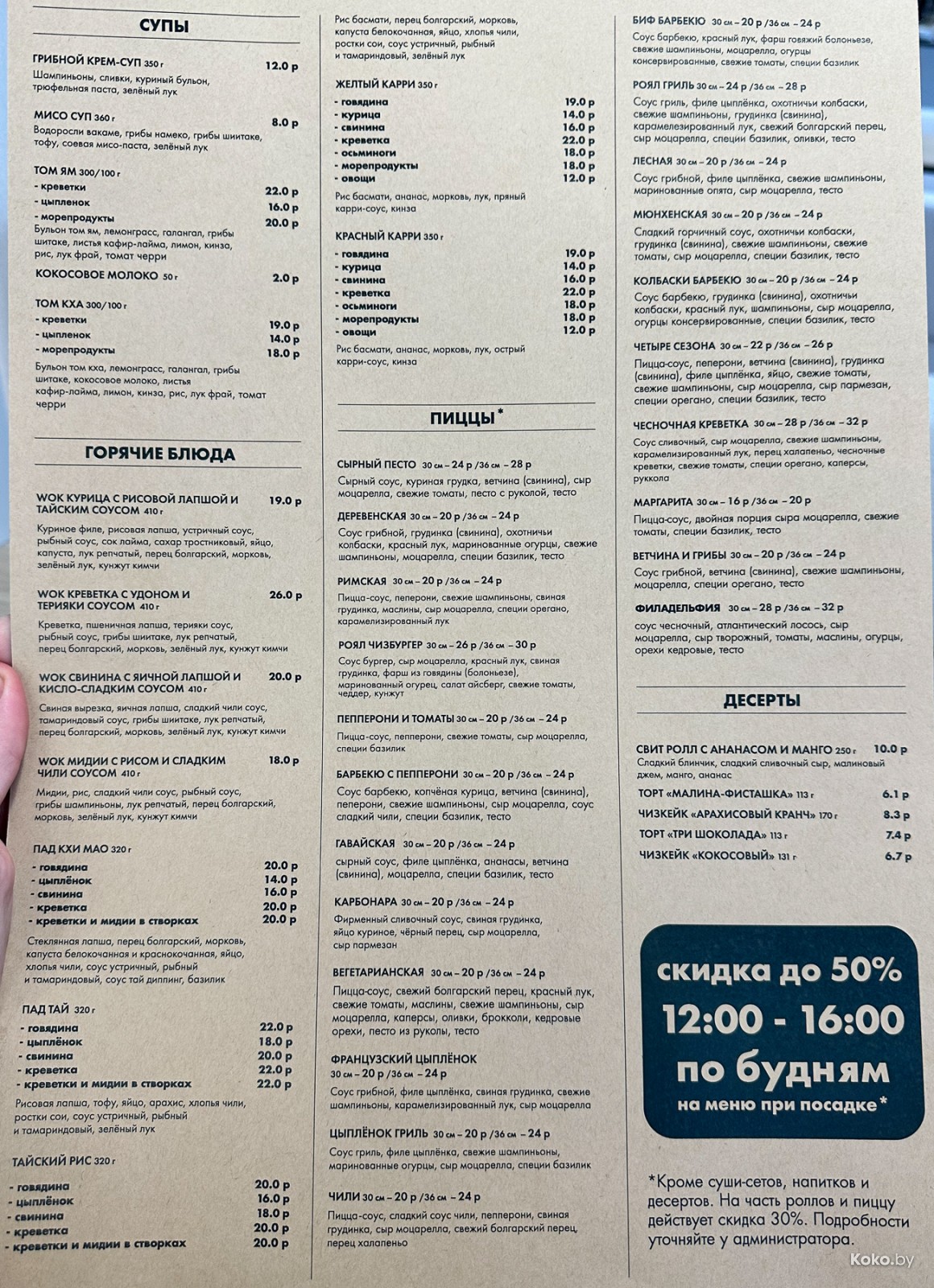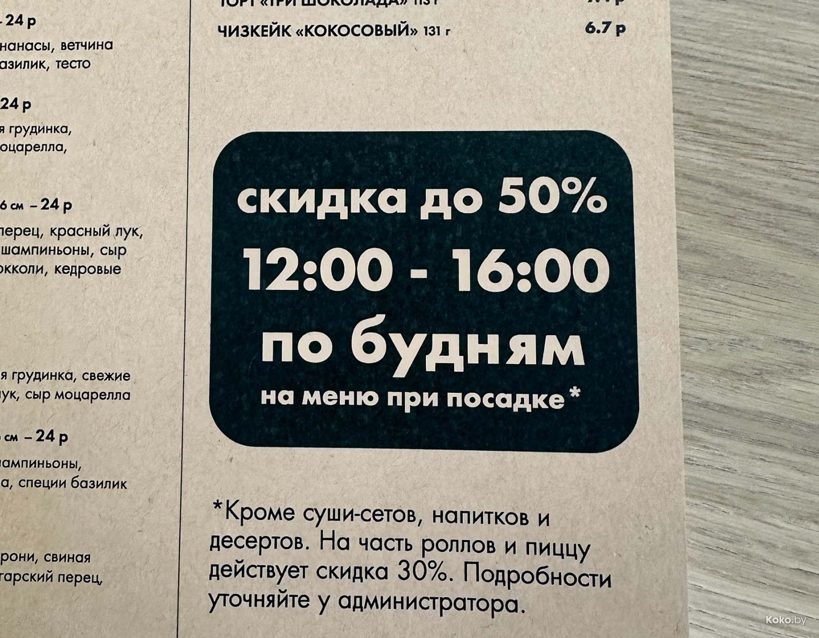 Запоминайте: скидос до 50% только внутри кафе по будням с 12:00 до 16:00, кроме суши-сетов, всех напитков и десертов.