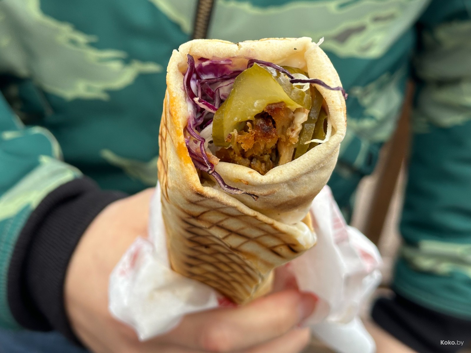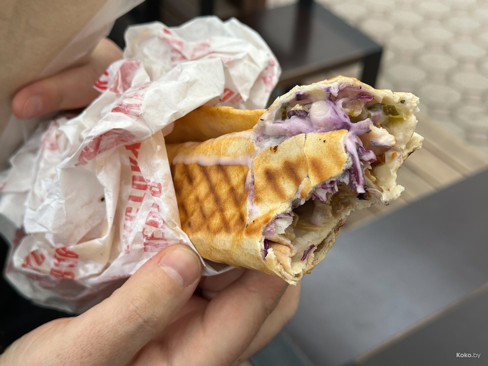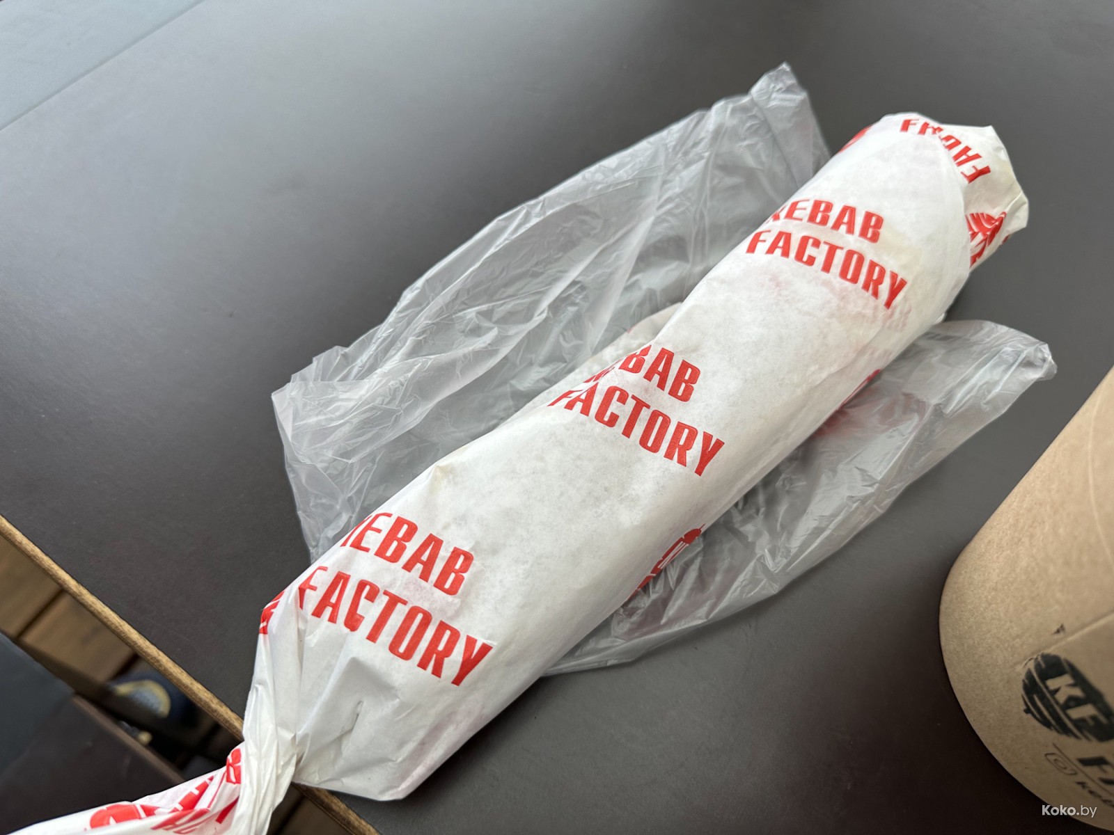 Кебаб скручен в аккуратную трубку размером под рот. По большей части сытно за счёт лепёшки. В Минске таких не встречал, крепкие 8 кокобаев.