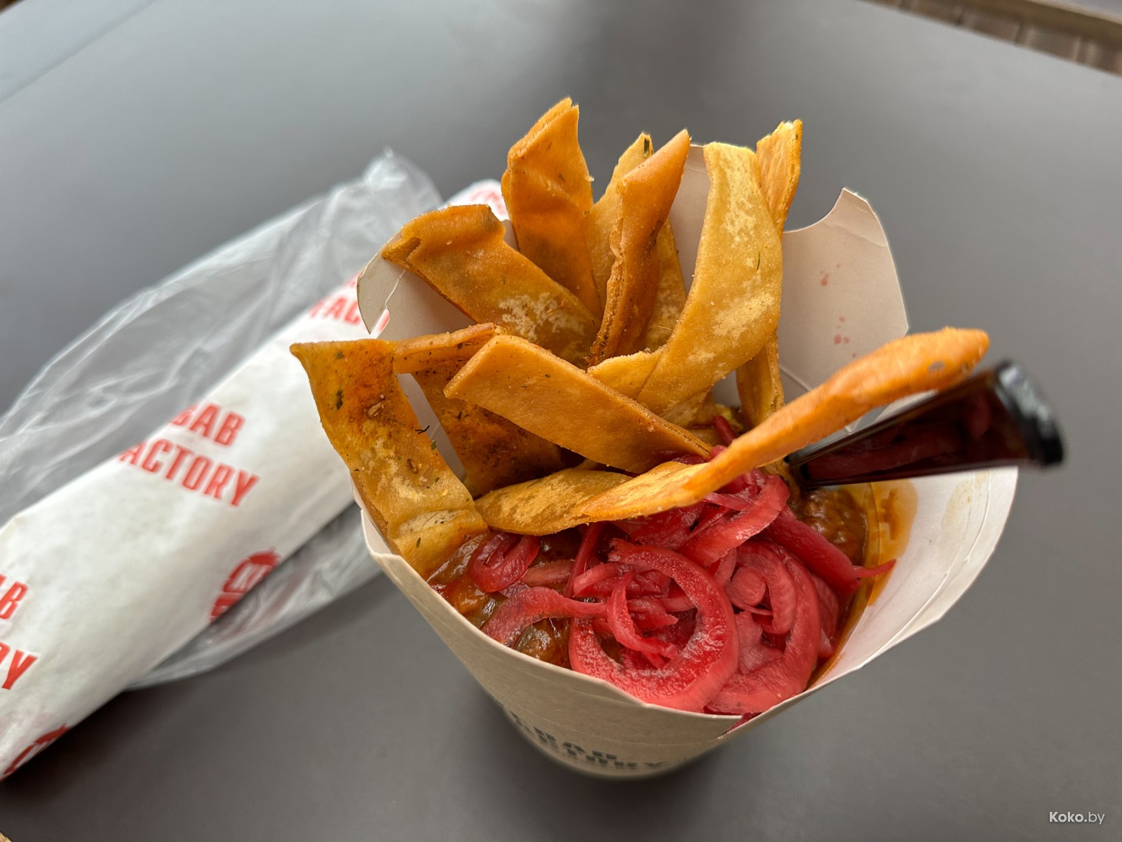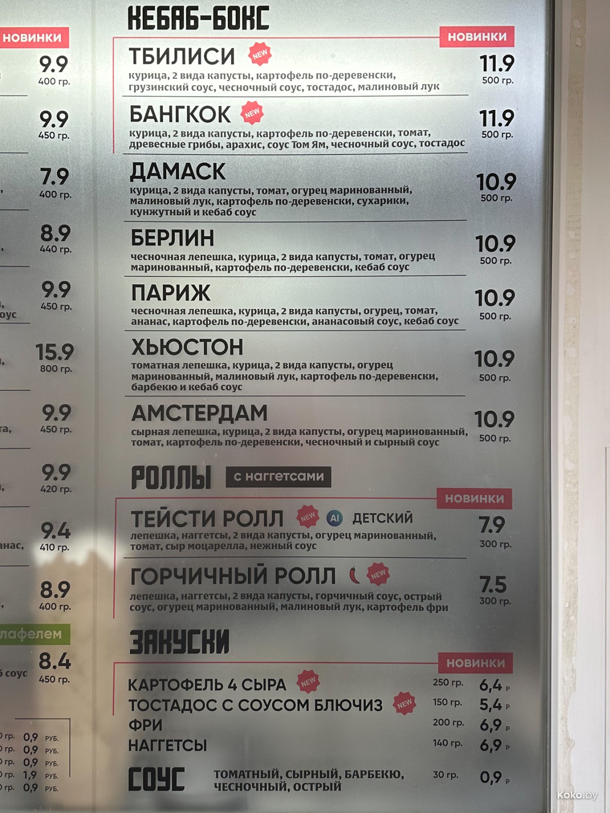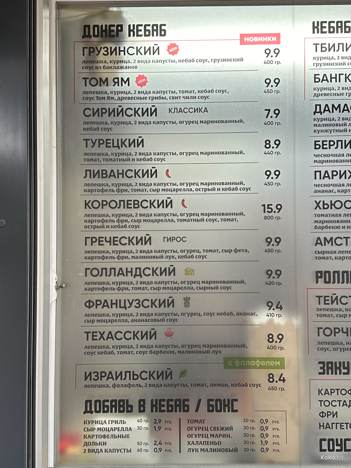 Кебаб скручен в аккуратную трубку размером под рот. По большей части сытно за счёт лепёшки. В Минске таких не встречал, крепкие 8 кокобаев.