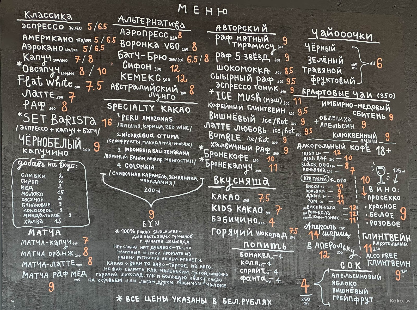 Второе за неделю тематическое заведение про кофе заработало на улице Петра Мстиславца, 10. Про первое, где вам готовы предсказать судьбу по ладошке, раскинув карты, почитаете чуть позже, имя ему «Утопия». Плавно возвращаемся к новому «Чёрнобелому», что приехал из Гродно, там он зовётся «Крепкий белый». Концепция максимально френдли: дог, веган, кэт, пэт, студент и даже фриланс. Для последних у них отдельный стол синего цвета, думаете сработает?