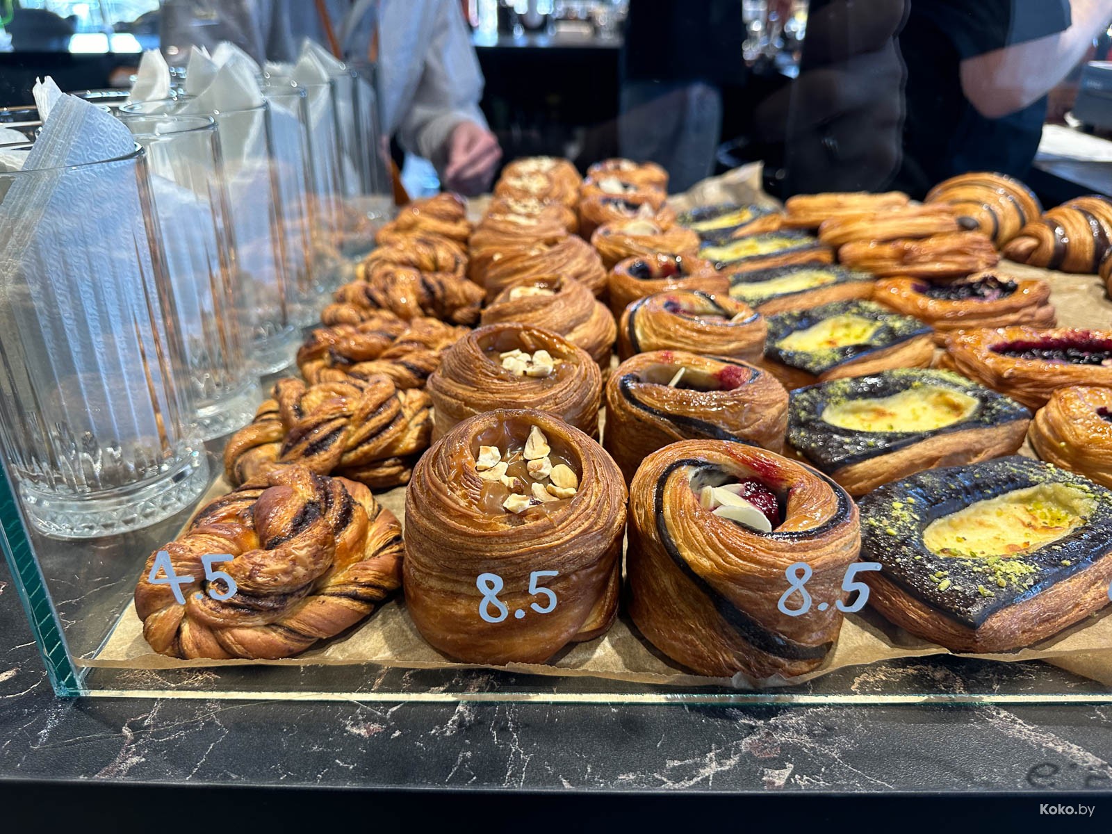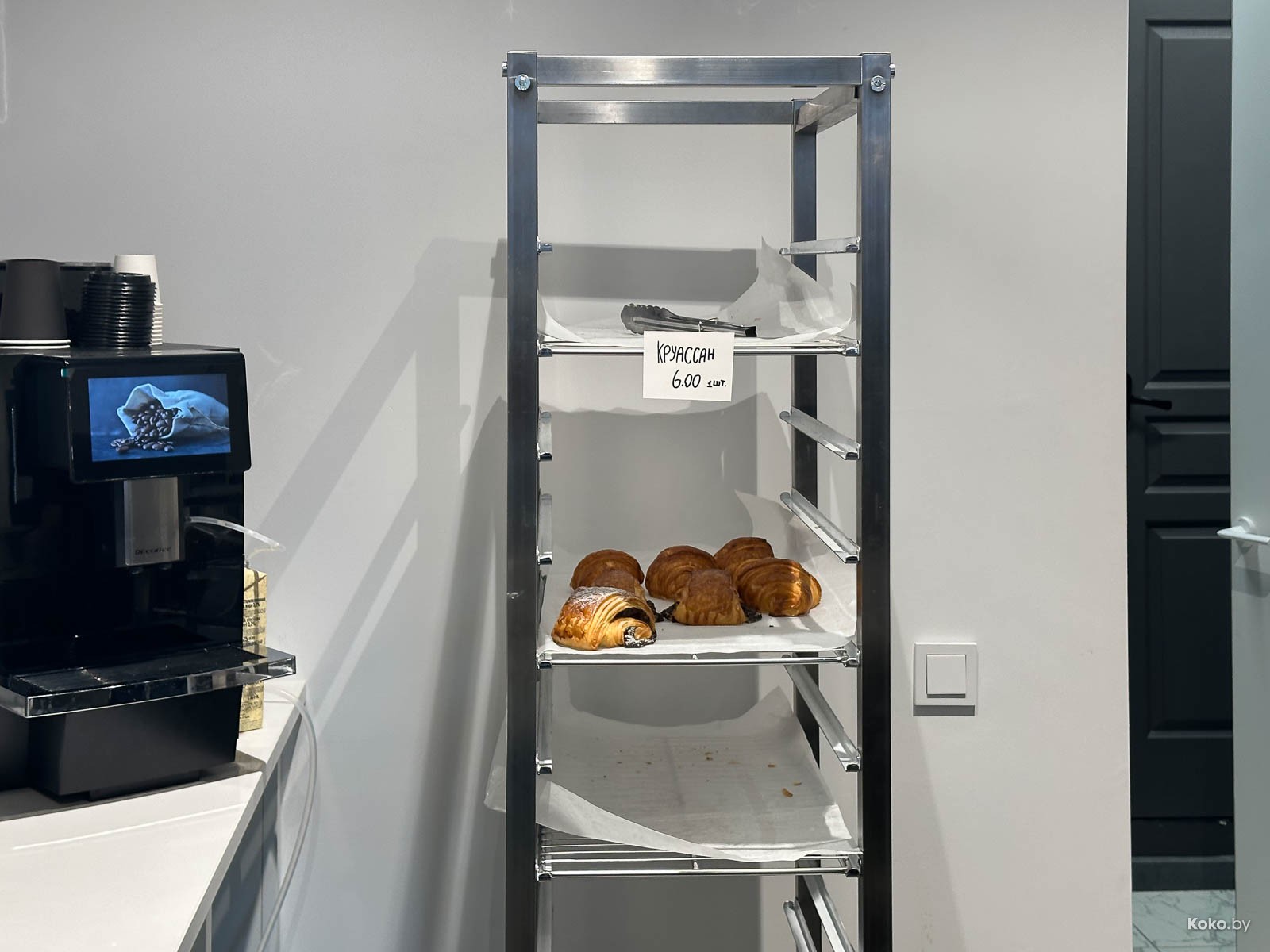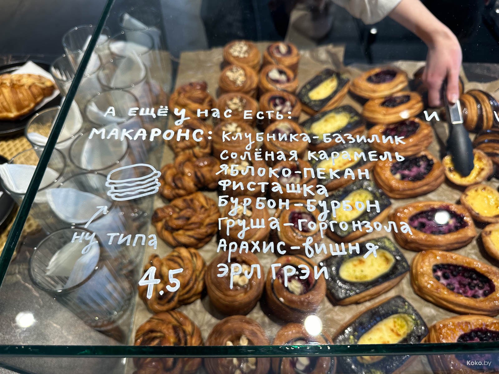 Разный кофе, чуть алко, какао, матча, джусы, наисвежайшая выпечка из «Льна», и скоро появится еда, надеюсь, будет что-то с мясом.