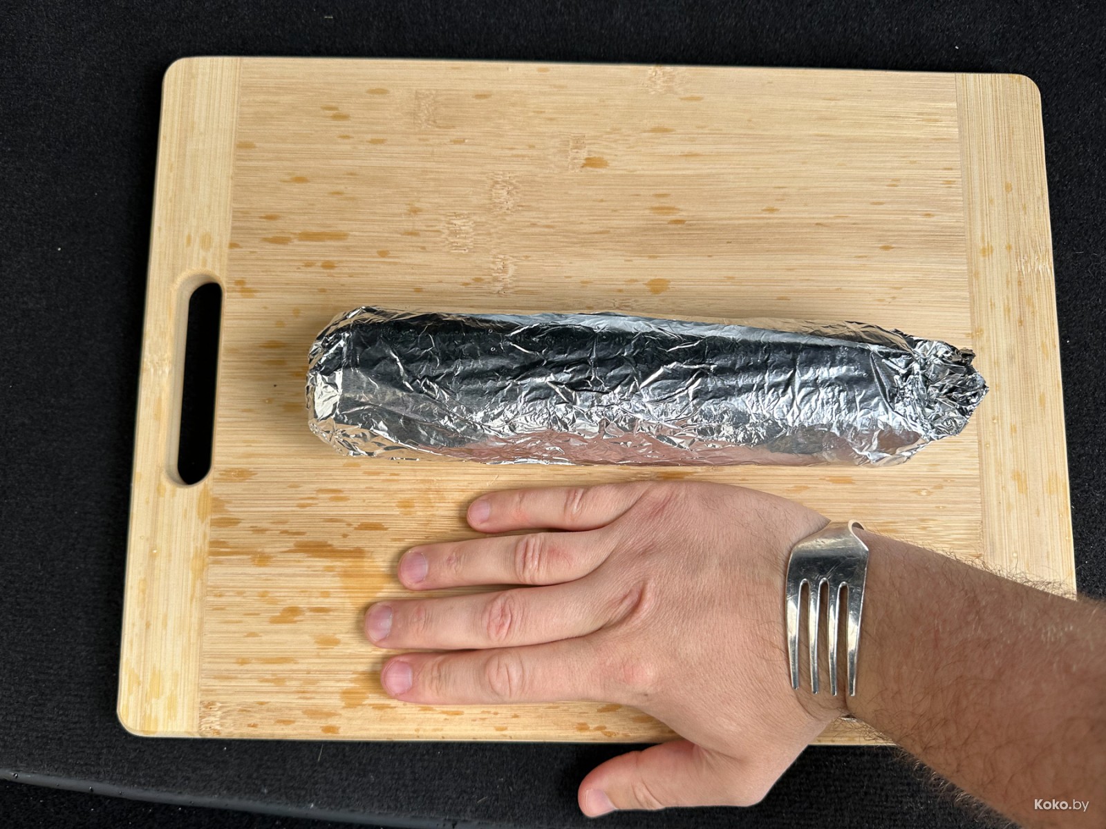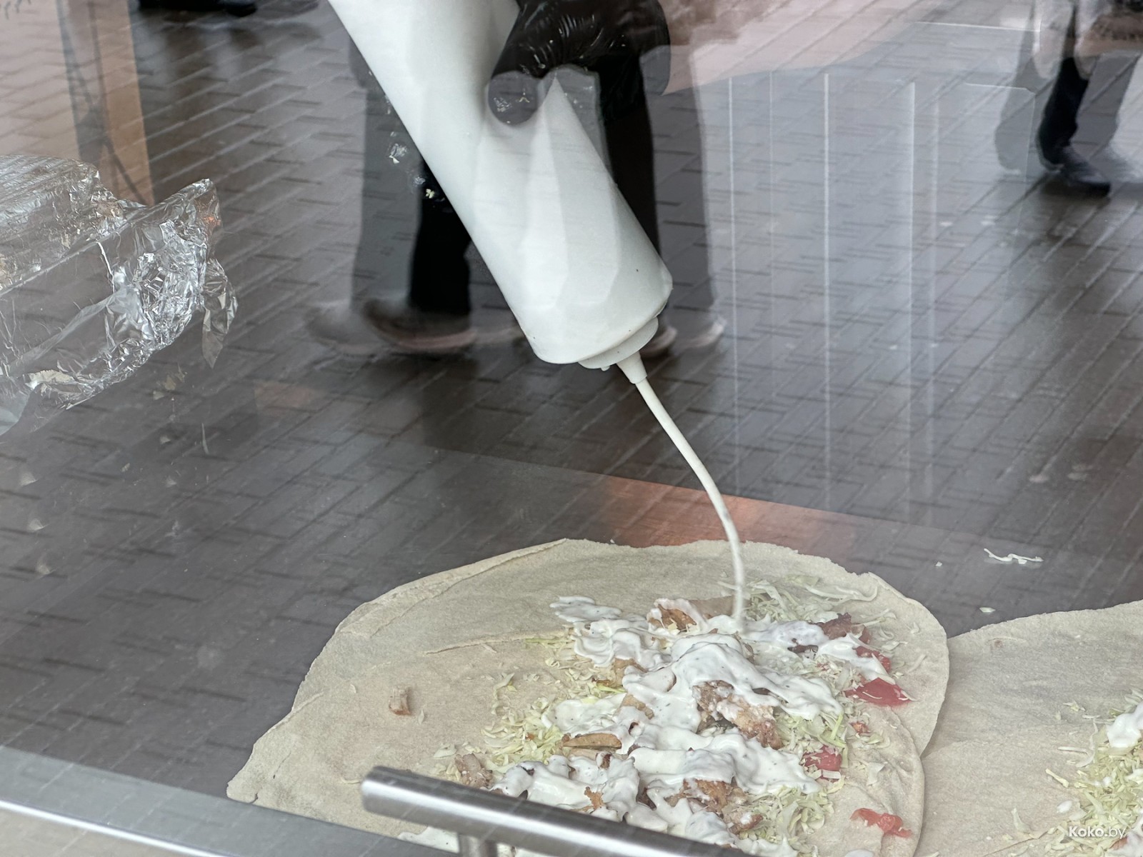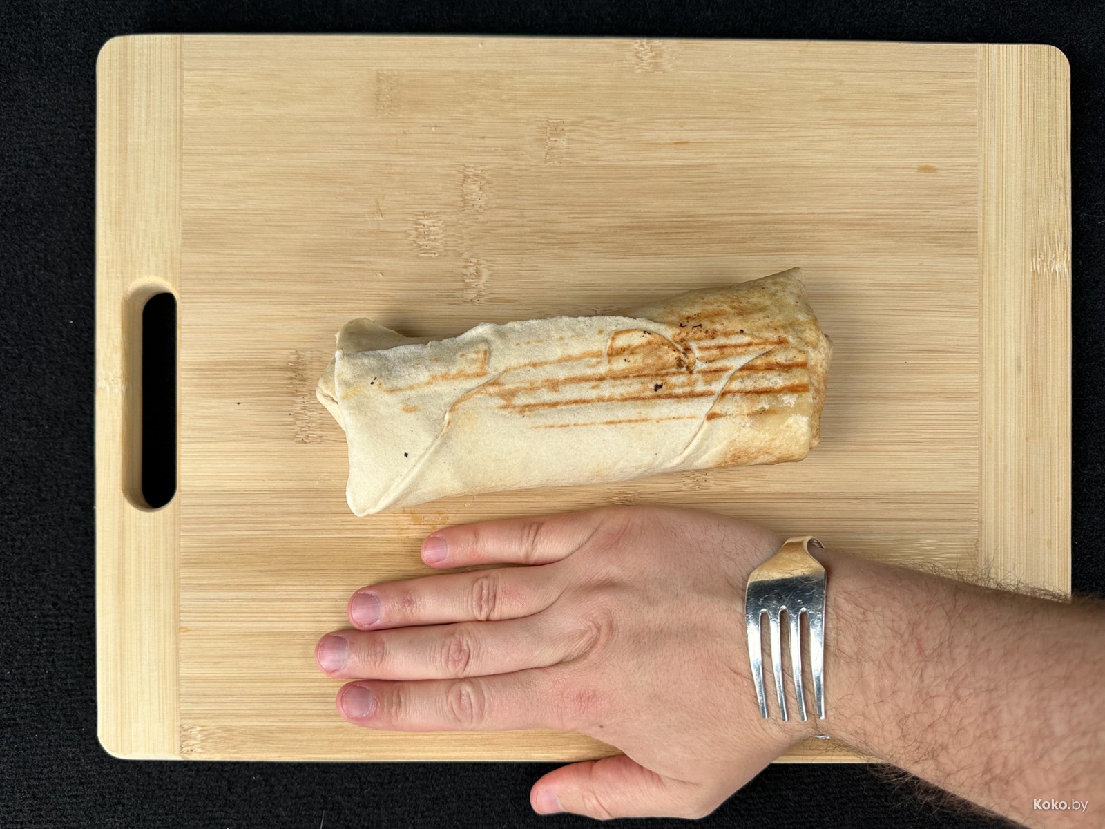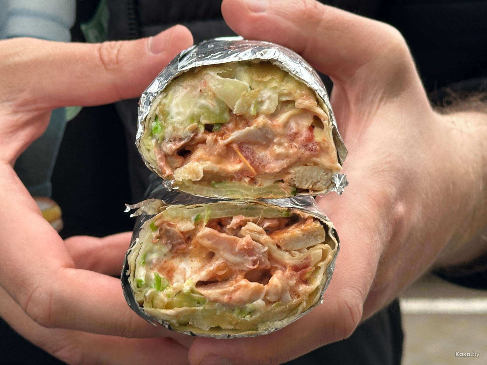 Шаурма в фольге, давно не видел такого. Скрутка уверенная, в один лаваш, много курицы (больше, чем у Пабло), капусты чутка, соуса ровно столько, чтобы сочно, но не текло. Пару капель таки упало на асфальт.