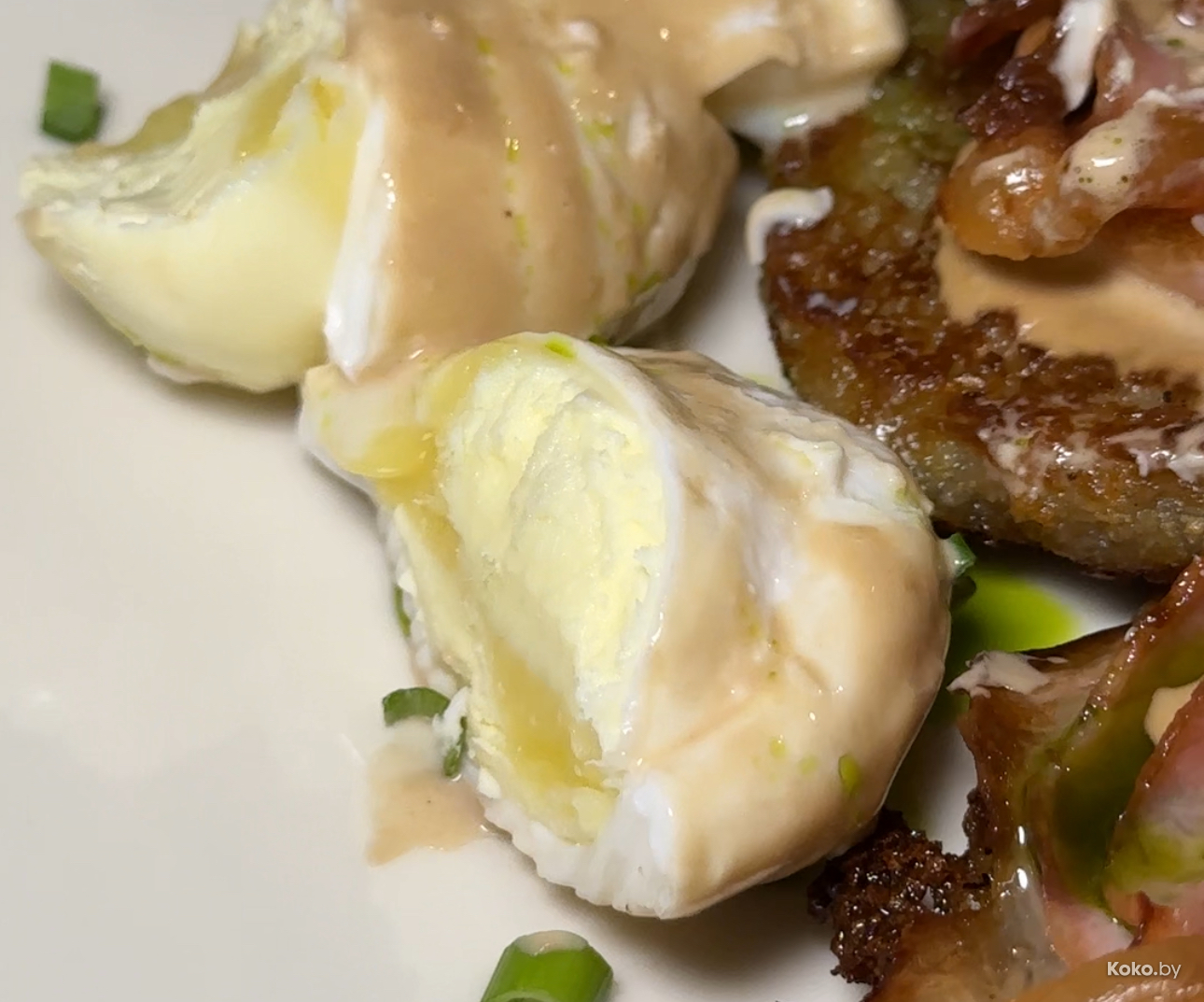 4. Готовят шустро. Пришло время горячительного - отличные по всем показателям три крупных драника чутка пересолили, яйцо чутка переварили, бекон - гуд, сливочного соуса могли дать больше.