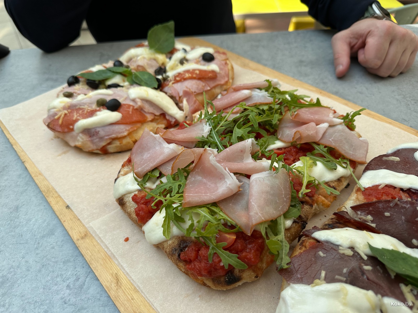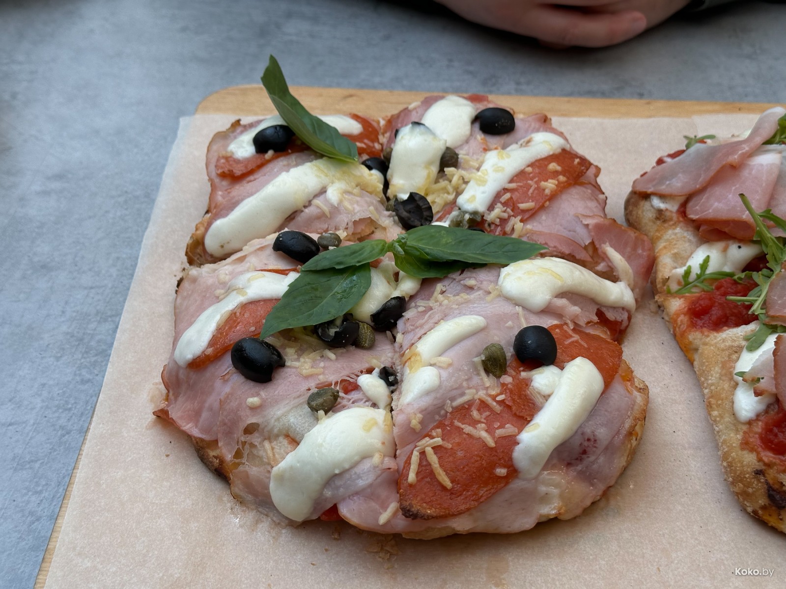 2. Вторая - с толсто нарезанной бабушкиной полендвичкой под руколой. Эта пицца в разы сочнее, отжалели больше помидорной пасты.