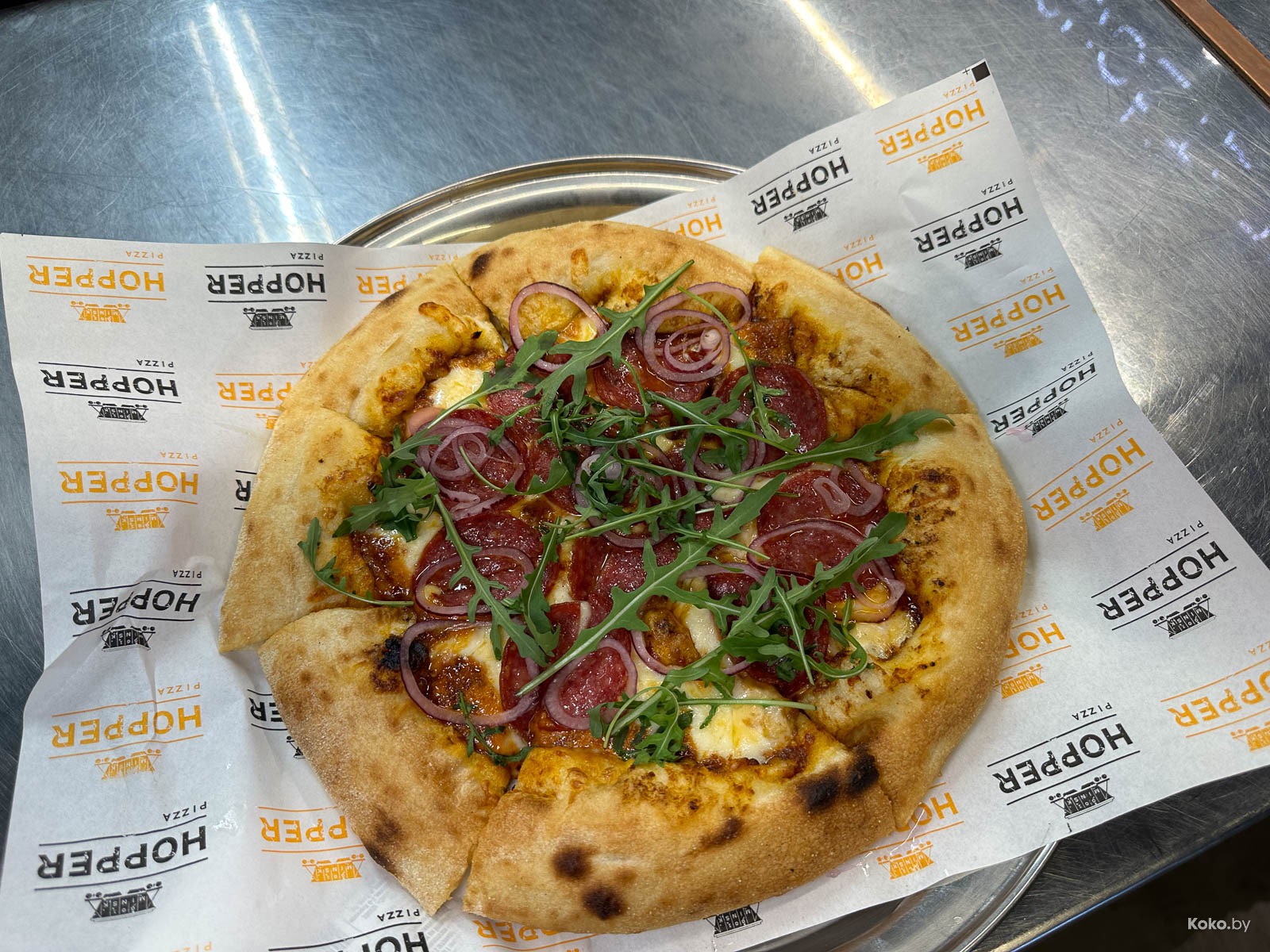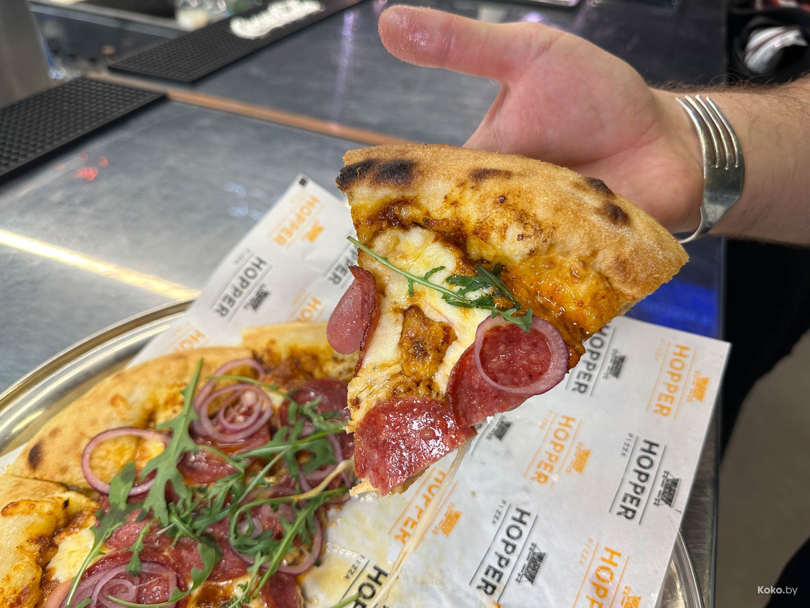 Дьявольская пепперони по-молодечненски с тремя видами сыра - 19,50р. Тесто пышное, хрустящее, тонкое, борты могли быть такими же.