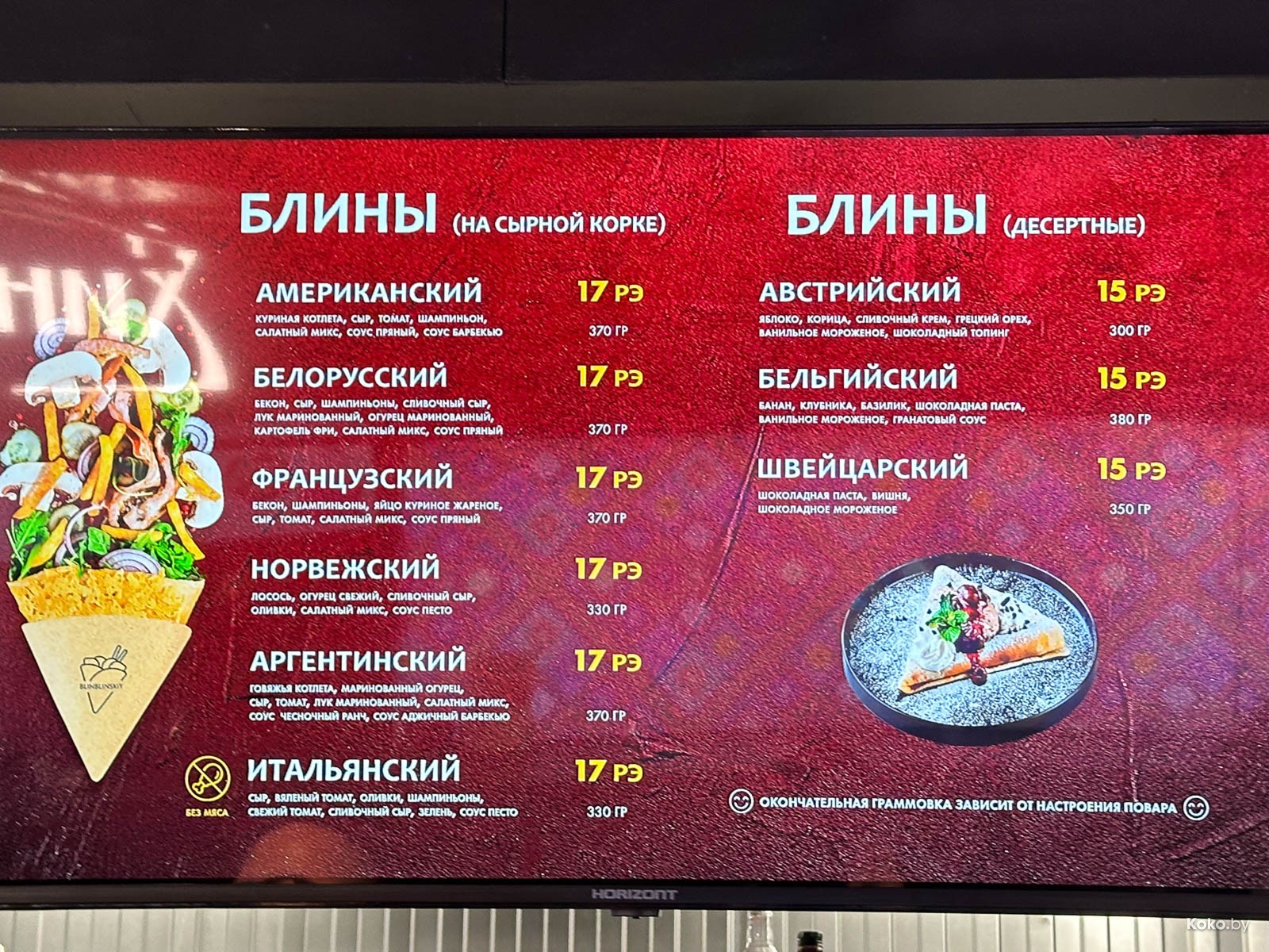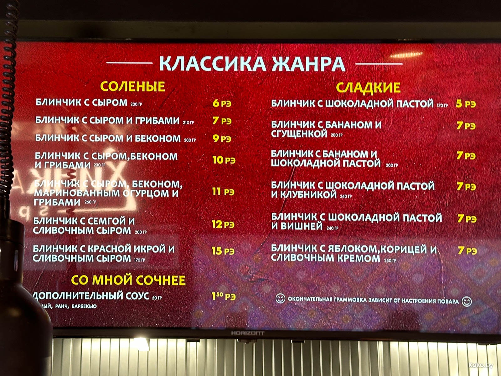Чуваки хорошо зарекомендовали себя на улице, фирменные блины плотно-сырные, начинистые, размером с китайский веер. За блин с куриным великаном наггетсом с карты сняли, мать его, 17р. Дорого!