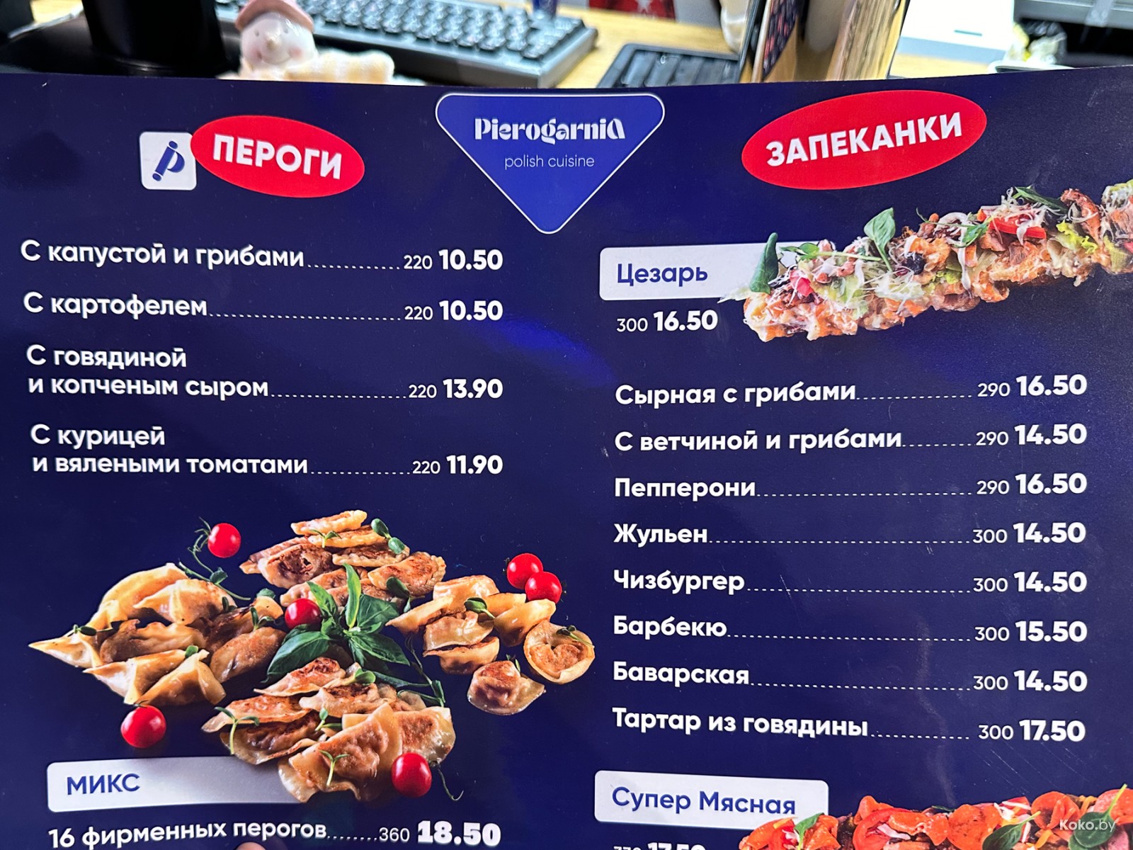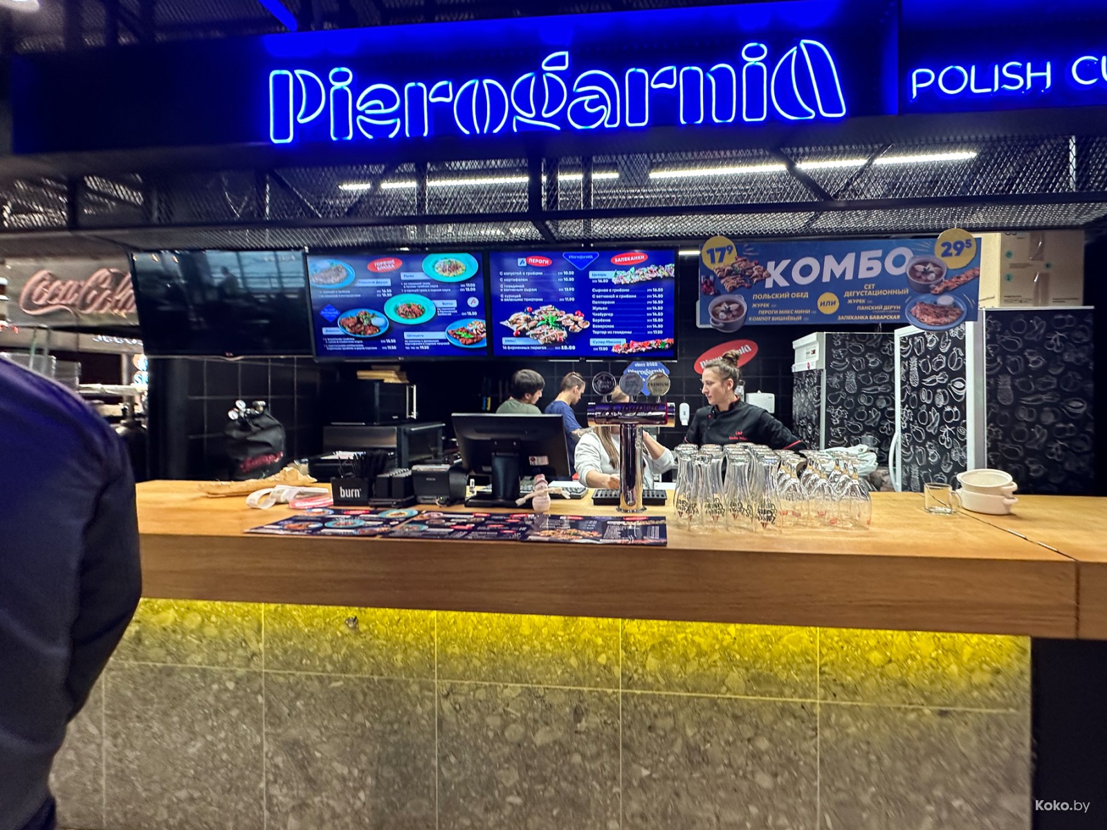 Место чебуречной заняли польские прысмаки, и пирогов тут нет. За 38,50р у нас на подносе жареные пельмени с грибами и капустой, тарелка журека со сметаной, бигос с колбасками и по морсу.