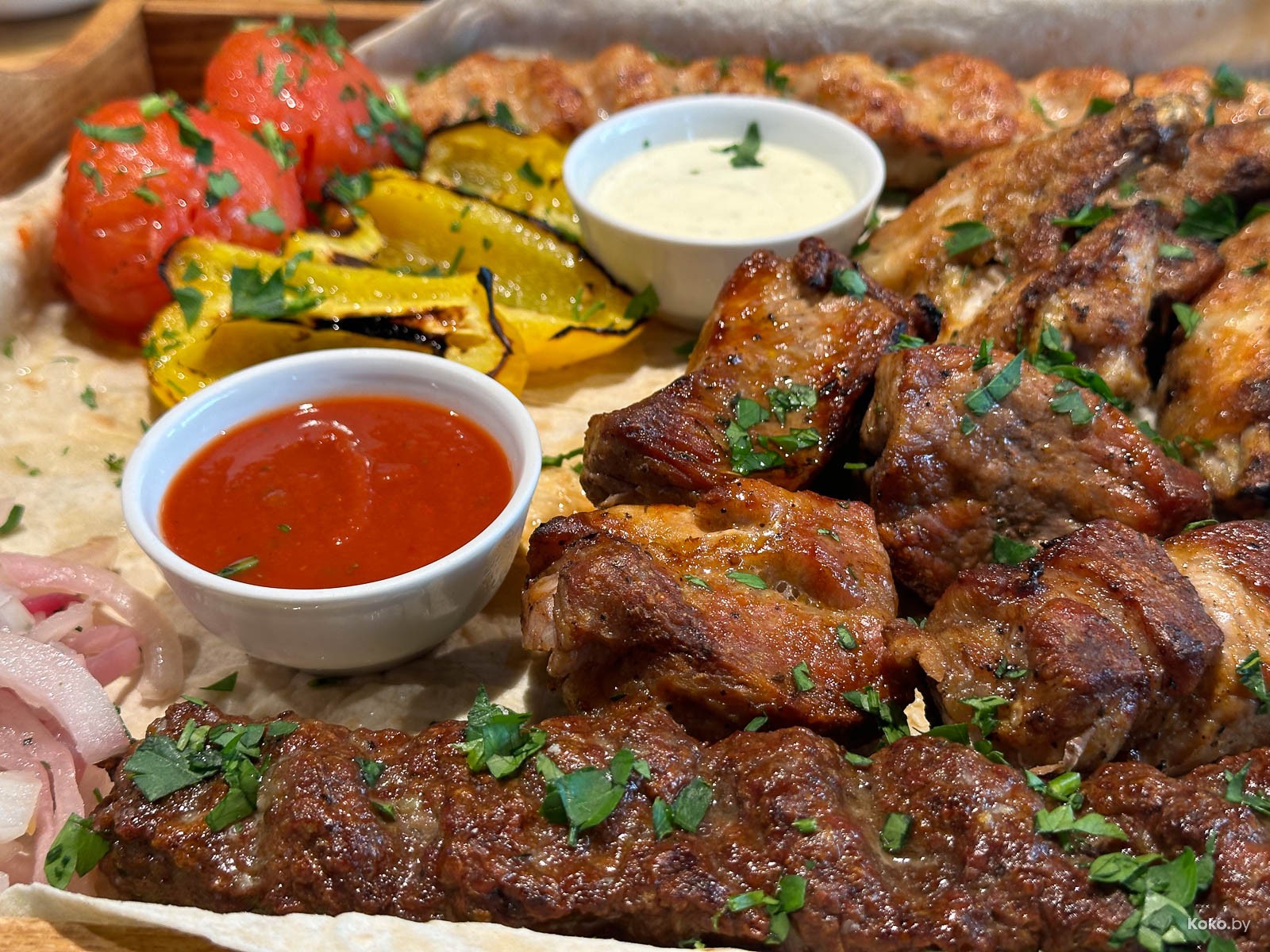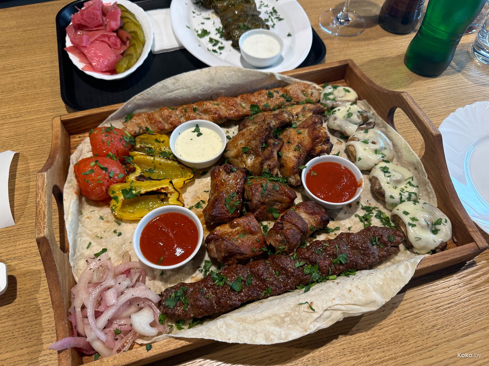 В армянской траттории душевный дядя играючи готовит мясо на раскалённых углях. Собрали всего по чуть-чуть в коробку: крылья, шампиньоны в сыре, кебаб из говядины, шею поросёнка, кебаб из курицы, овощи на гриле, свои соленья и два Натахтари. На чеке 96р.