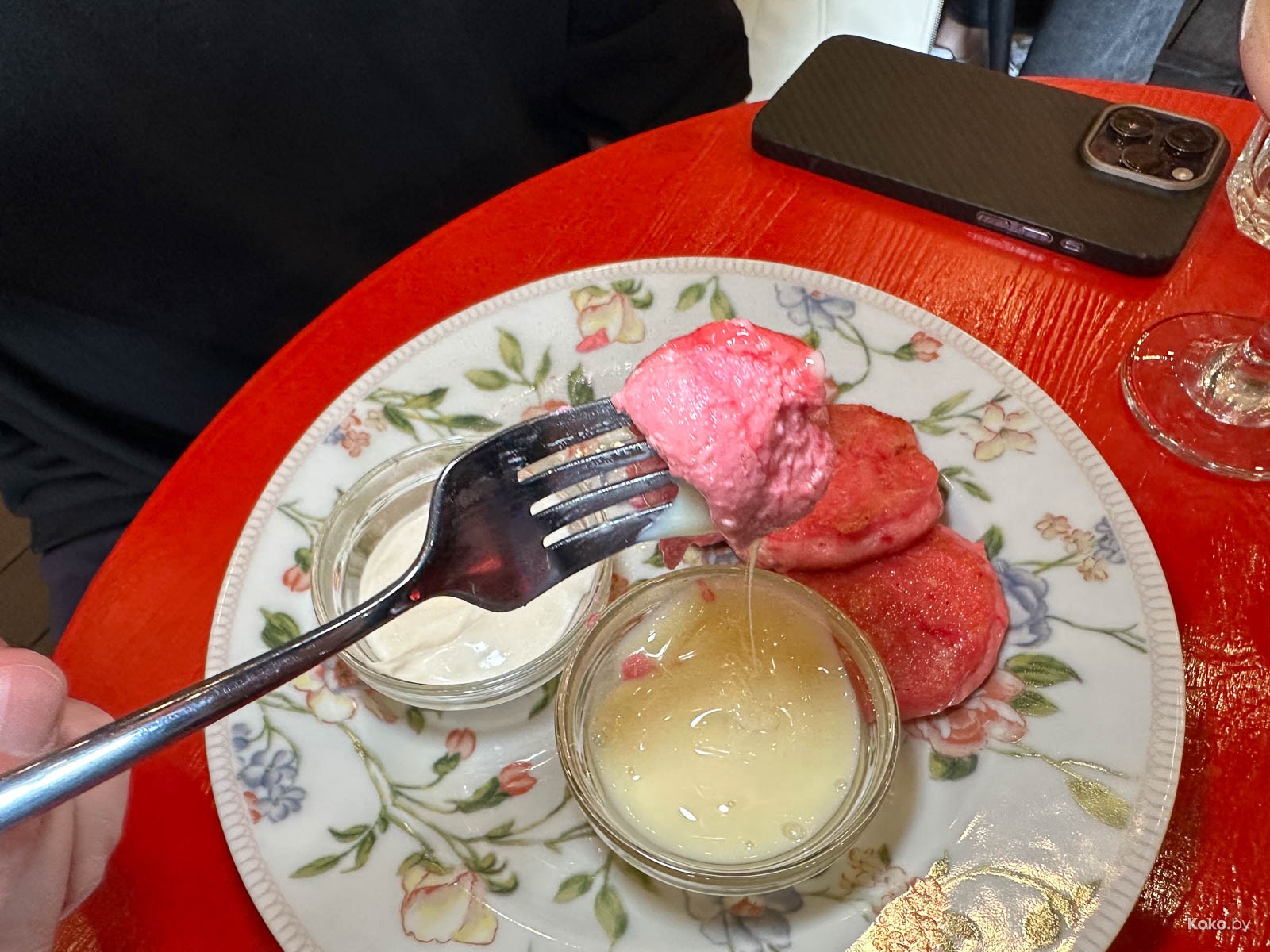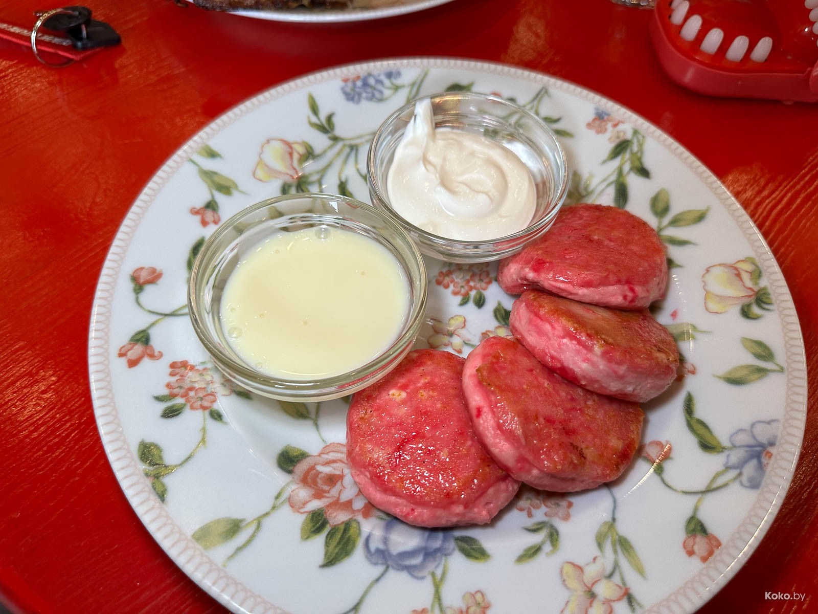 2. Четыре розовых сырника за 15р выглядят, как творожные бабушкины клёцки. Да, глаз всё ещё, как у орла. Текстура нежная, слегка желейная, сложно понять, как так вышло с творогом на сковородке.