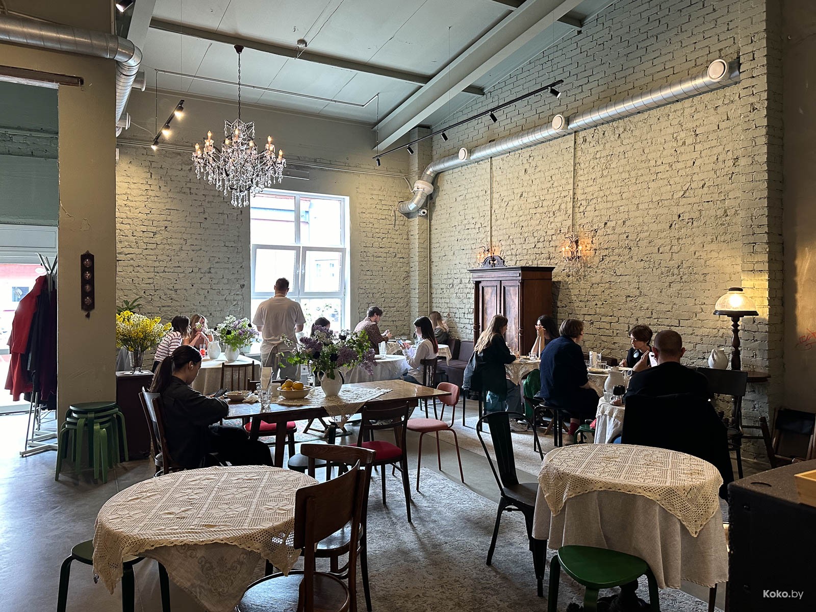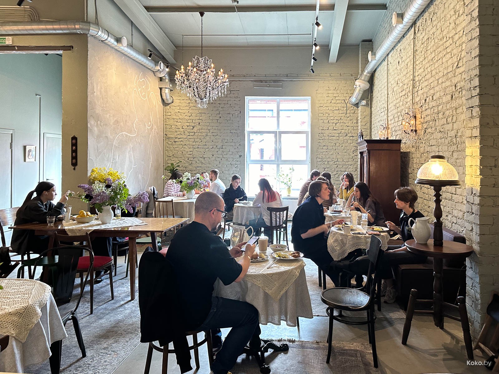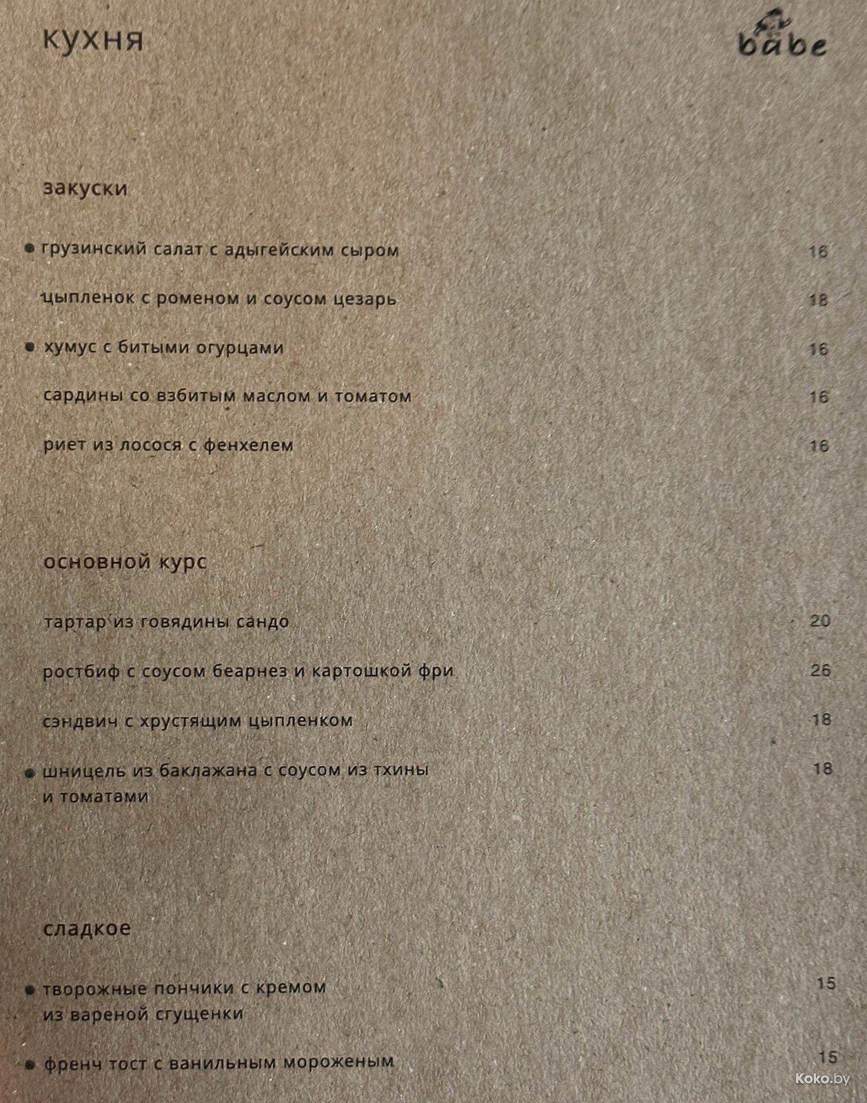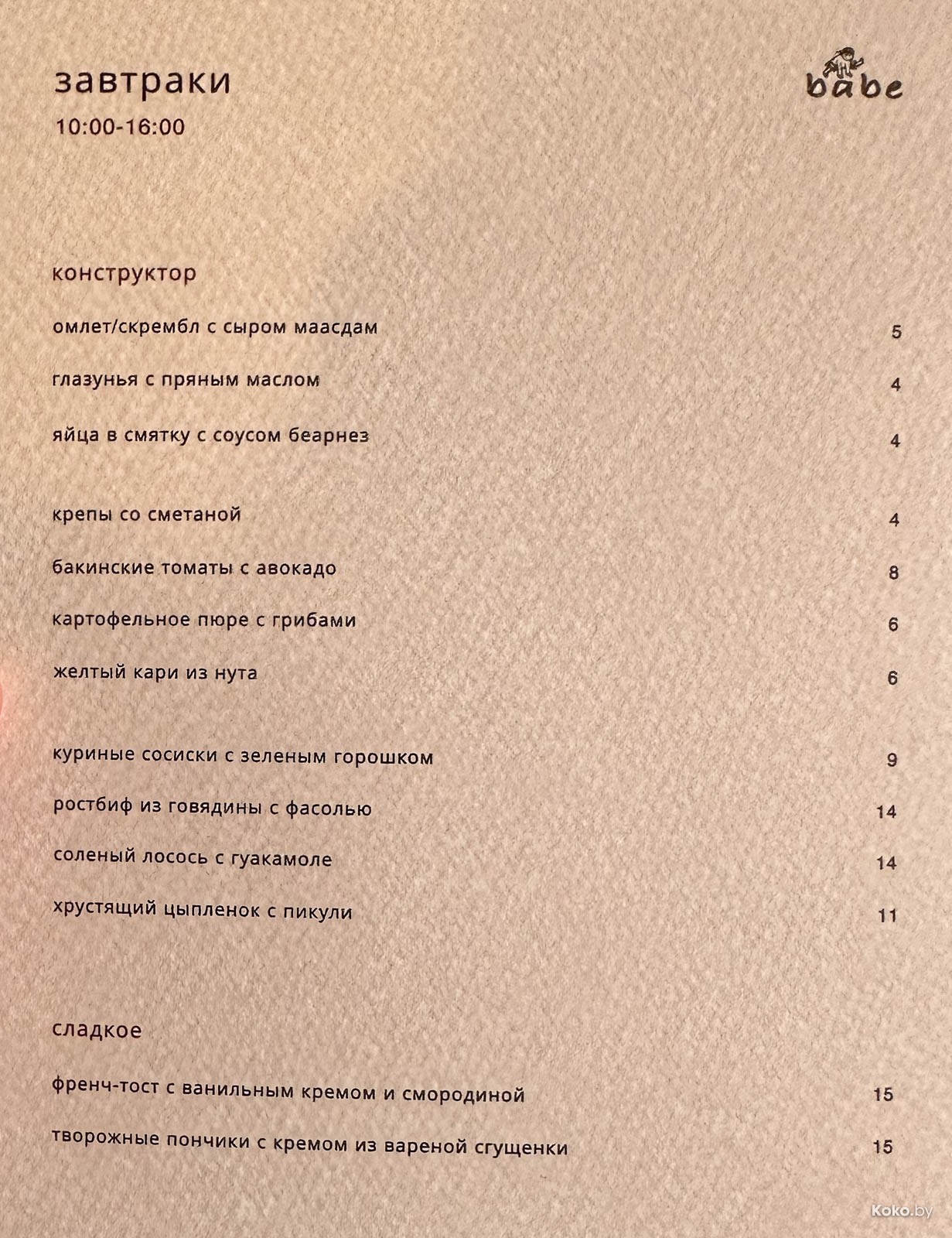 Не знаю, что за диджейская бесовщина творится у них по вечерам, но вот завтраки ощутил на себе в полной мере. Прибыли в новый китчен-диджей-бар «Бэйб», не путать с бабе, на новом месте, куда ещё не ступала шальная нога ресторатора - помещение во дворике на Кальварийской, 21. Концепция от еды до бетонного пола в коврах сильно молодёжная. С 11 дня на завтраках из парней лишь мы и официант с барменом - даю парням наводку для знакомств.
