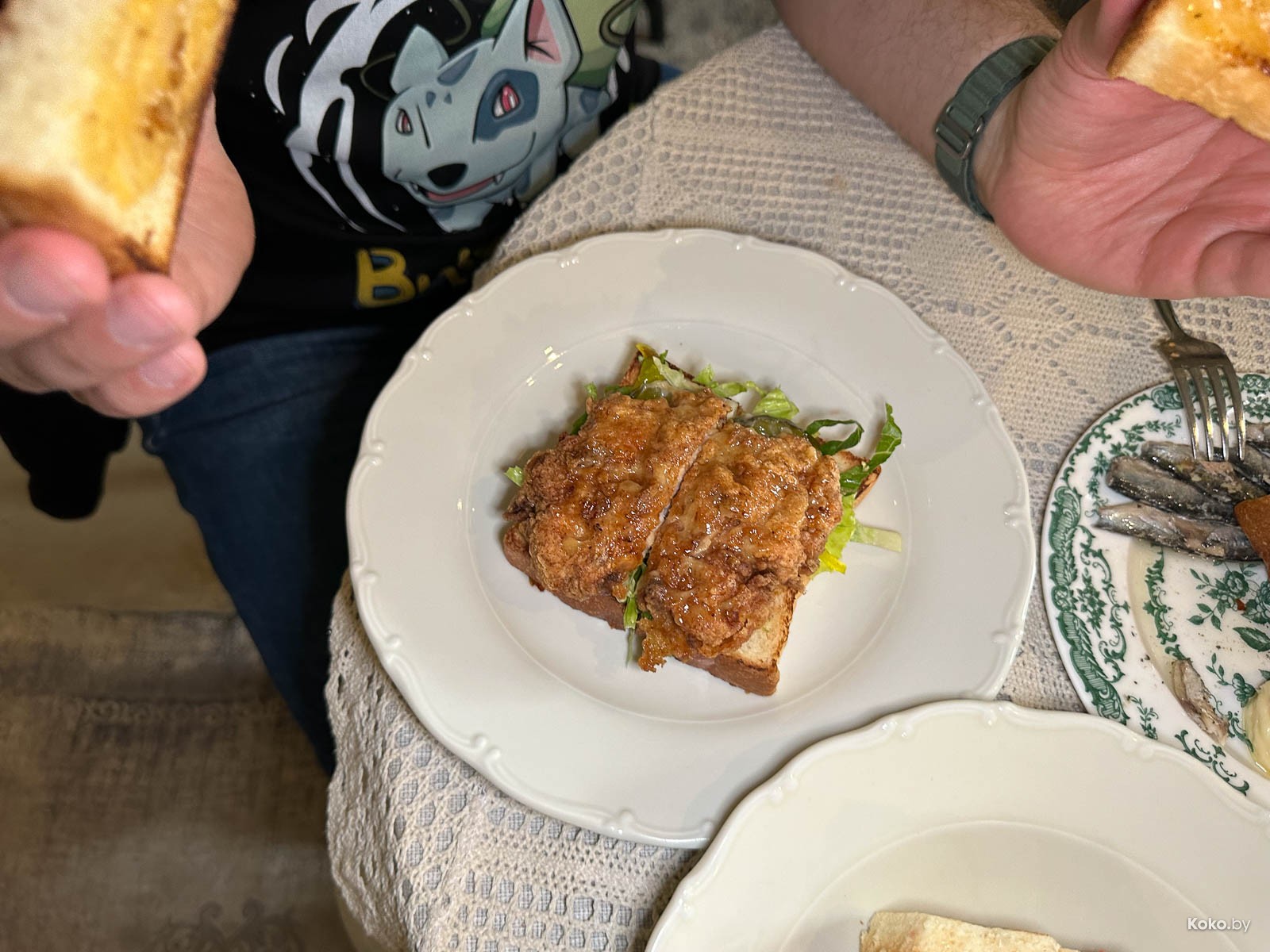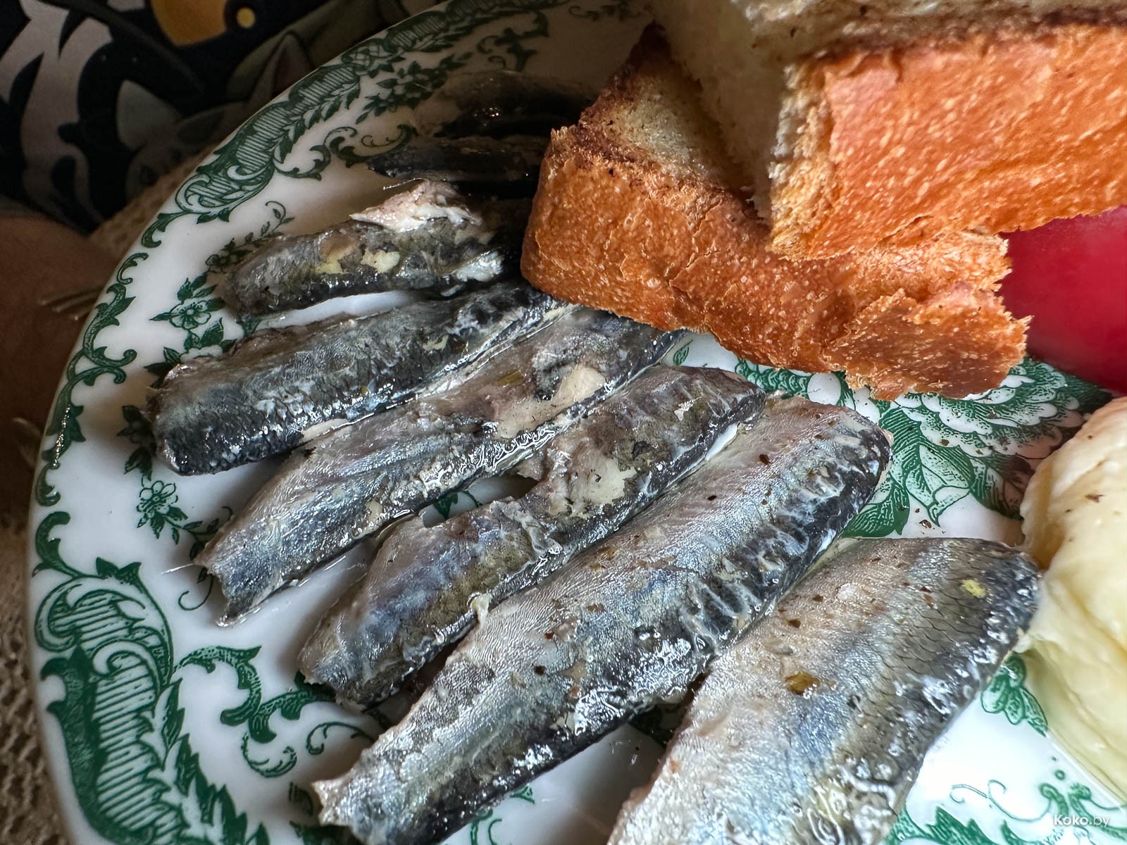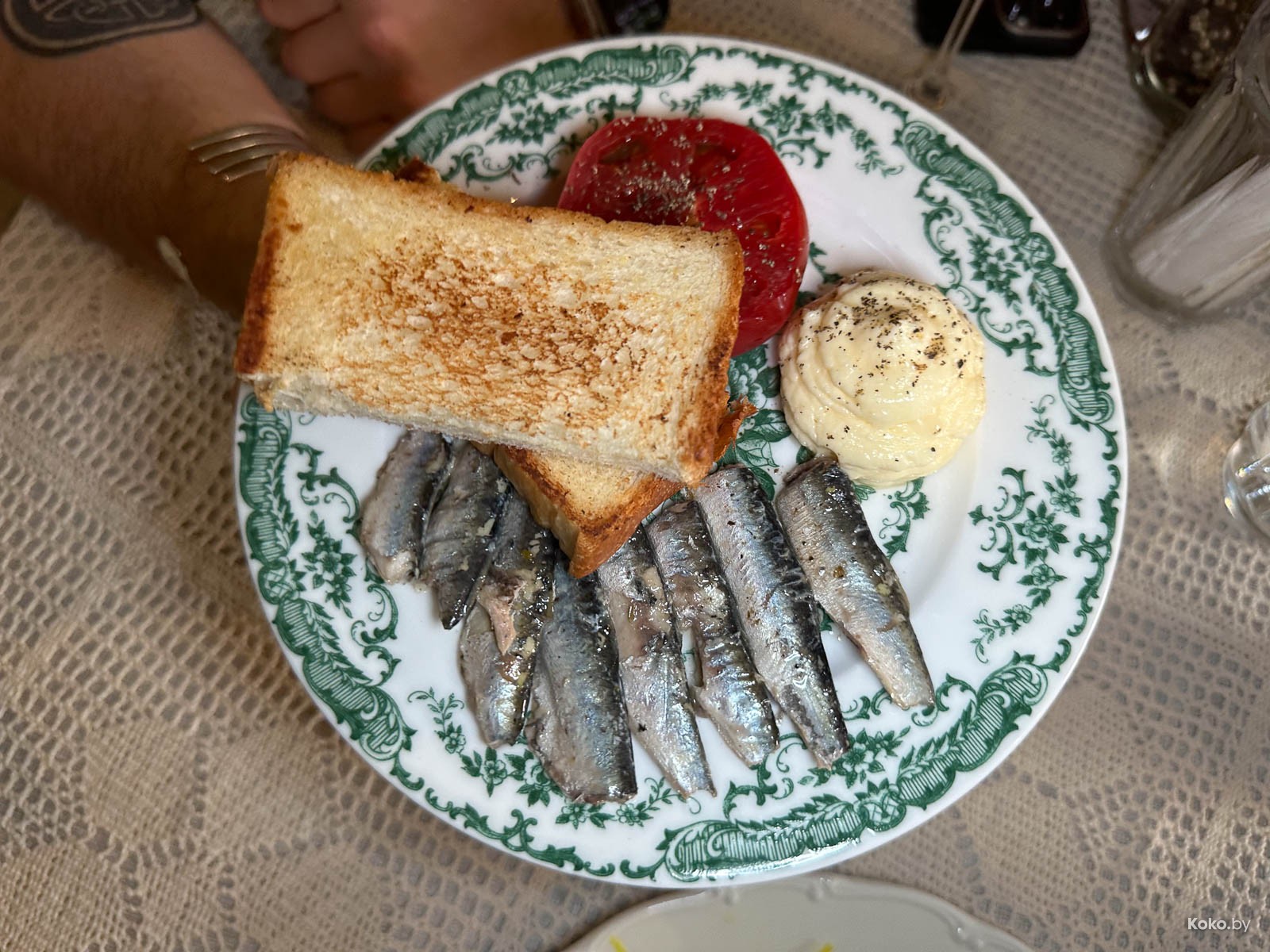 2. С 12:00 - по-большому: свои сардины не в солёном состоянии со взбитым сливочным маслом к сладкому хлебу и помидором без скальпа. За 16р, как любитель сельдевых - одобряю, почему-то пахнет шпротами.