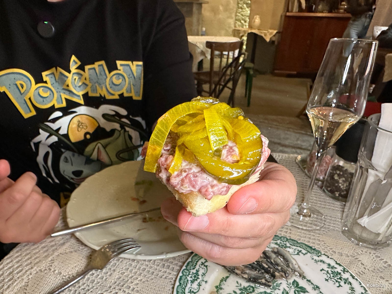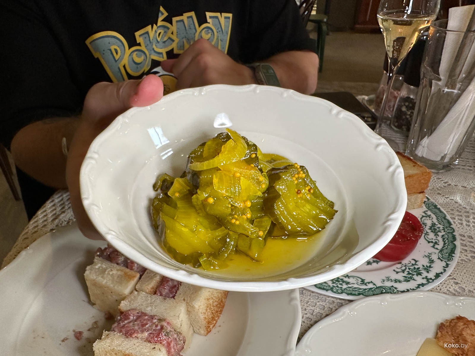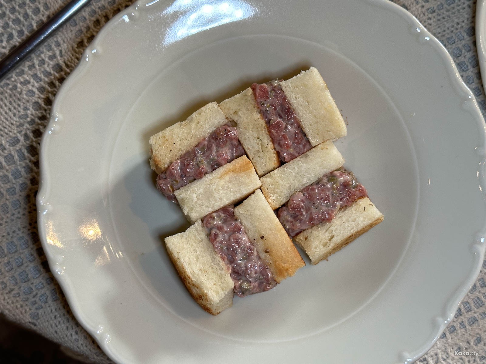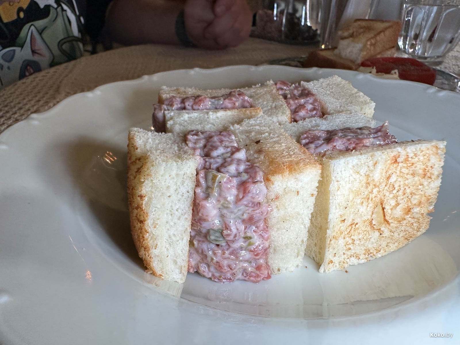 Честная порция ароматно заправленного мяса бычка в толстых кусках белого хлеба, это тартар за 20р. Супервкусно, особенно, если заменить верхний кусок булки пикульным сладким огурцом.