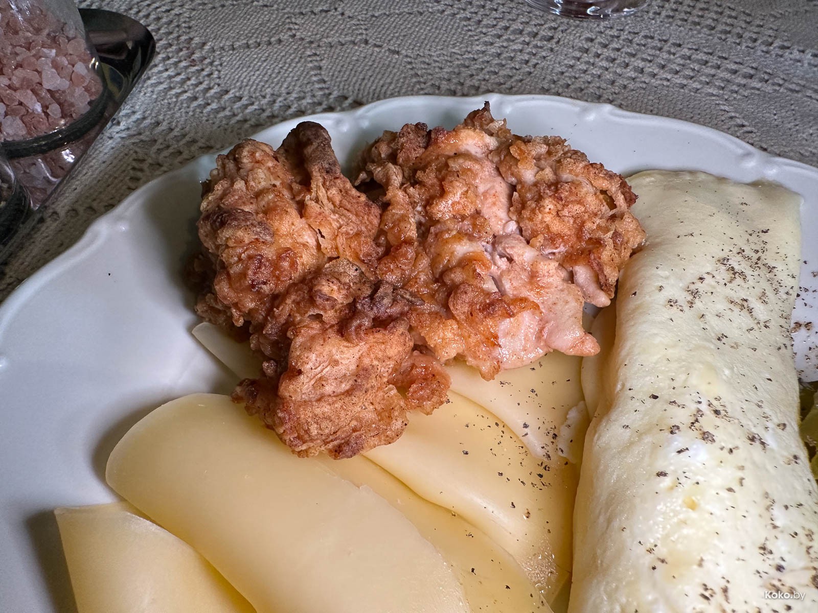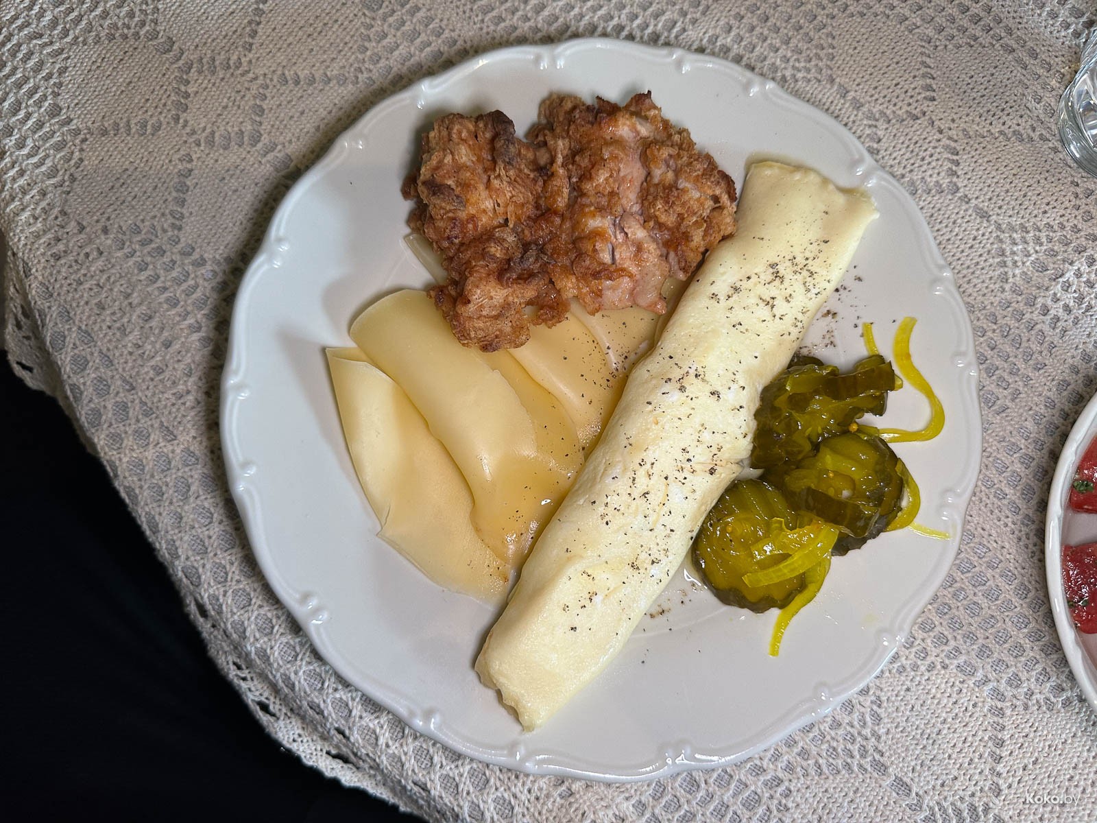 Омлет - огонь, салат - огонь, курица - как «KFC», маринованный в чём-то сладком хрустящий огурец на супергодно, сразу дозаказал три порции.