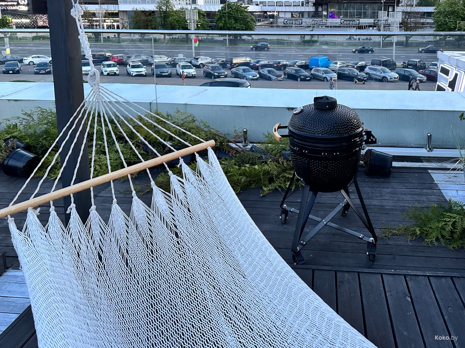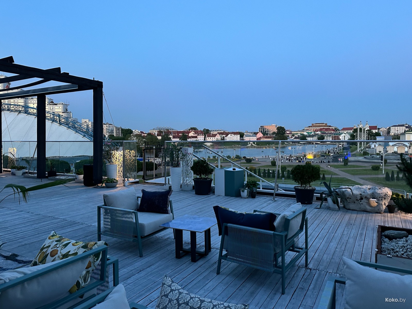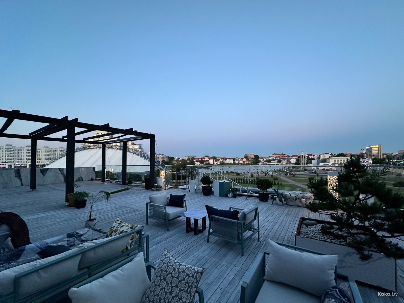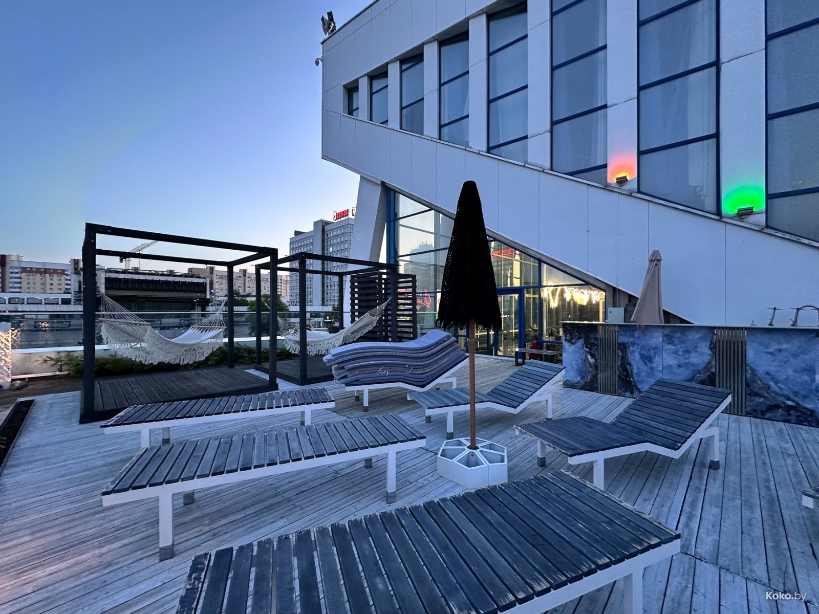 Пара остановок на автобусе, и мы находимся на втором этаже большой открытой террасы прямо на «Дворце Спорта». Расписание йоги в «Вайтпоинт» чекайте у них в телеграм, пишут, что с 07:00, ссылку прикрепил, а мы заценим вечерний лаунж. Сразу после физкультуры с 09:00 выносят шезлонги по 20р за час, каждый последующий по 10р, дешевле на природу выехать. По еде неизвестно, но можно купить в магазине стейки и арендовать их гриль прямо на террасе.