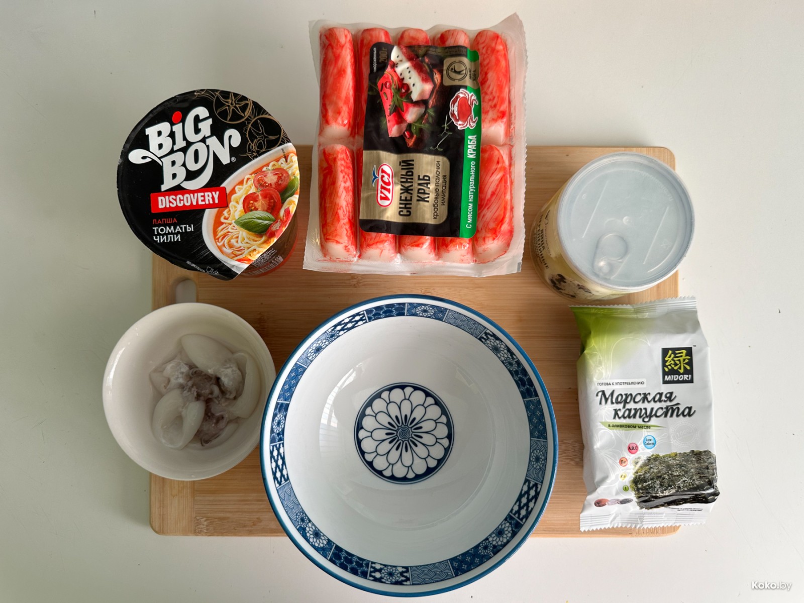 Переливаем бульон в глубокую миску, рандомно добавляем все ингредиенты. Вкуснее, дешевле, и это реально королевский бичпакет!