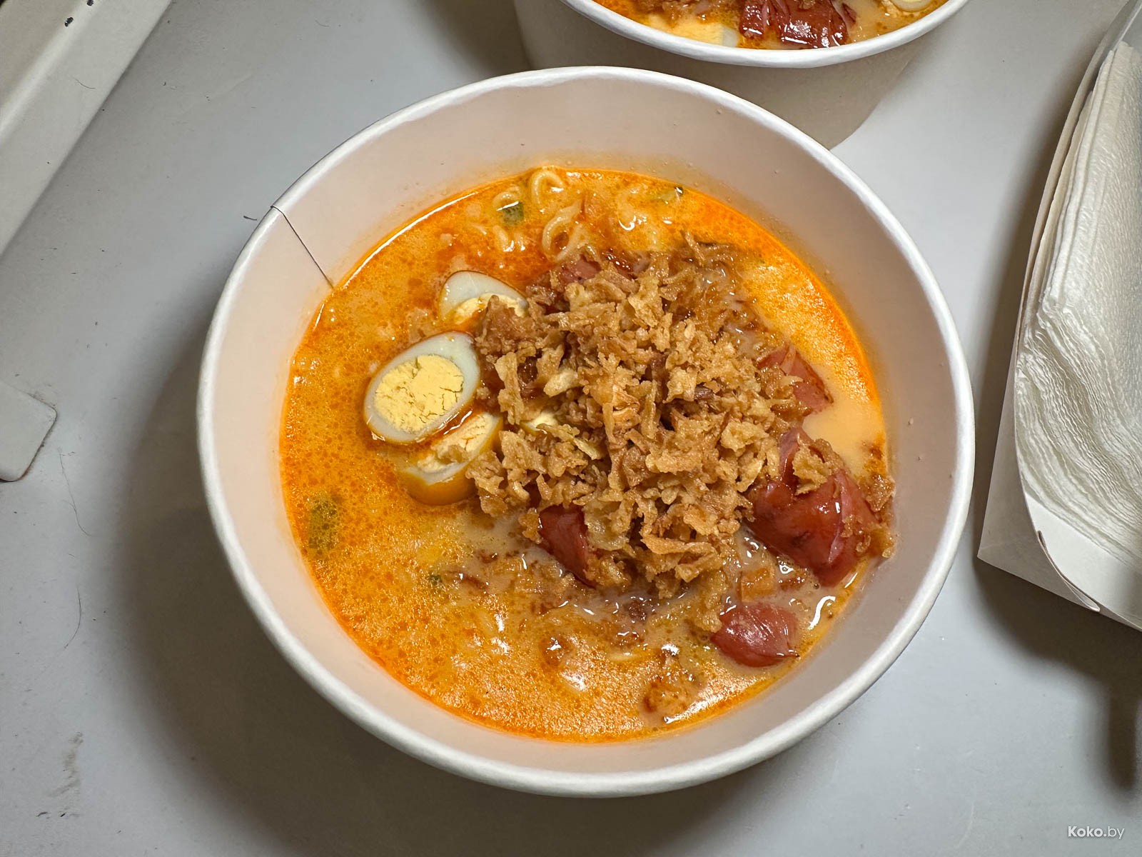 В бумажной миске за 12р и 18р королевская порция дошика, состоящая из: вермишели из пачки, бульона со специями и крем-чизом, жареной на гриле колбаски из пачки, копчёных перепелиных яиц из банки и луковых чипсов из пачки. Собрали всё в единое целое минут за восемь.