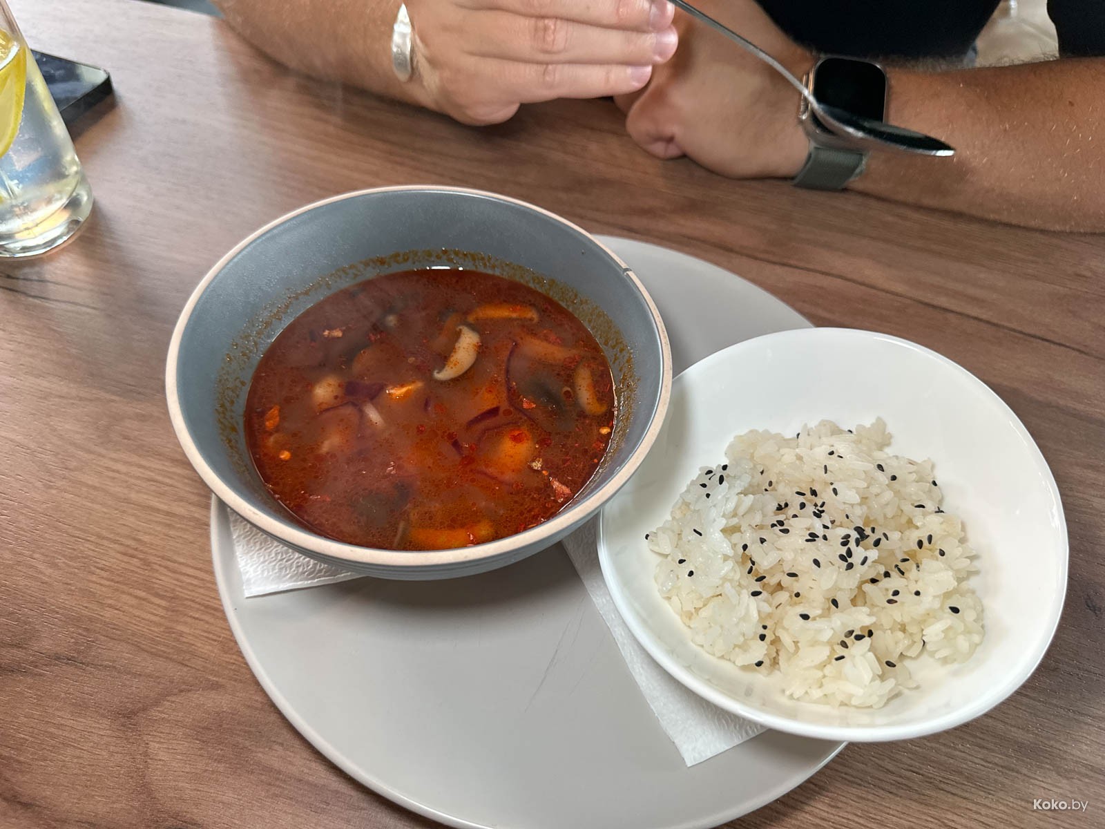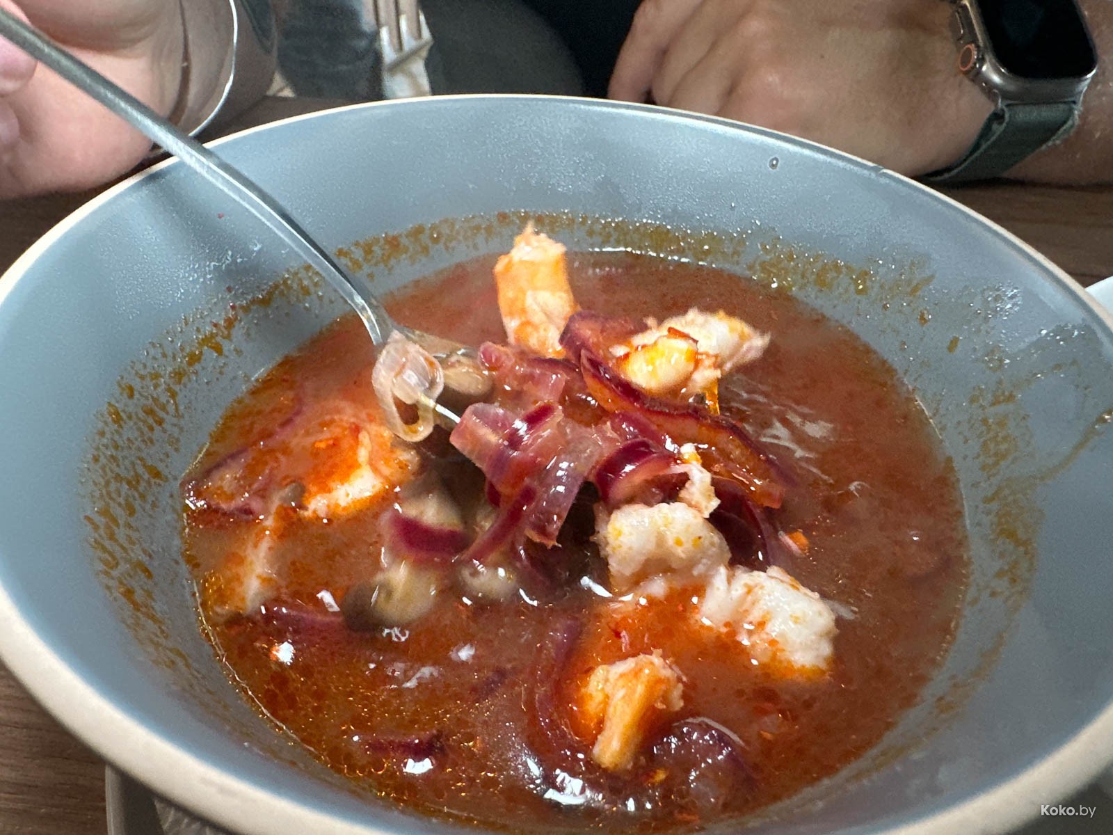 2. Вот это приколисты, они в тайский суп по-заславски настругали красный лук, по ощущениям, так ещё и жареный. У Том Яма случился привкус сковородки после жареной картошки, а вид маминого борща.