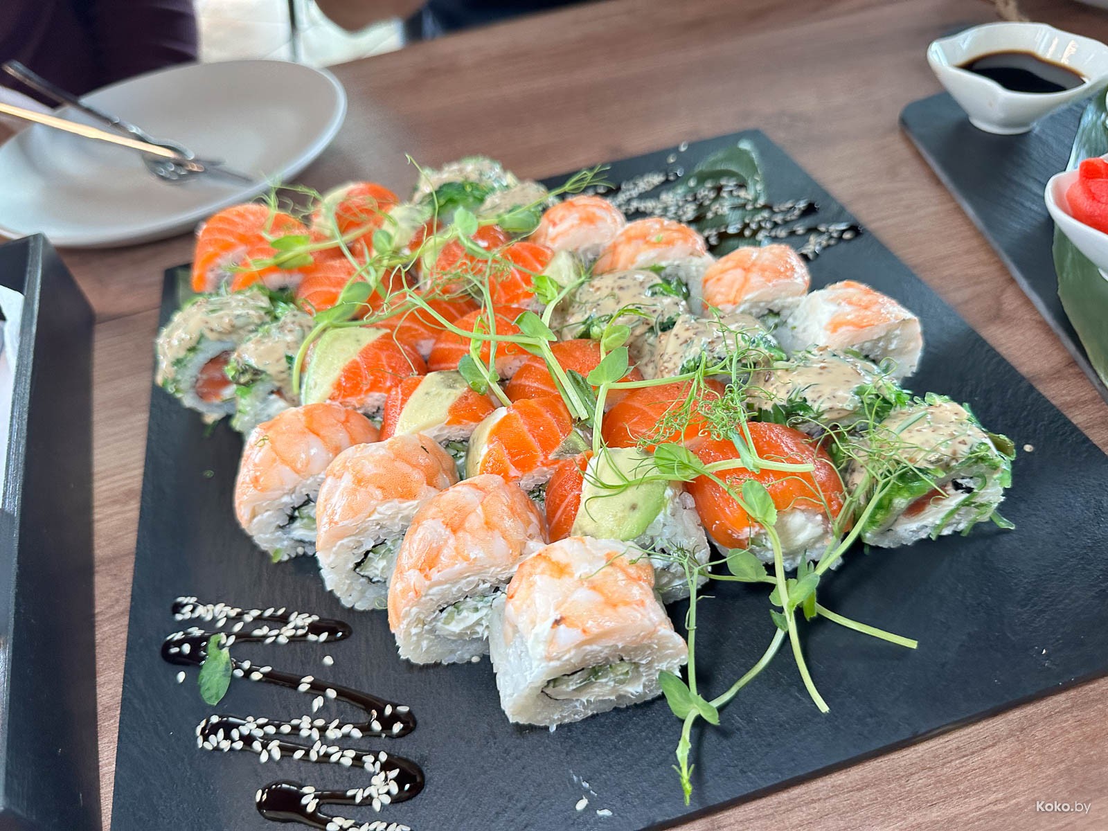 1. Четыре полноценных ролла выглядят бодро, по цвету лосося могу с уверенностью сказать, что маринуют сами. Мелкие роллы размером с кошачью лапку скручены хорошо, рис свежий, начинки в меру, на креветки не хватило икры летучей рыбы положить. Закончилась?