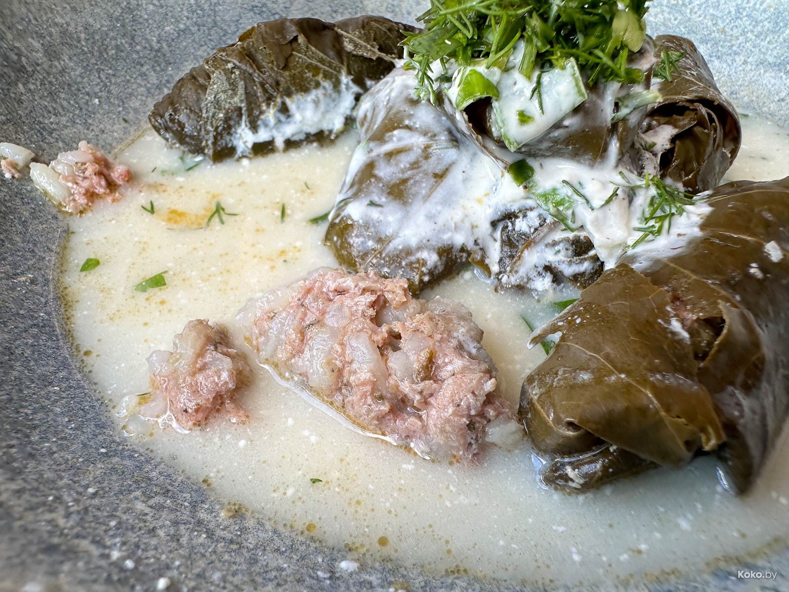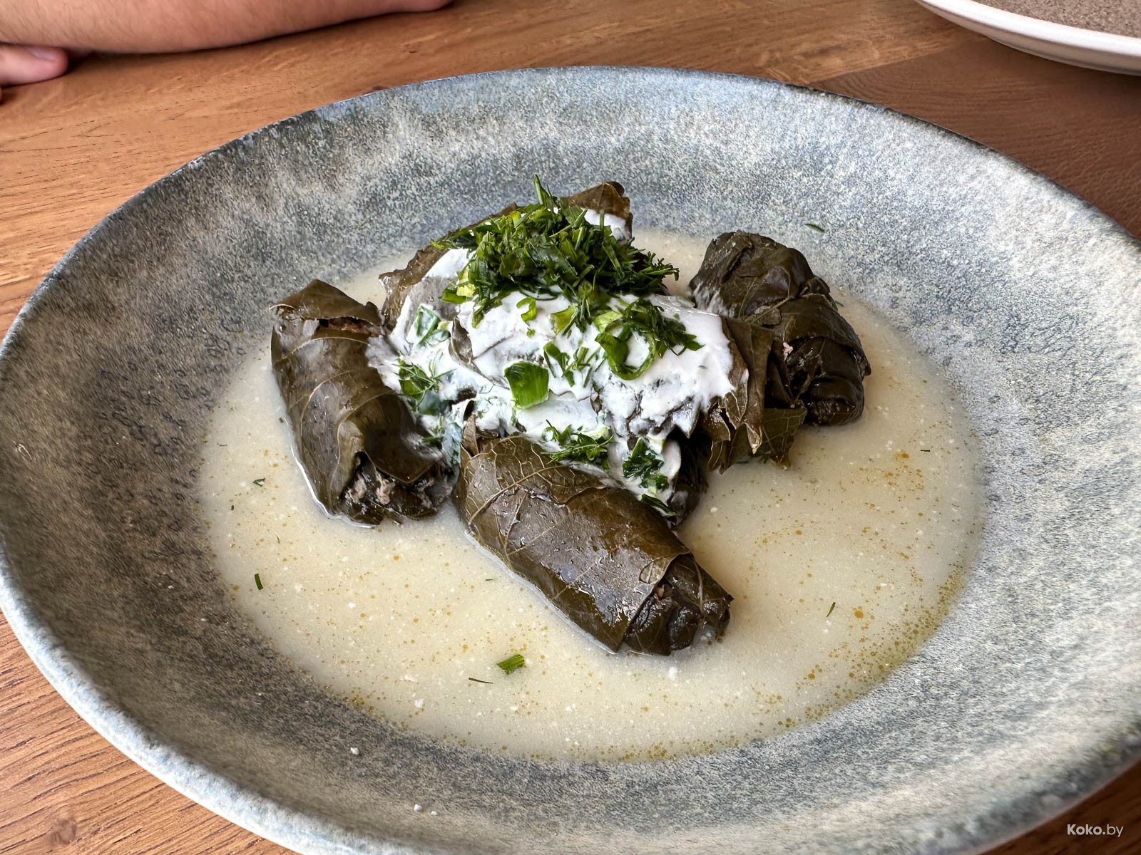 3. Армянские мини-голубцы в виноградных листьях за 20р подают в кисломолочном бульоне. Вкусно, но сметану эстетичней отдельно в соусницу, а не буслиной кляксой сверху долмы. Сочно, годно!
