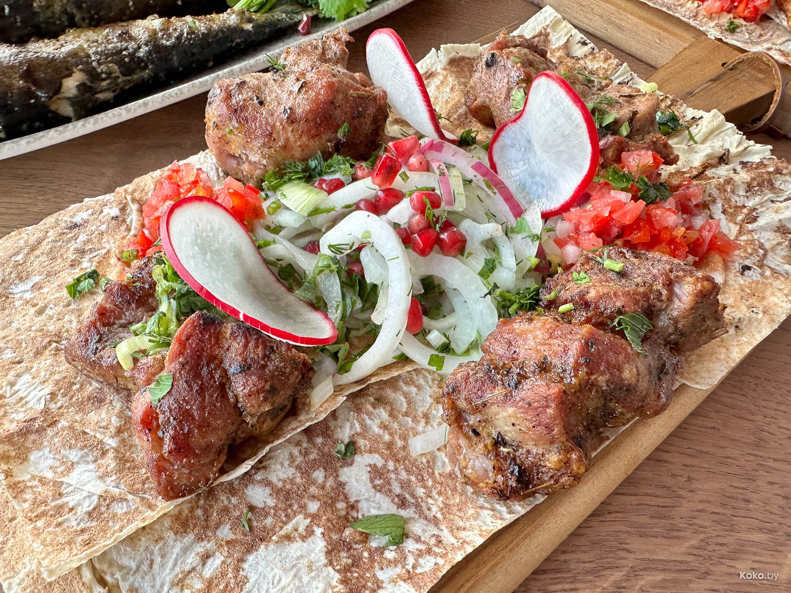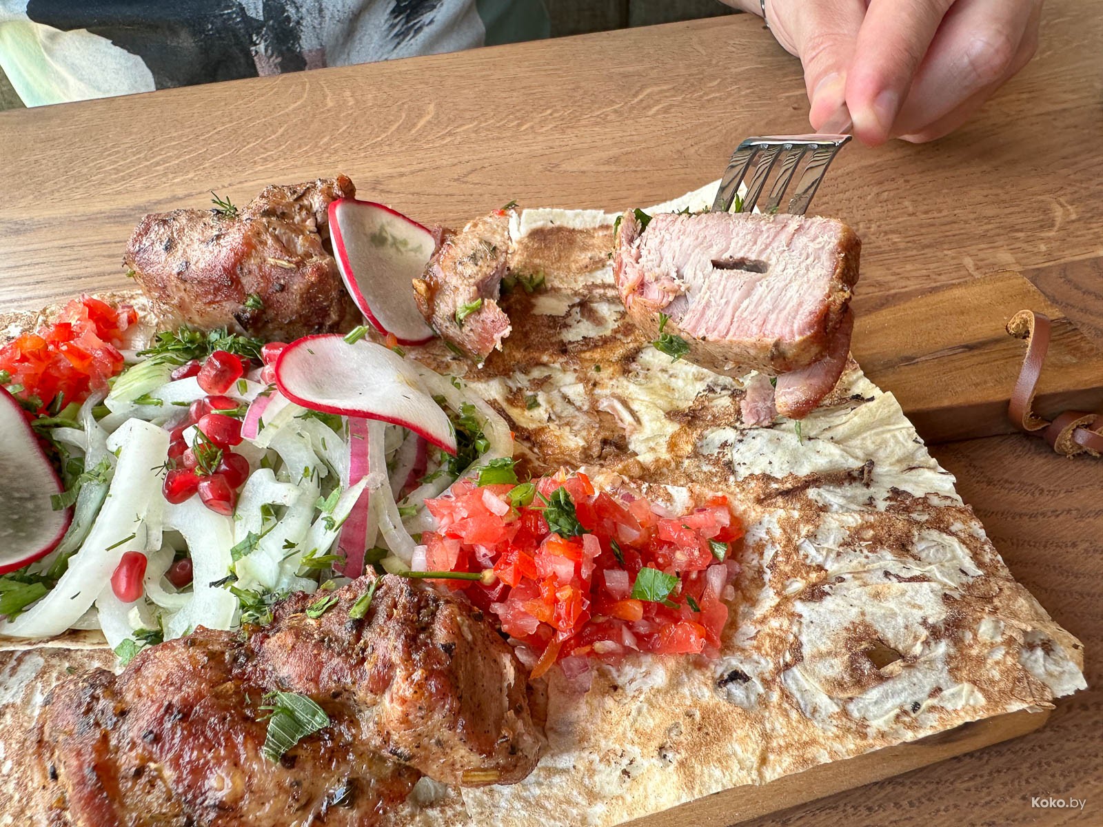 Доска кебабов с мангала в «Гостях», цену не помню, но это топище.