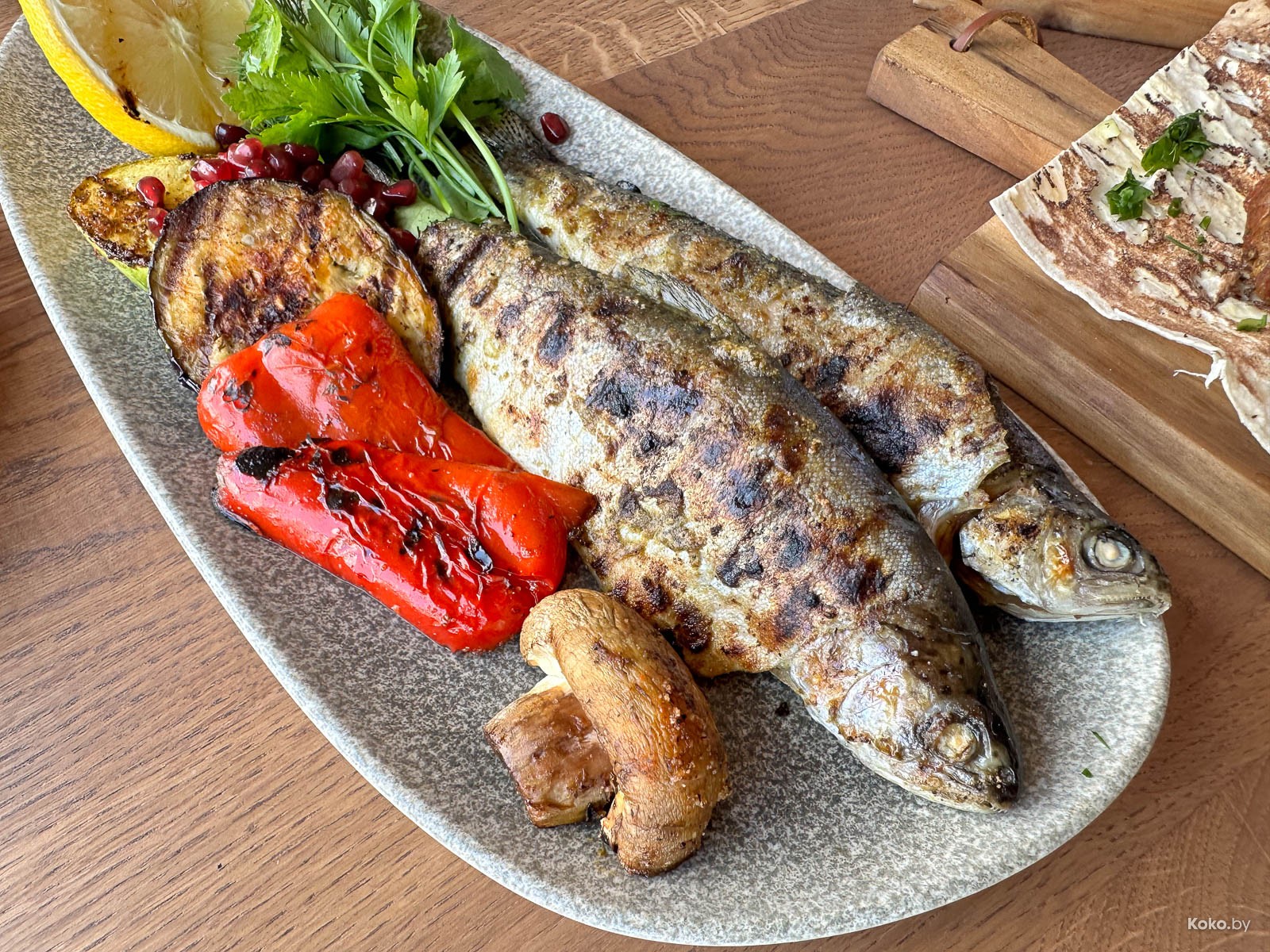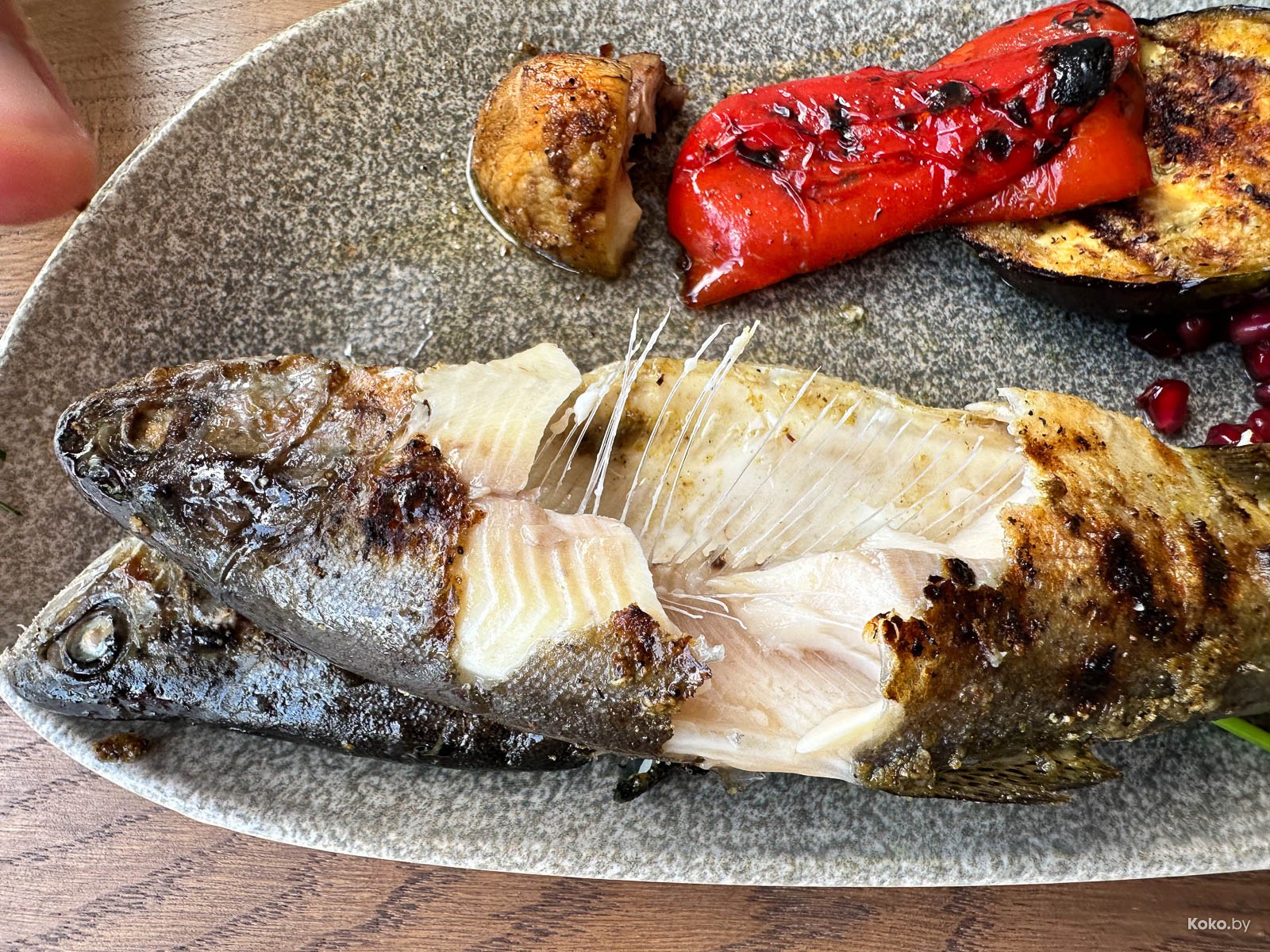 6. Две форели в овощах на гриле за 35р сбрызнули соком лимона, и в добрый путь ушла она. Выход для тех, у кого свинина харам, или на ПП.