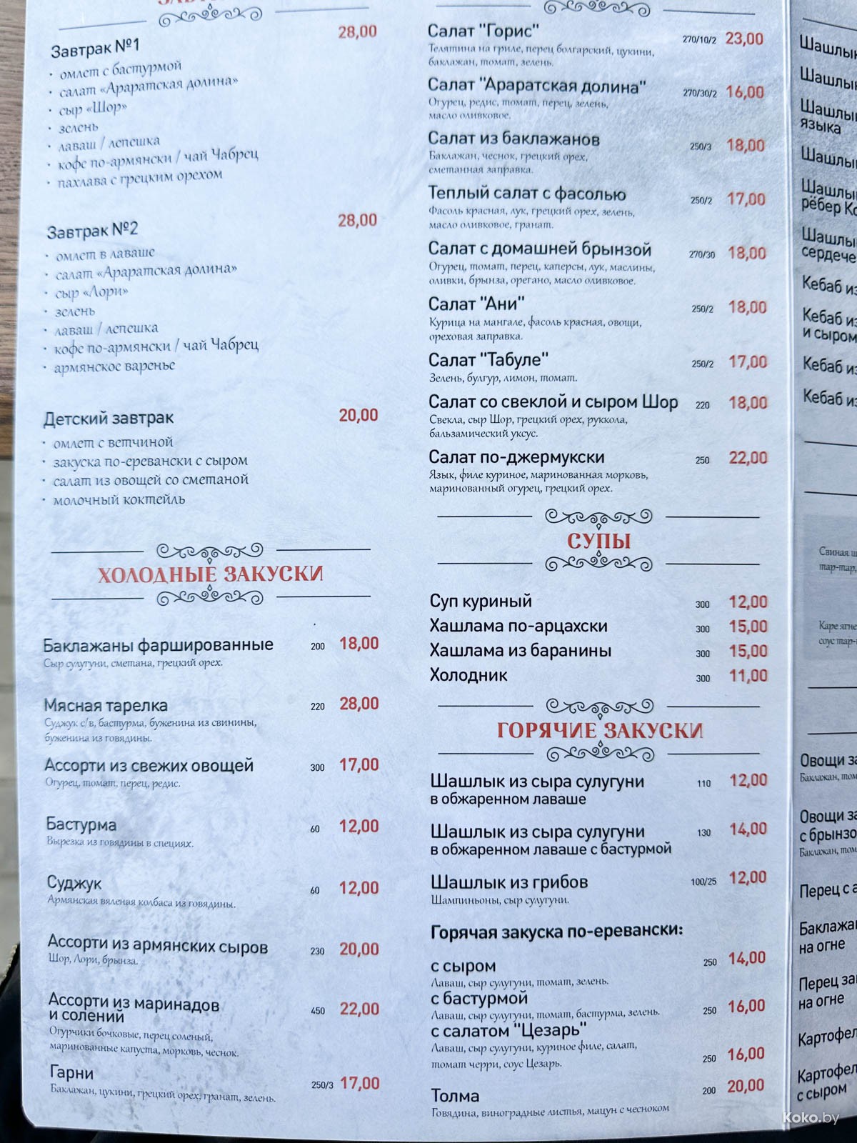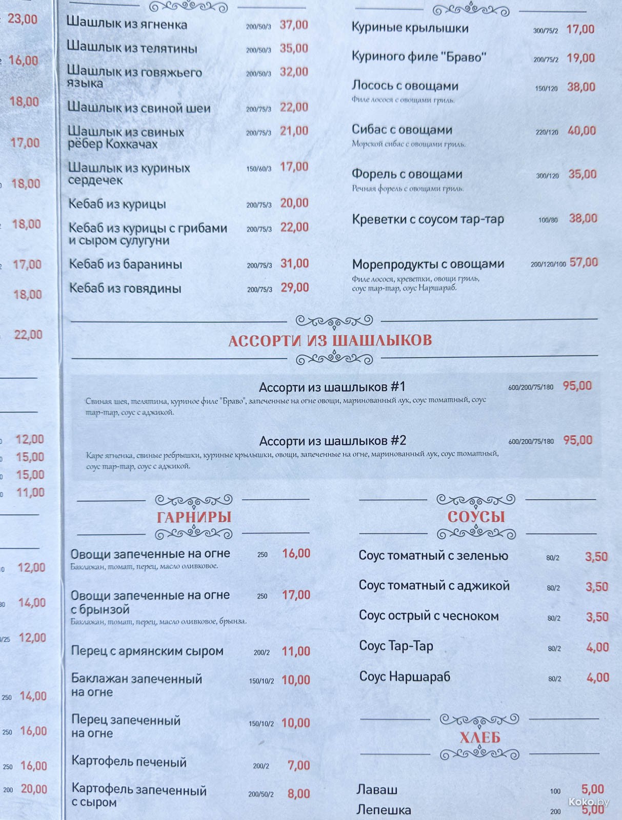 Закуски, салаты, супы и всё остальное на мангале по обычным ценам.