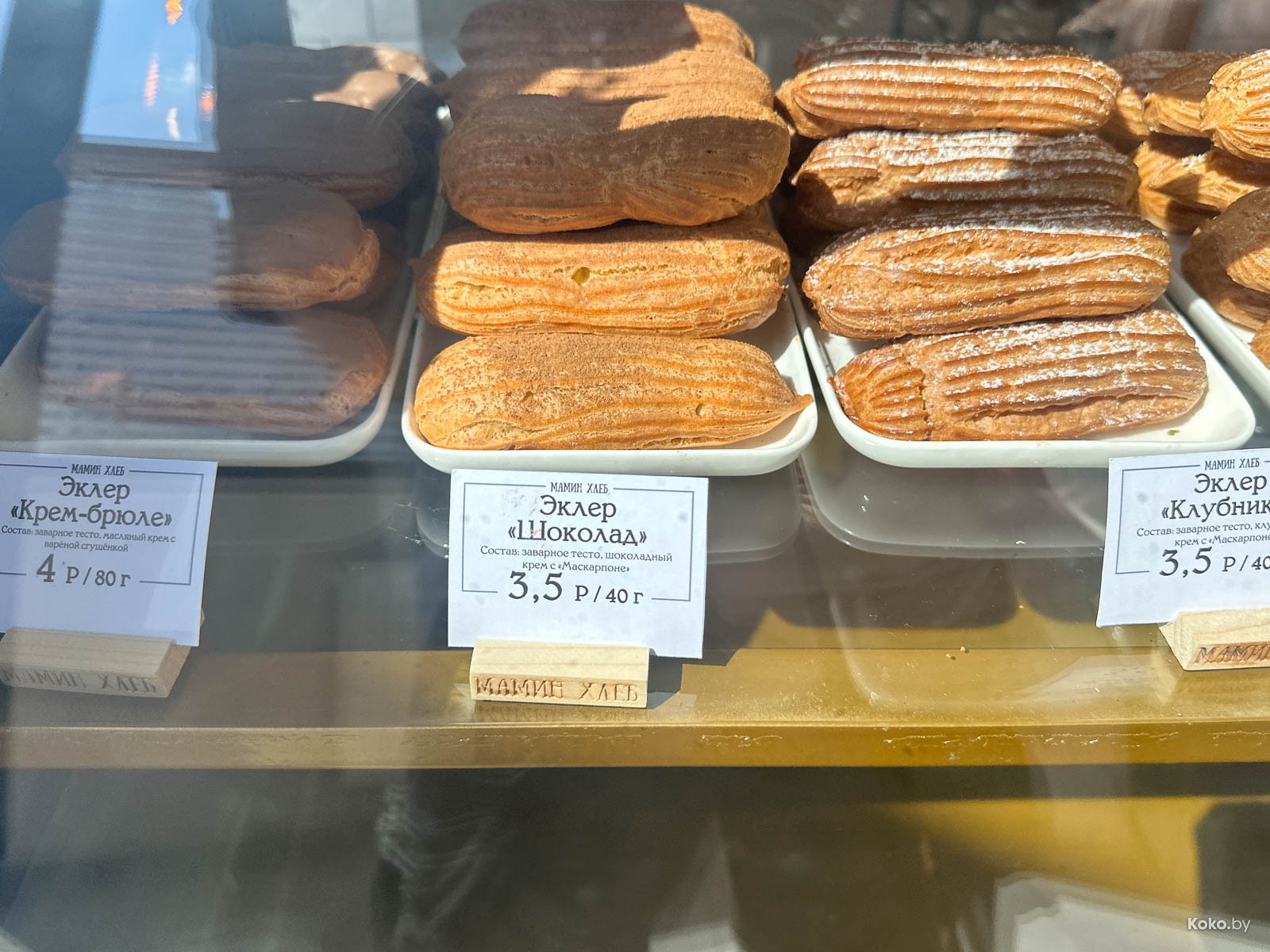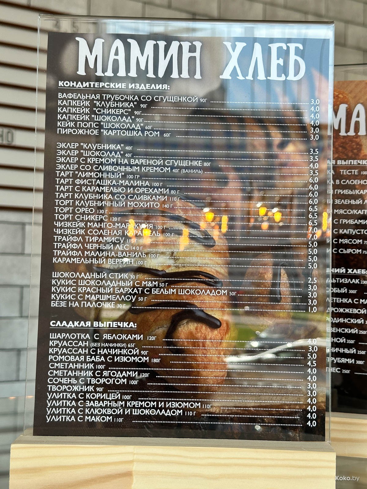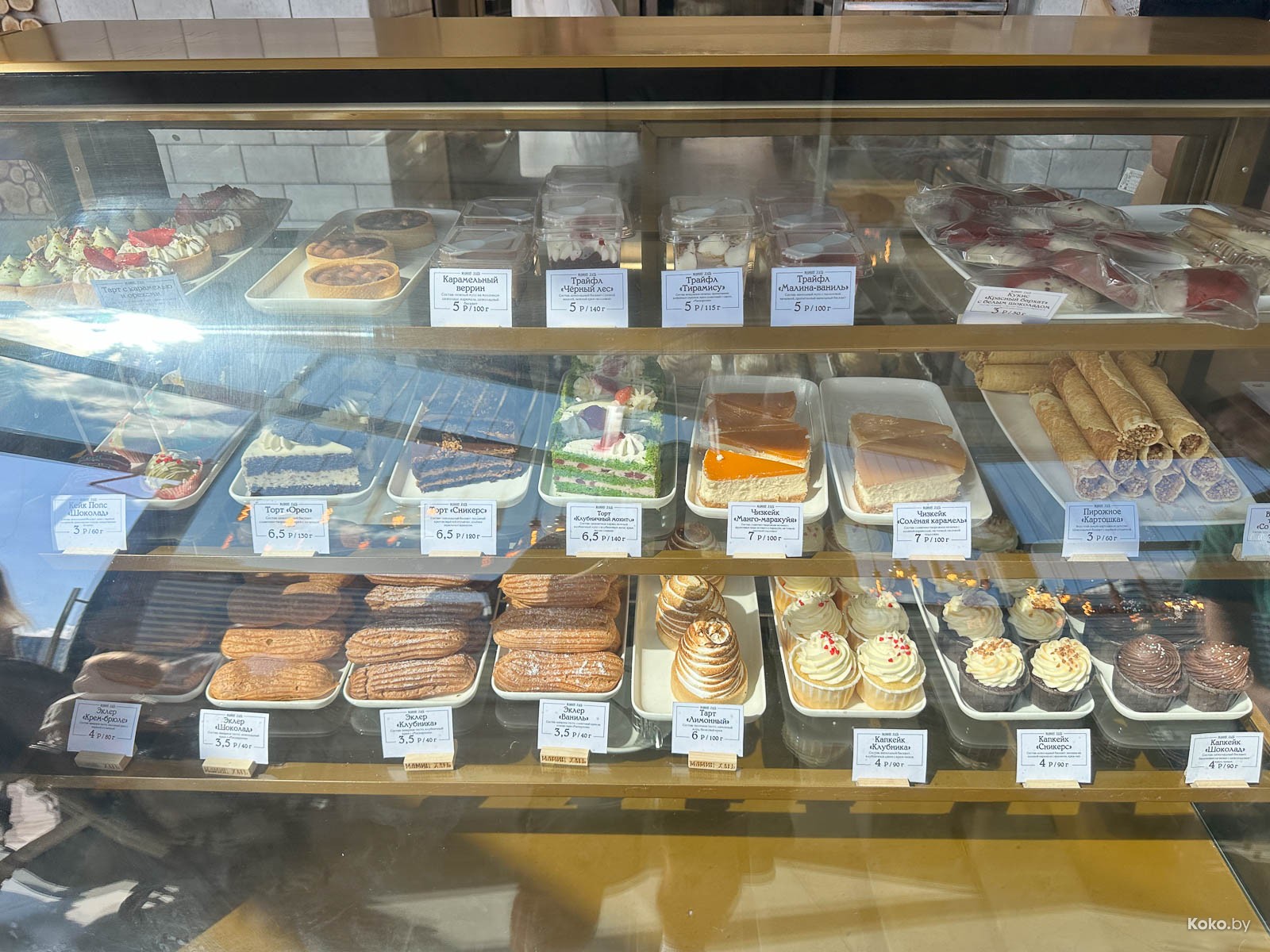 Всякое сладкое от 3,5р за эклер до 7р за кусок торта на выбор.