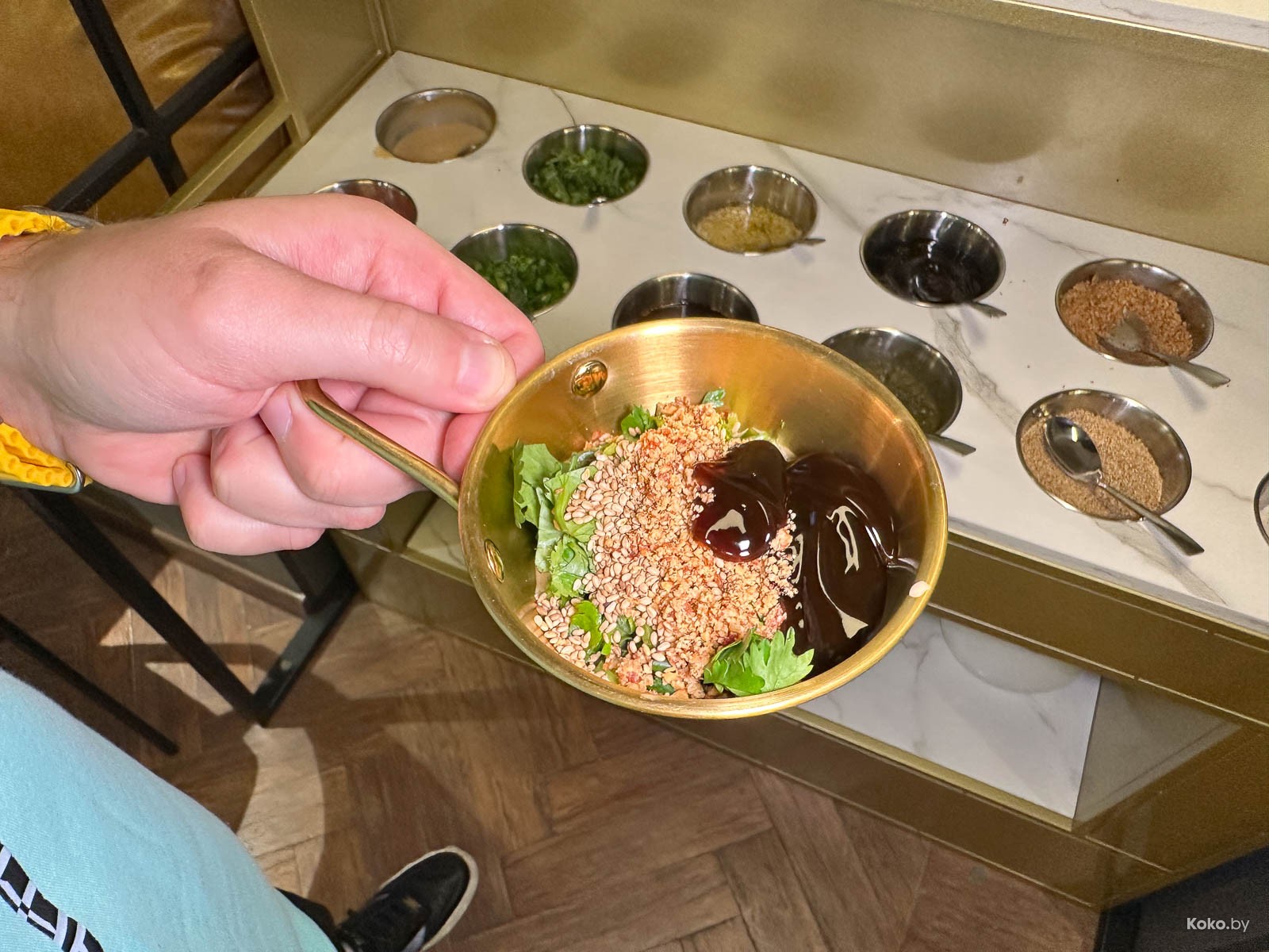 СОВЕТУЮ: ореховый соус, кинза, зелёный лук, сладкий густой соус унаги и семена кунжута. Соевый соус с чесноком и кинзой - для мяса.
