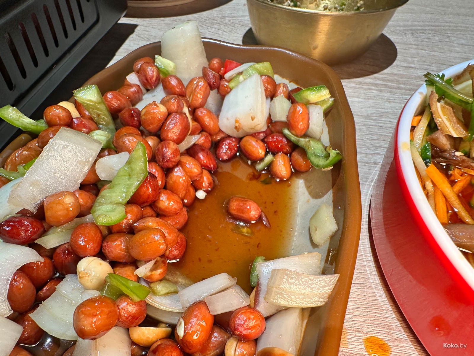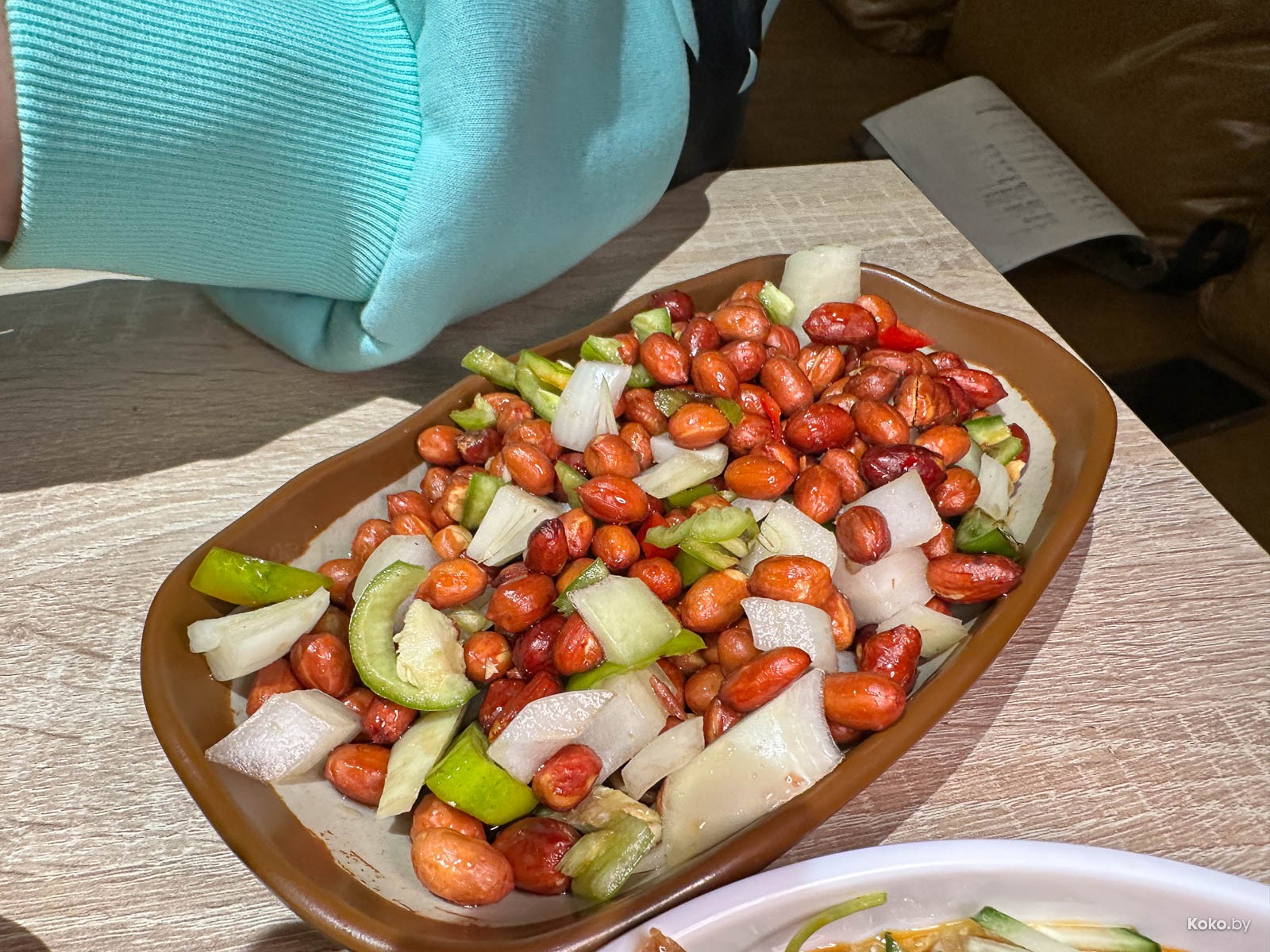 Жареный арахис вперемешку со свежим душистым луком и острым перцем, облитый сладко-липким соусом, напоминающим мёд с соевым соусом и каплей мягкого яблочного уксуса. Вкусно до безобразия.