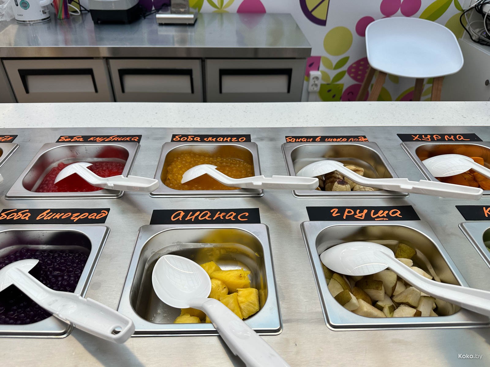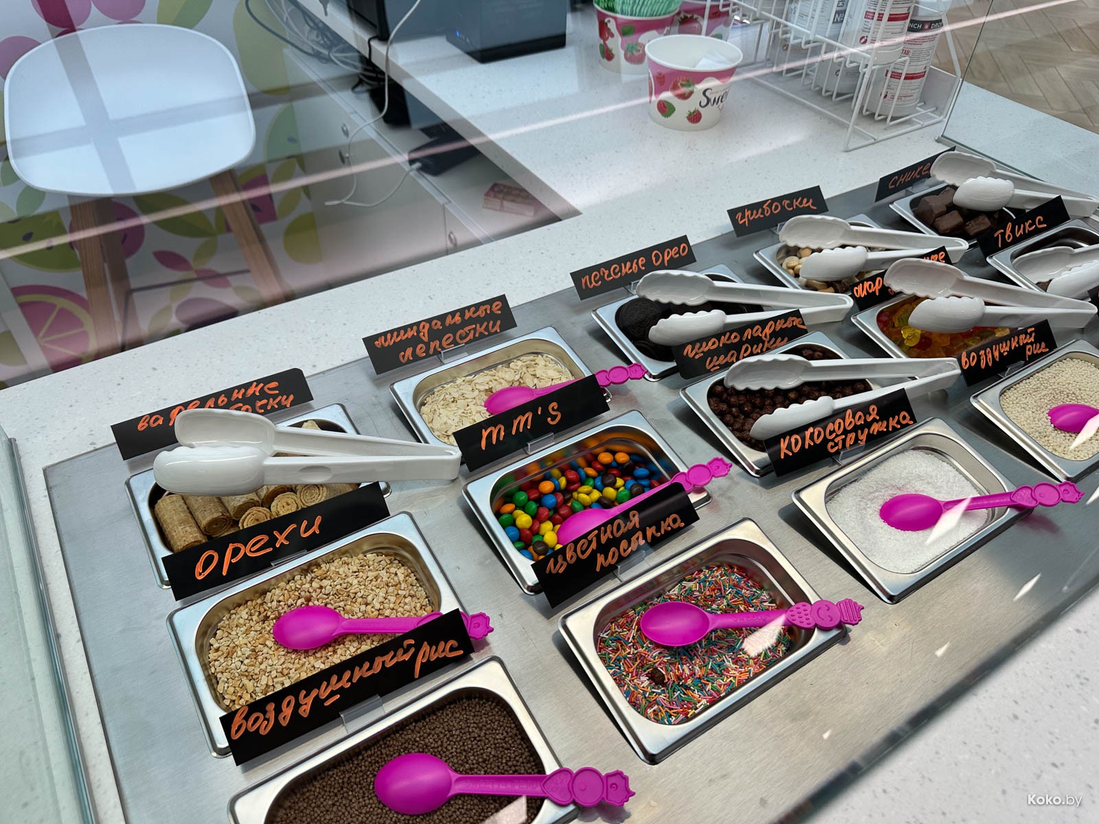 От эмоций к делу, берём бумажное ведро, на выбор 4 йогурта с разными вкусами и чёрое, после с десяток разных топпингов. Платить придётся за общий вес, поэтому нафиг куски банана, ананаса и прочей тяжести.
