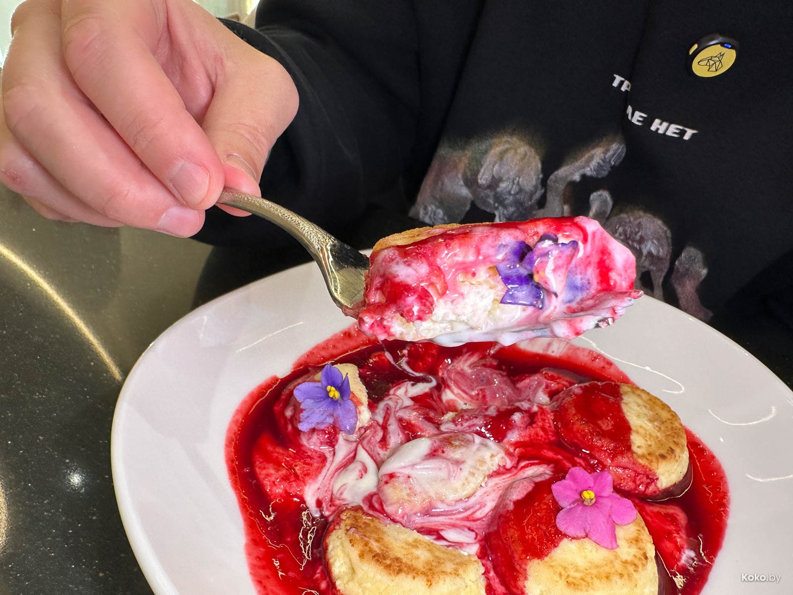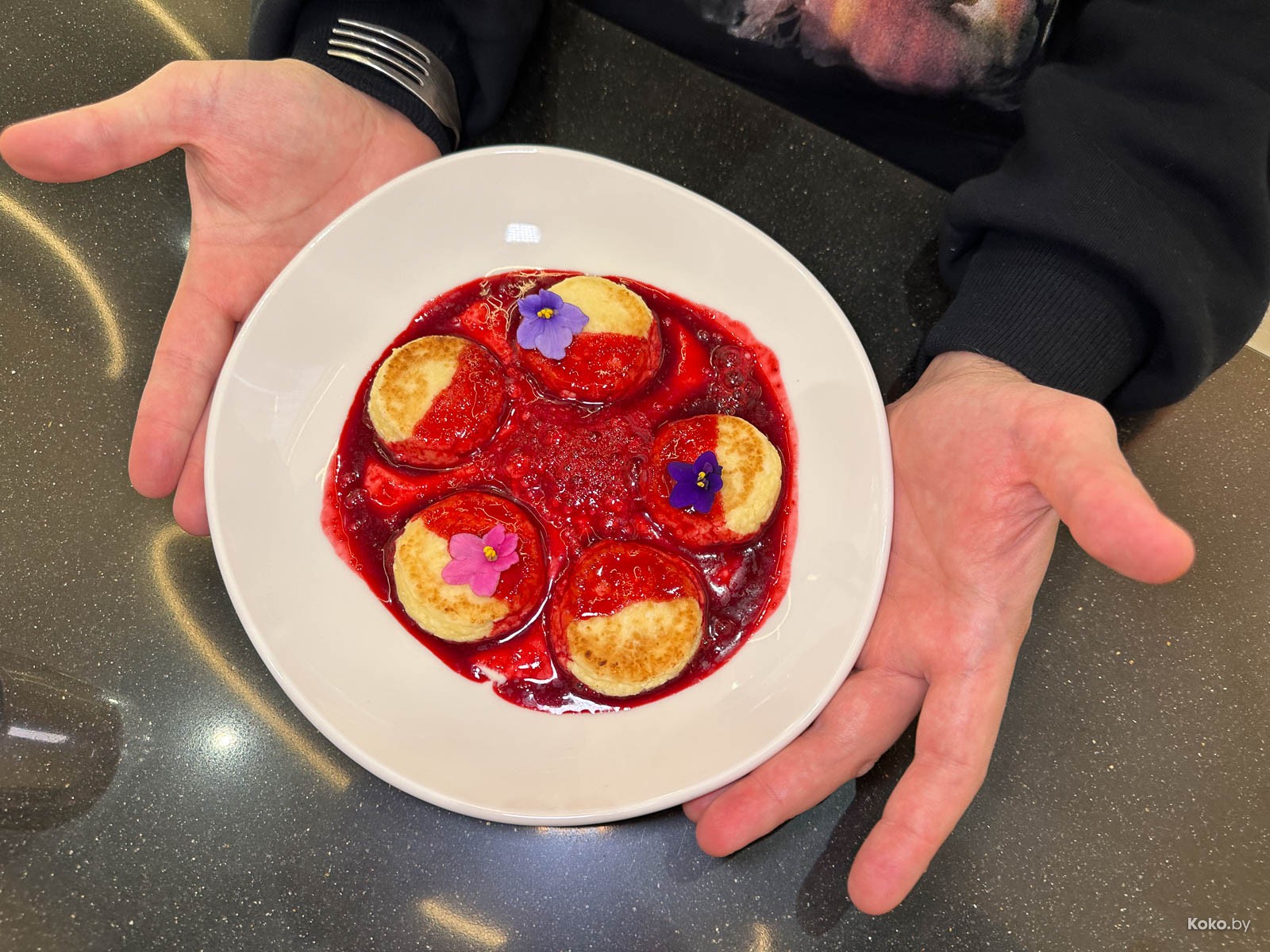 Пять сырников на заварном креме с бешеной пеной из малины. У вас там на кухне моя бабушка?! Отпустите, я заплачу эти 14р.