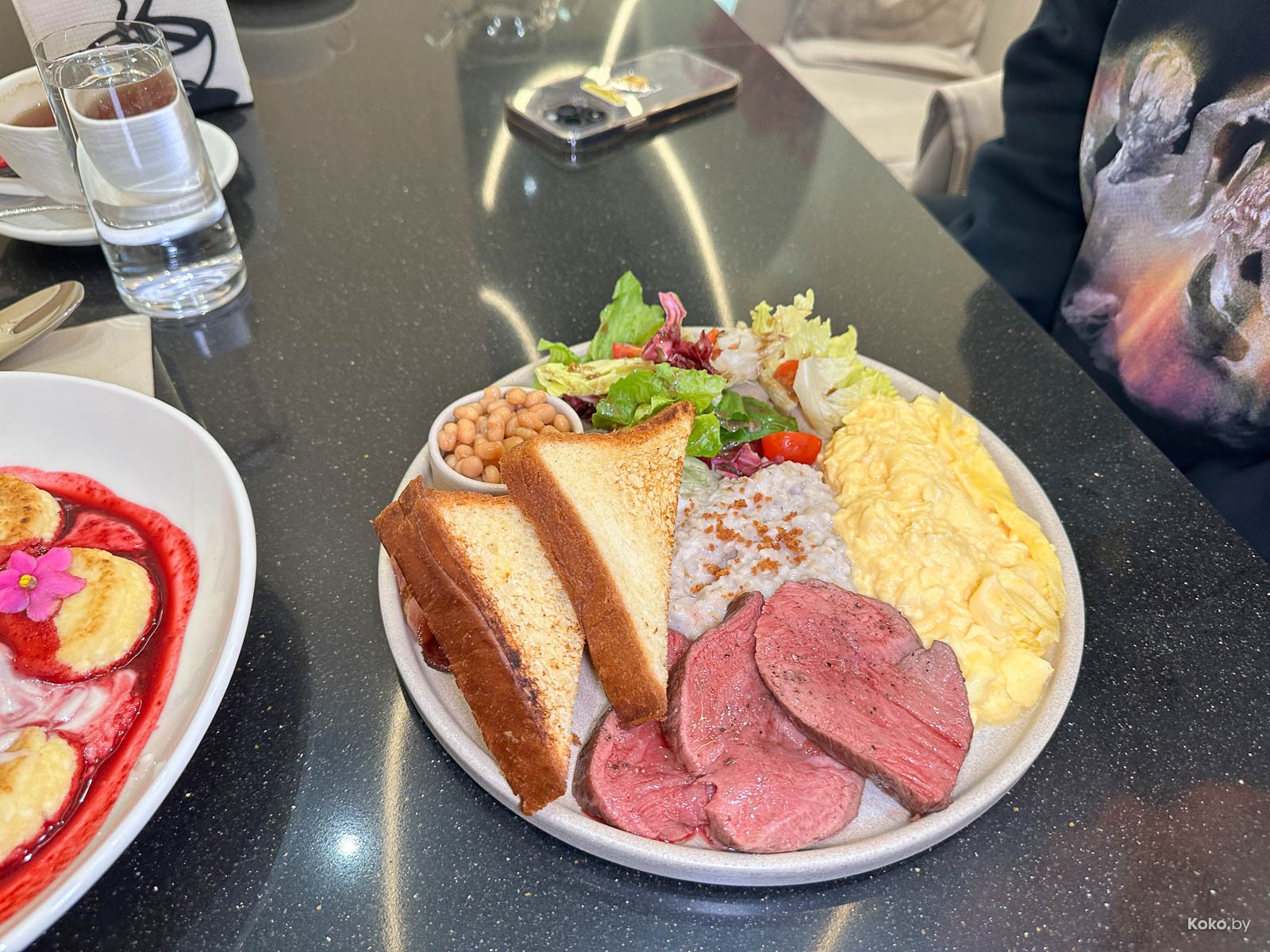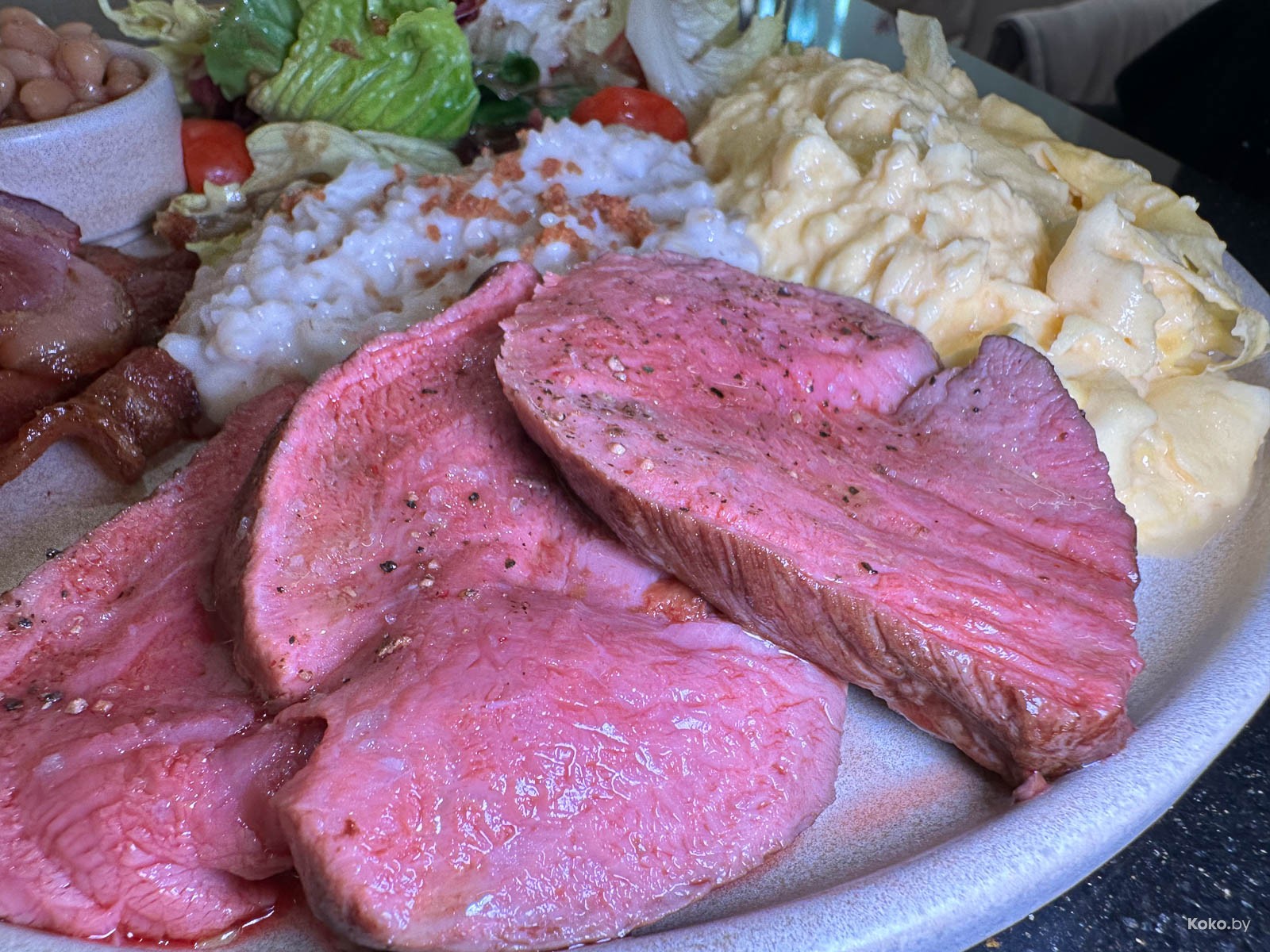 В большом наборе продуктов за 27р с нарезанным стейком стоит уточнять прожарку, не каждый на завтрак к такому готов. Вкусно.