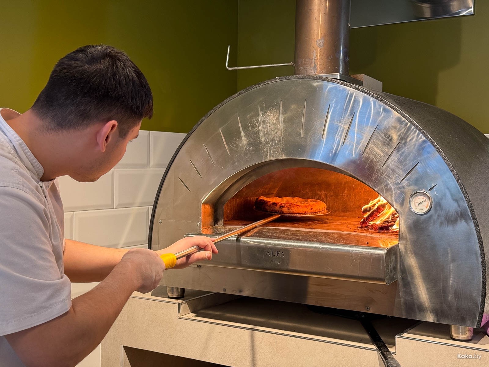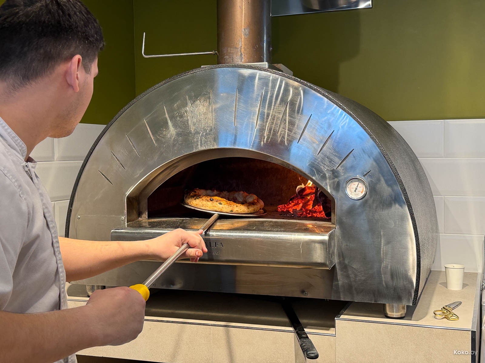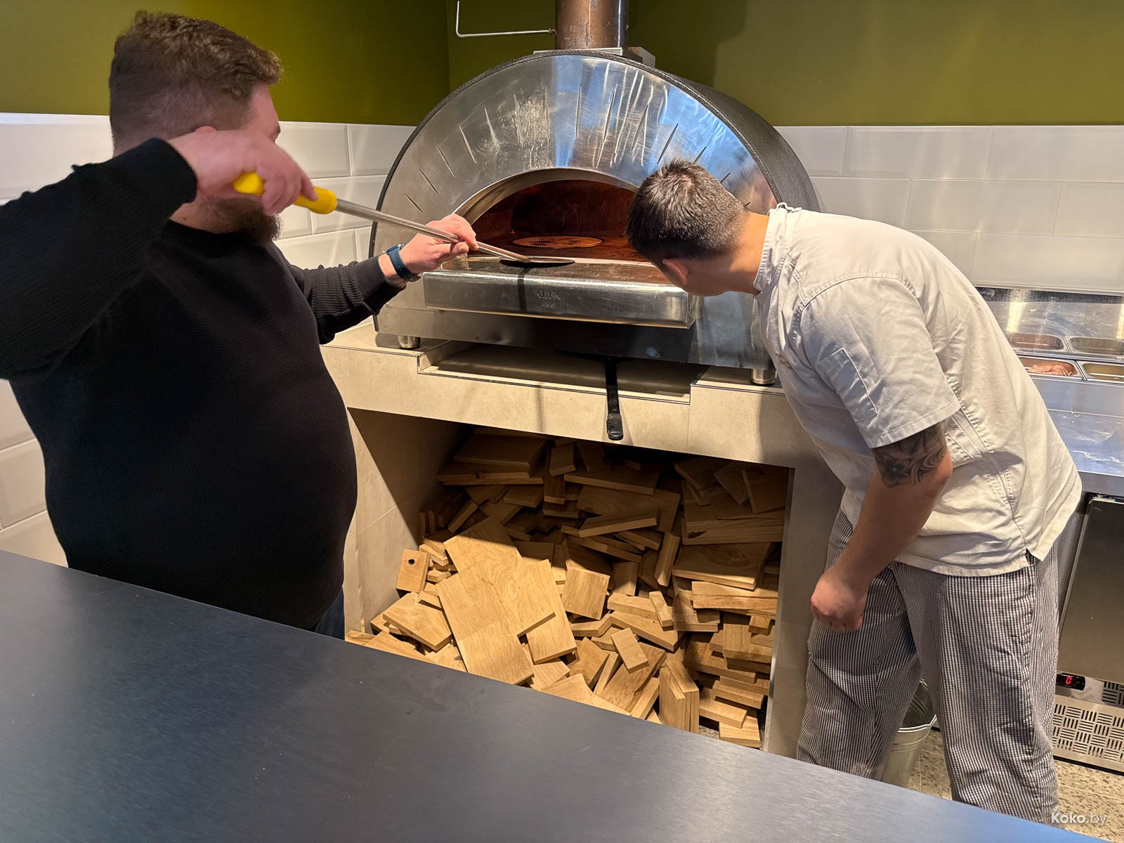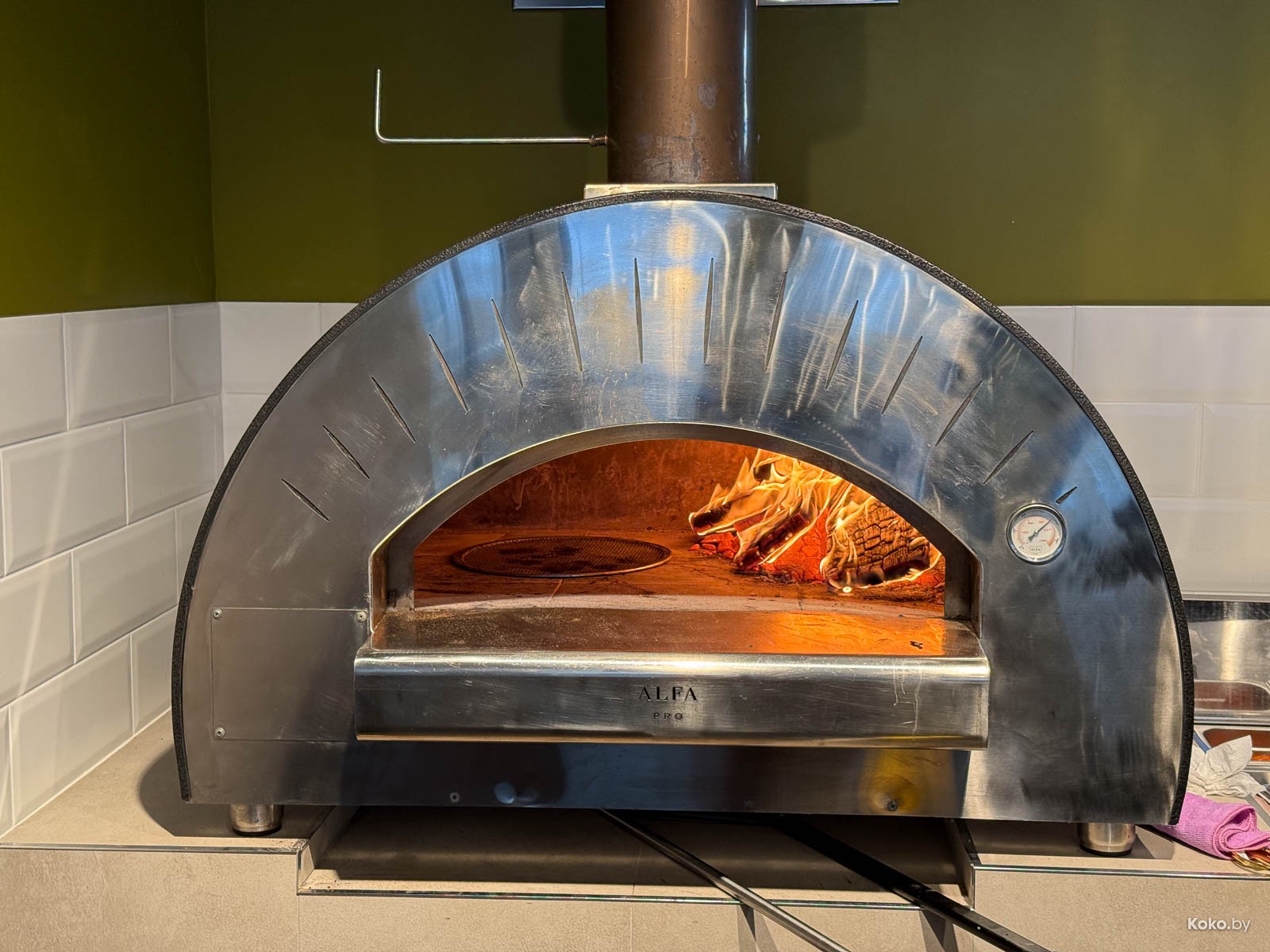 Судя по слабому жару печи и выражению лиц персонала, мы сегодня первые жертвы. Подкинули дубовых дров, и жар пошёл, в такой печи пицца становится готовой через пару минут, примерно 1,40 минут.
