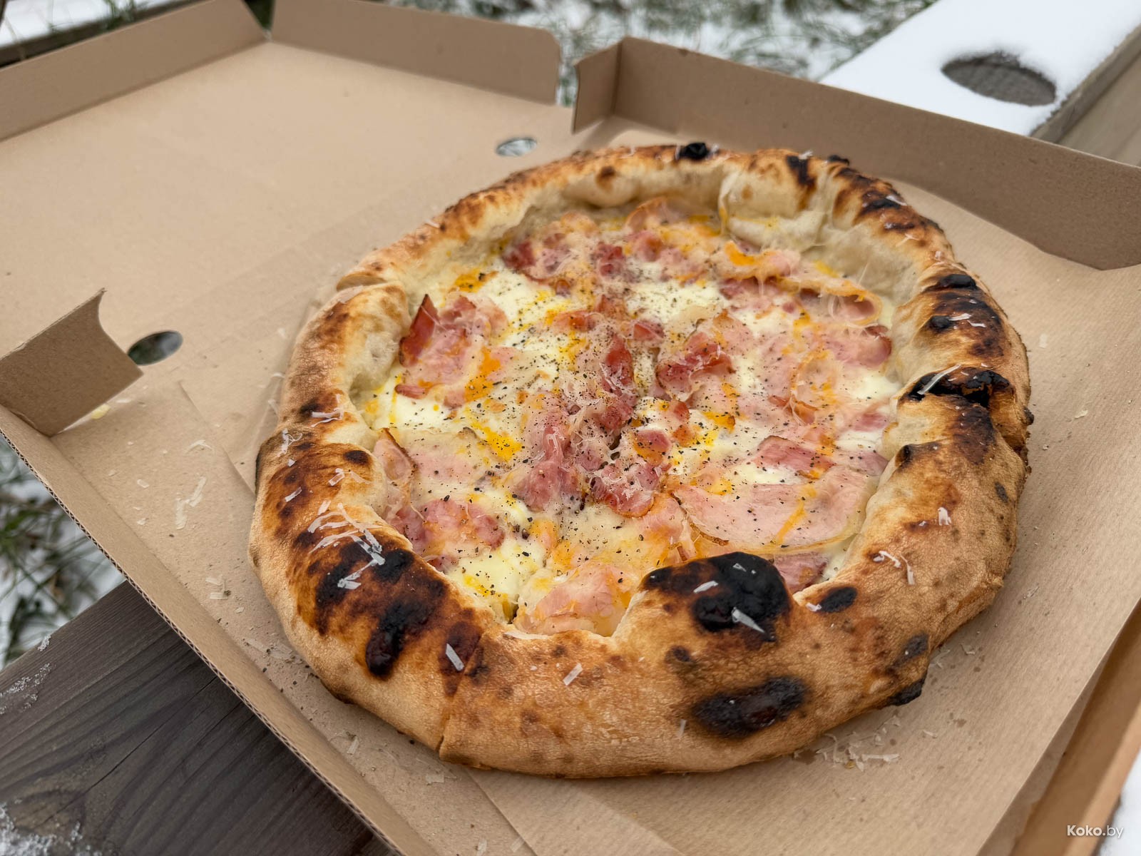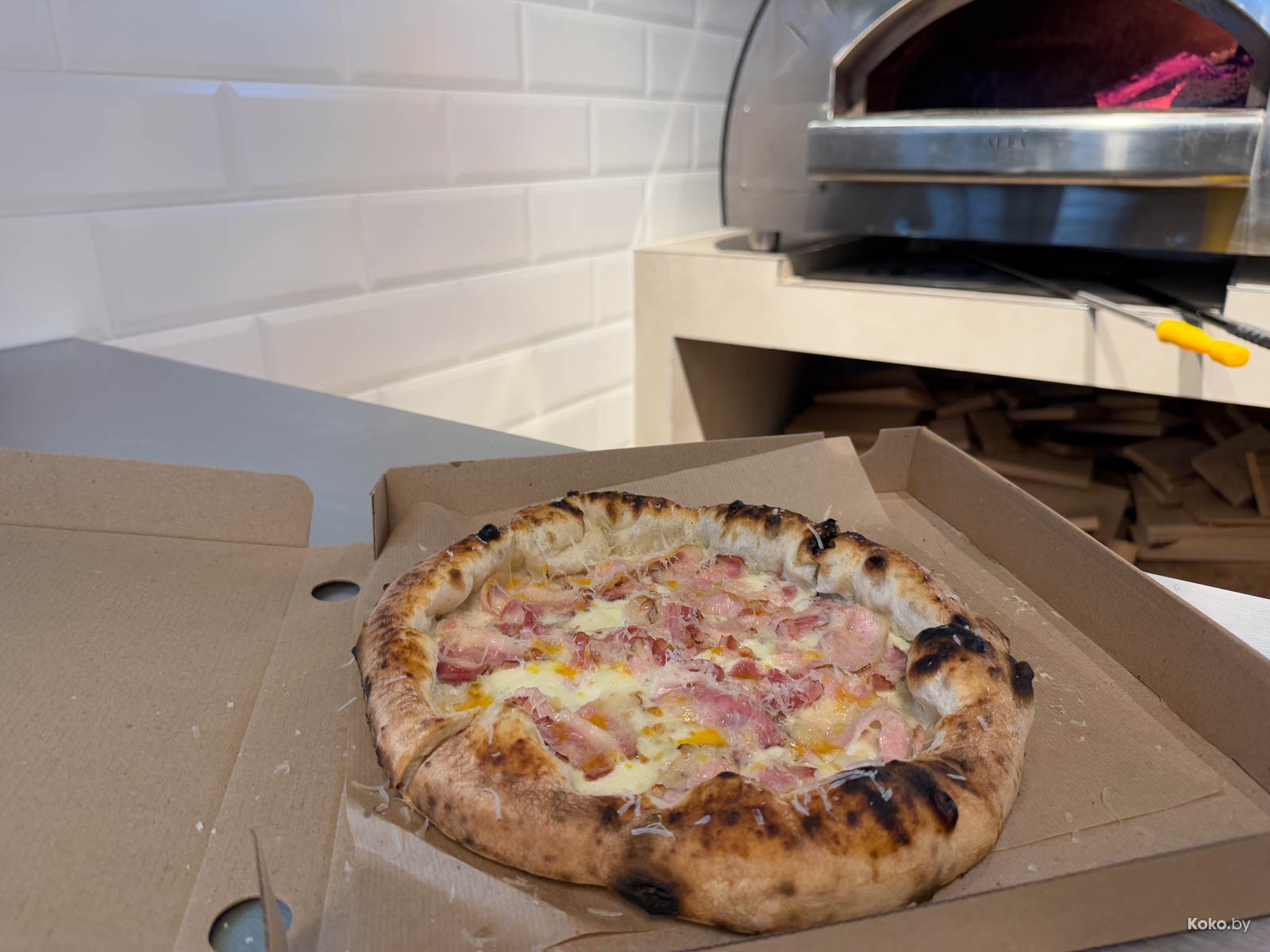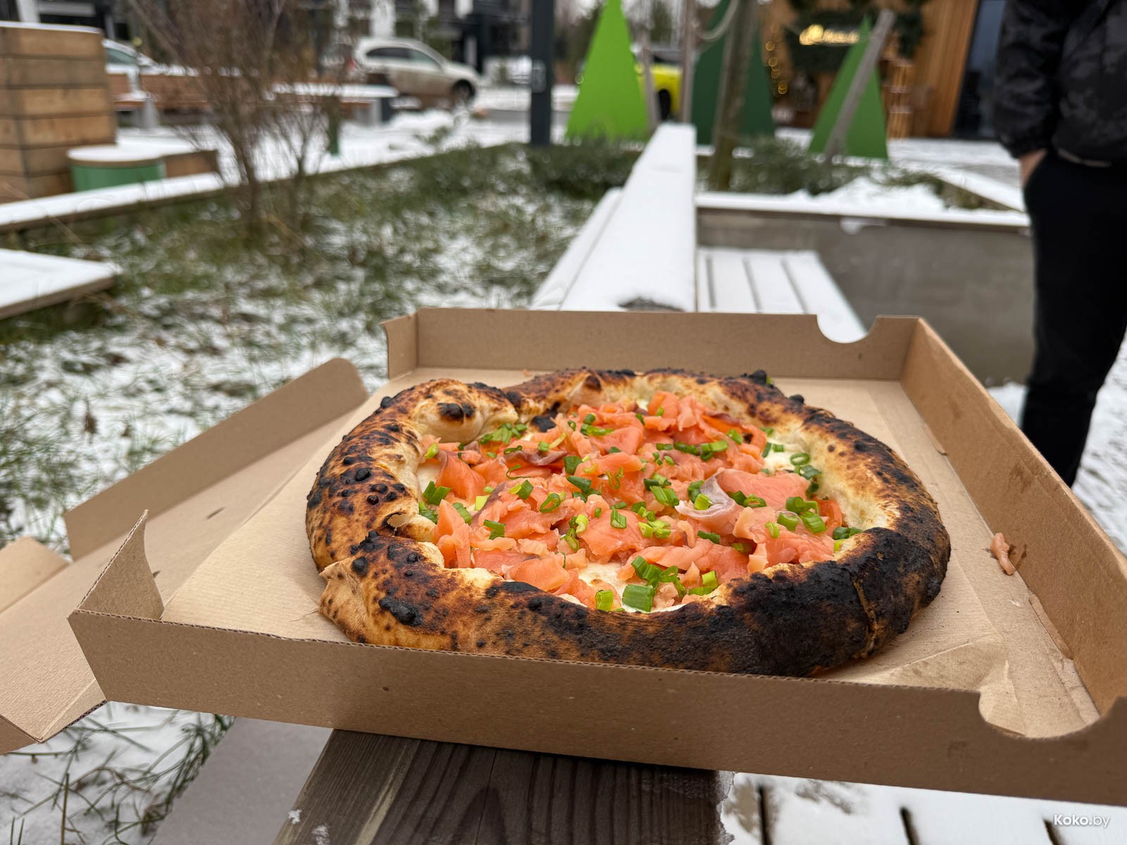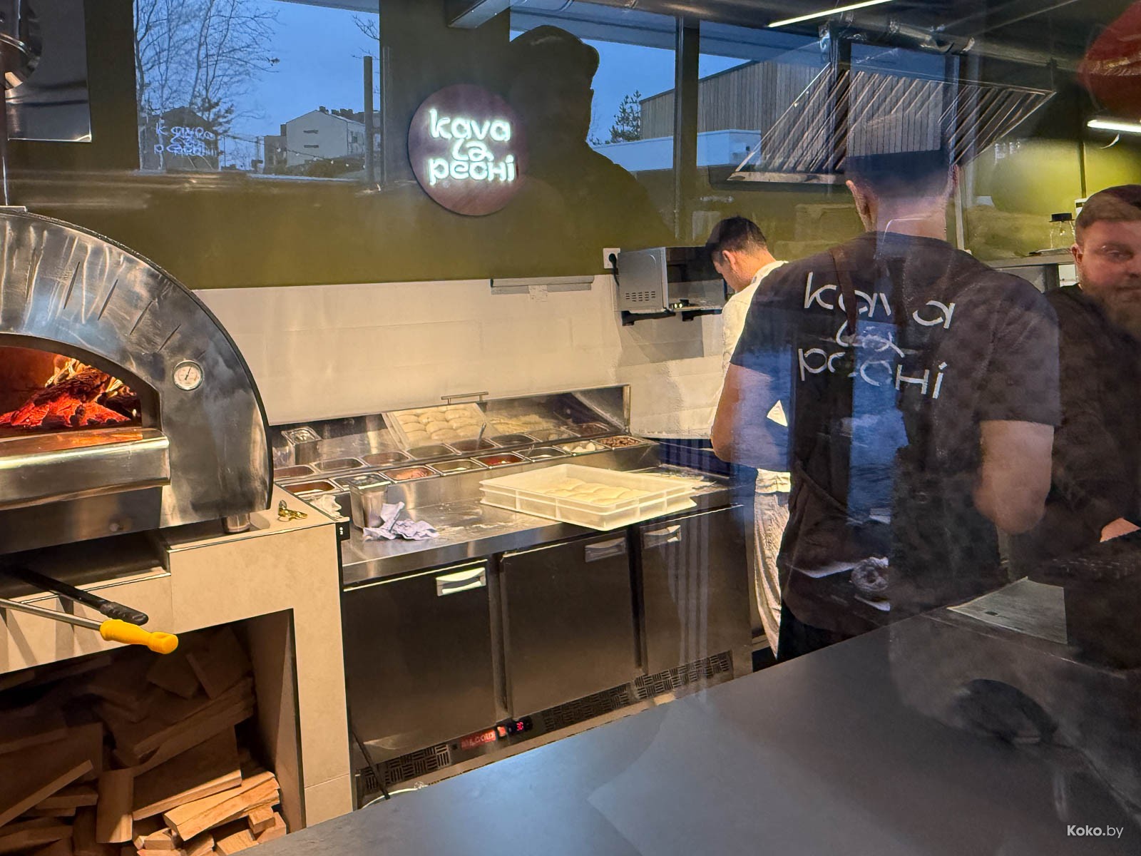 Вторая точка с едой в загородном жилом комплексе типа посёлок, который активно застраивают новыми домами. Не уверен, что те, кто покупал отдельные дома для уединения от суеты по 600 000 баксов плюс, рады такой движухе, а может так и веселее. Новая будка с печкой на дровах появилась на центральной площади, вижу знакомые лица с «Пицца Трака», таки Минск маленький и уютный город, даже за МКАД. Назвались «Кава ла печи» с пиццей на диком огне.