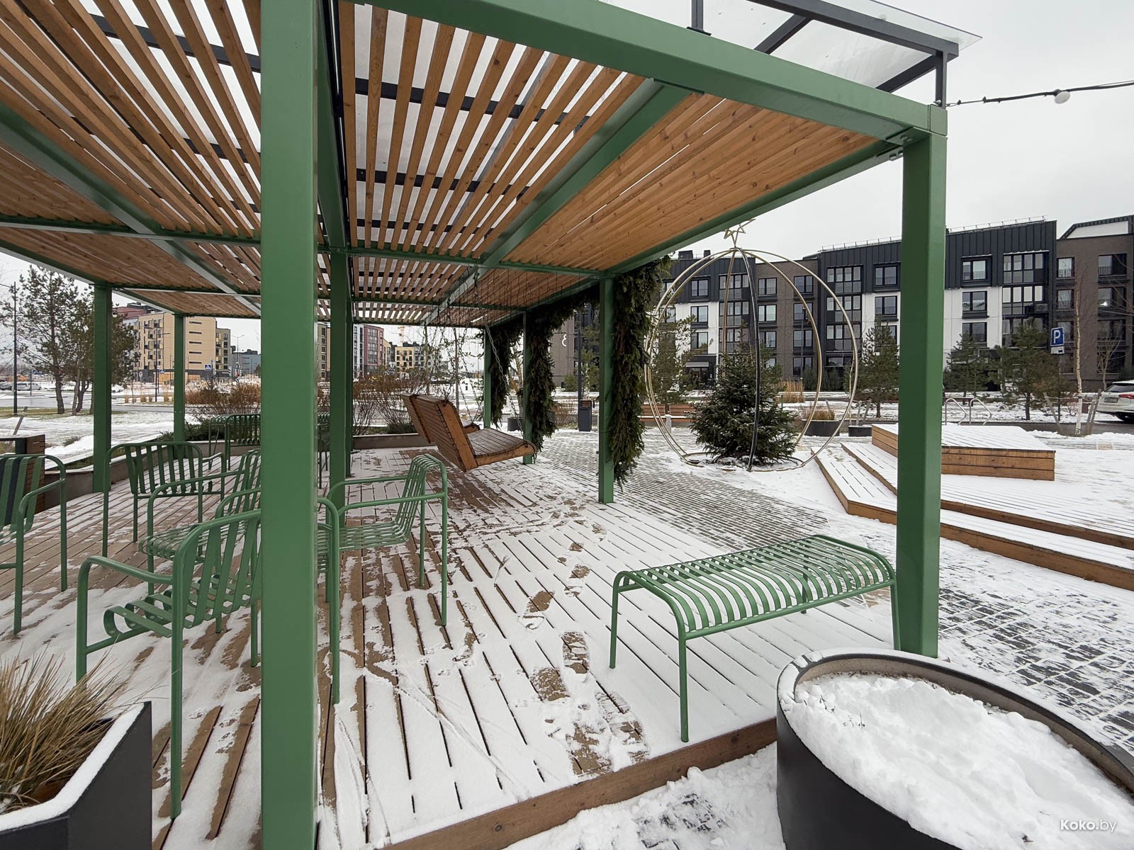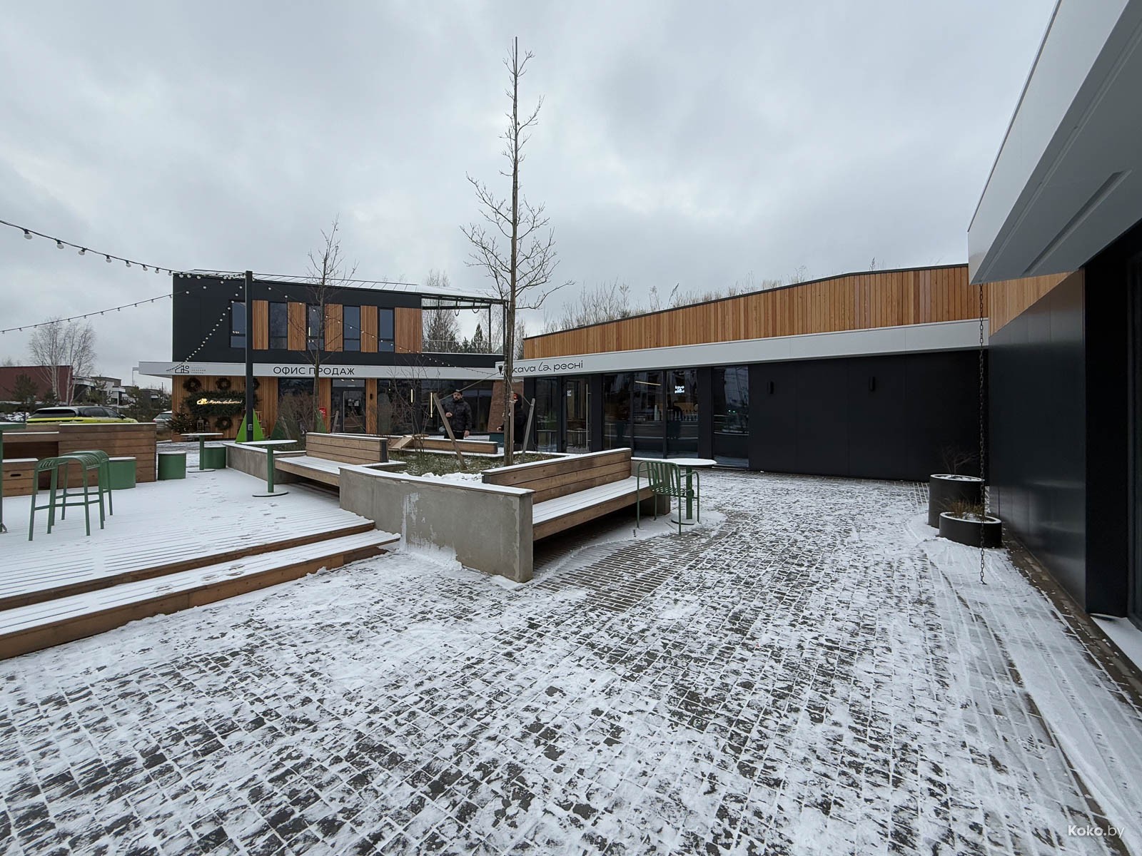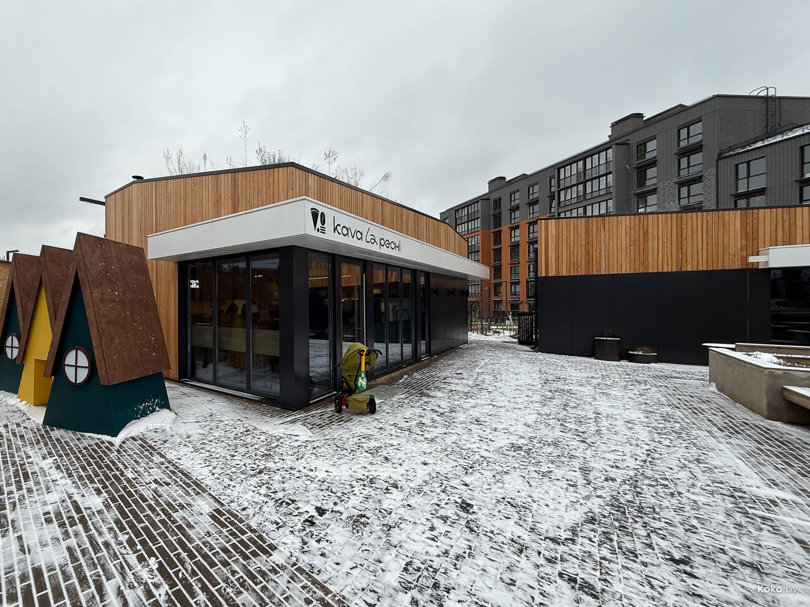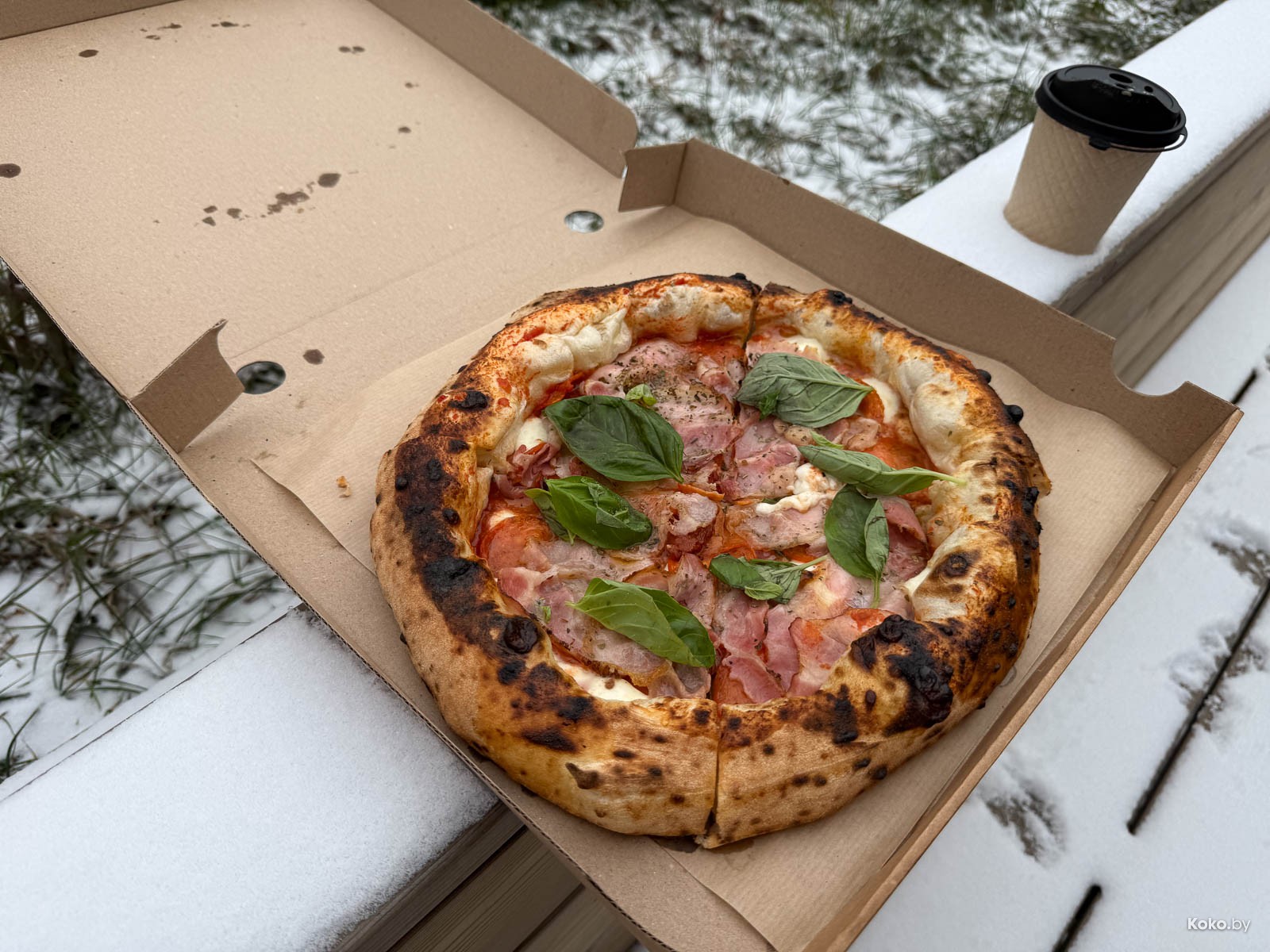 Вторая точка с едой в загородном жилом комплексе типа посёлок, который активно застраивают новыми домами. Не уверен, что те, кто покупал отдельные дома для уединения от суеты по 600 000 баксов плюс, рады такой движухе, а может так и веселее. Новая будка с печкой на дровах появилась на центральной площади, вижу знакомые лица с «Пицца Трака», таки Минск маленький и уютный город, даже за МКАД. Назвались «Кава ла печи» с пиццей на диком огне.