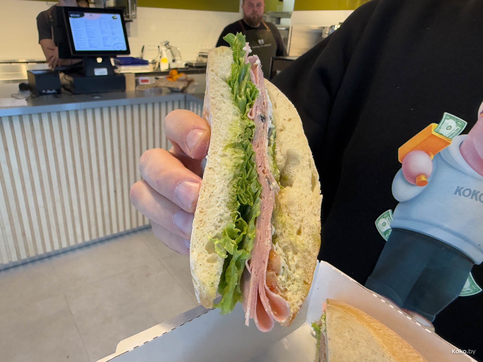 3. Бутер с колбасой за 15р, как дома: свежая булка, колбаса из лавки, зелёный салат, сыр моцарелла и соус песто. База.