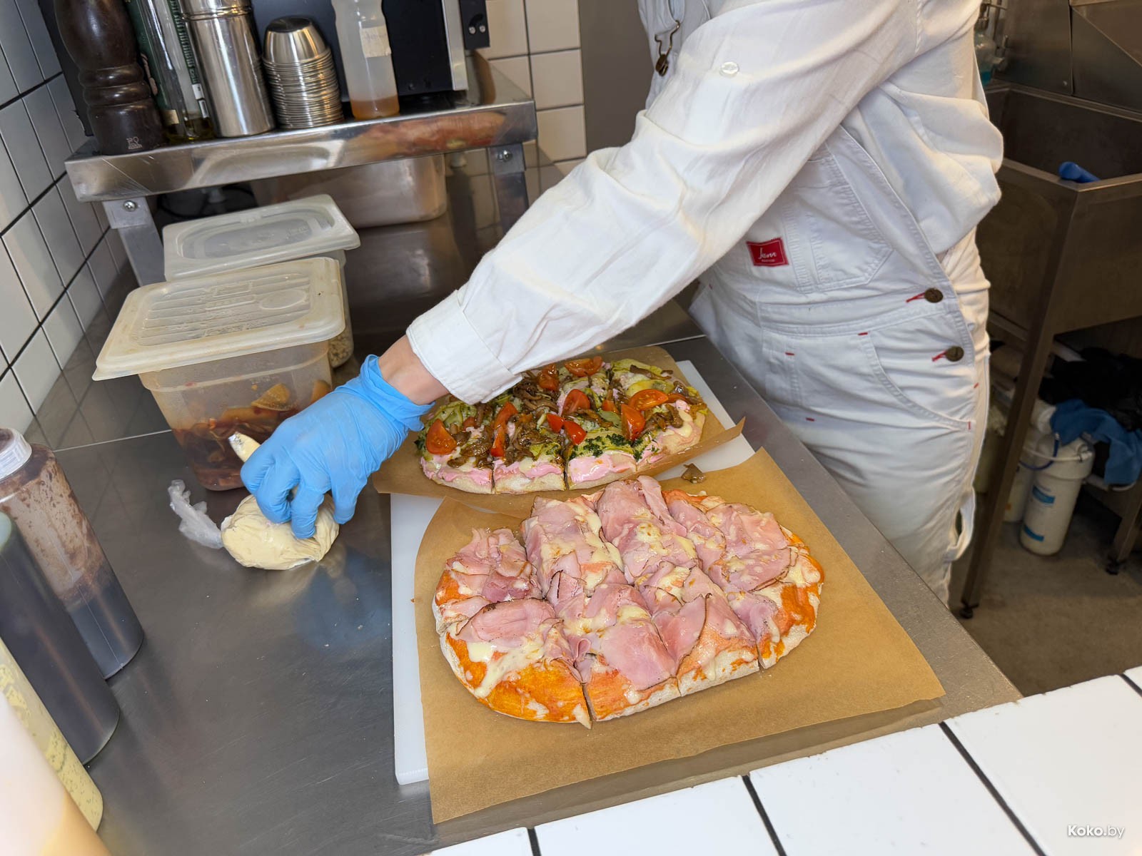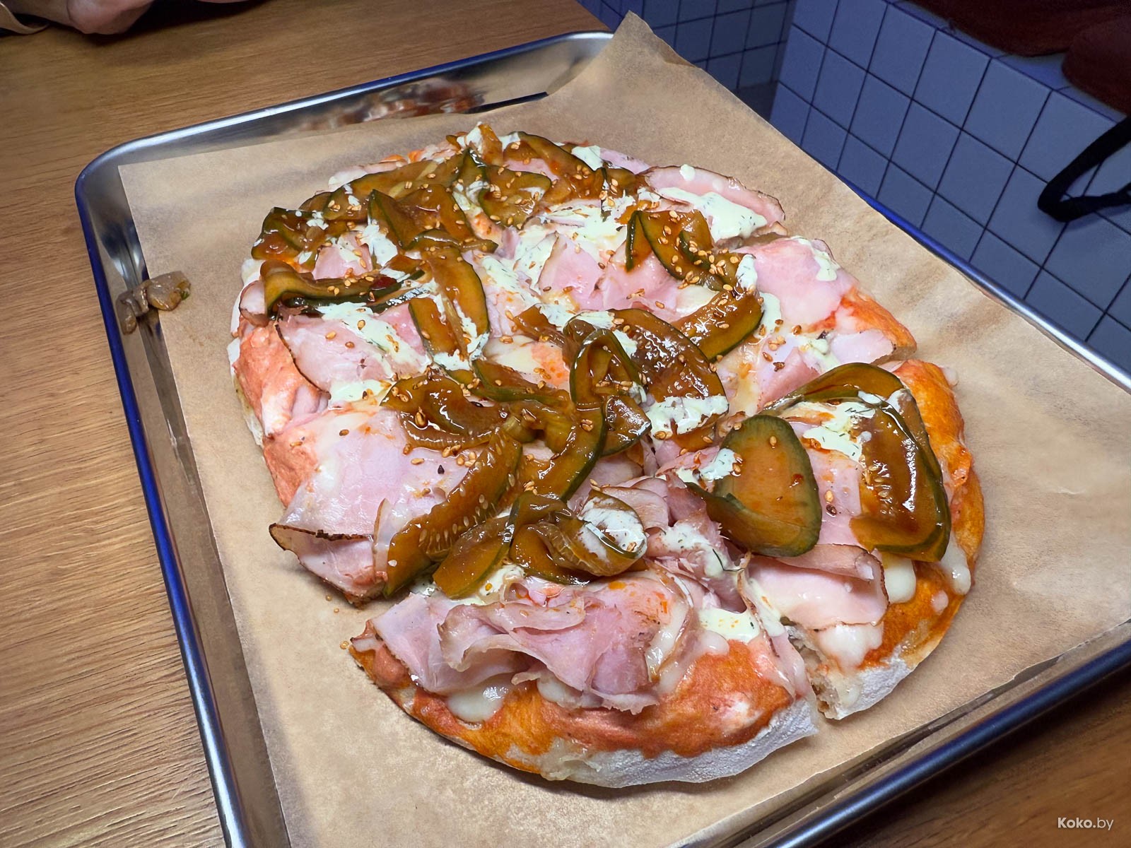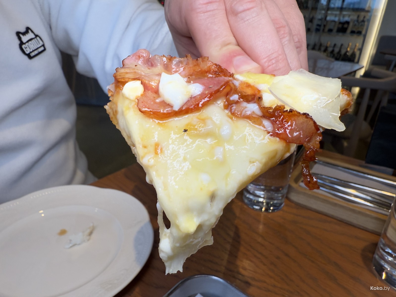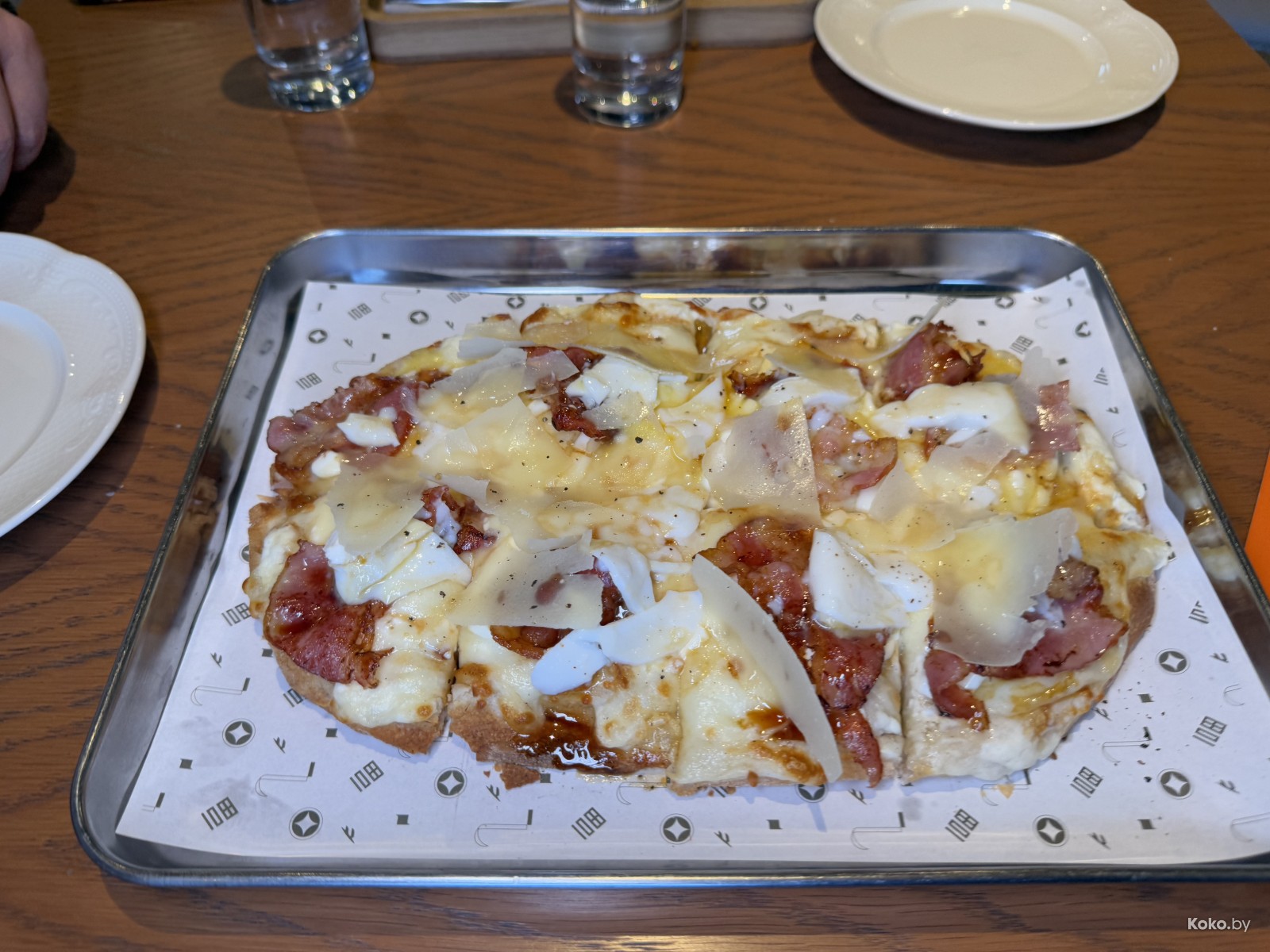 У пинсы начинка вкуса завтрака: из яиц, хрустящего до чипсов бекона, пармезана и мягкого крем-сыра, сверху сбрызнули сладким соусом унаги. Сытно, вкусно, по 20р с человека за обычные продукты на тесте.