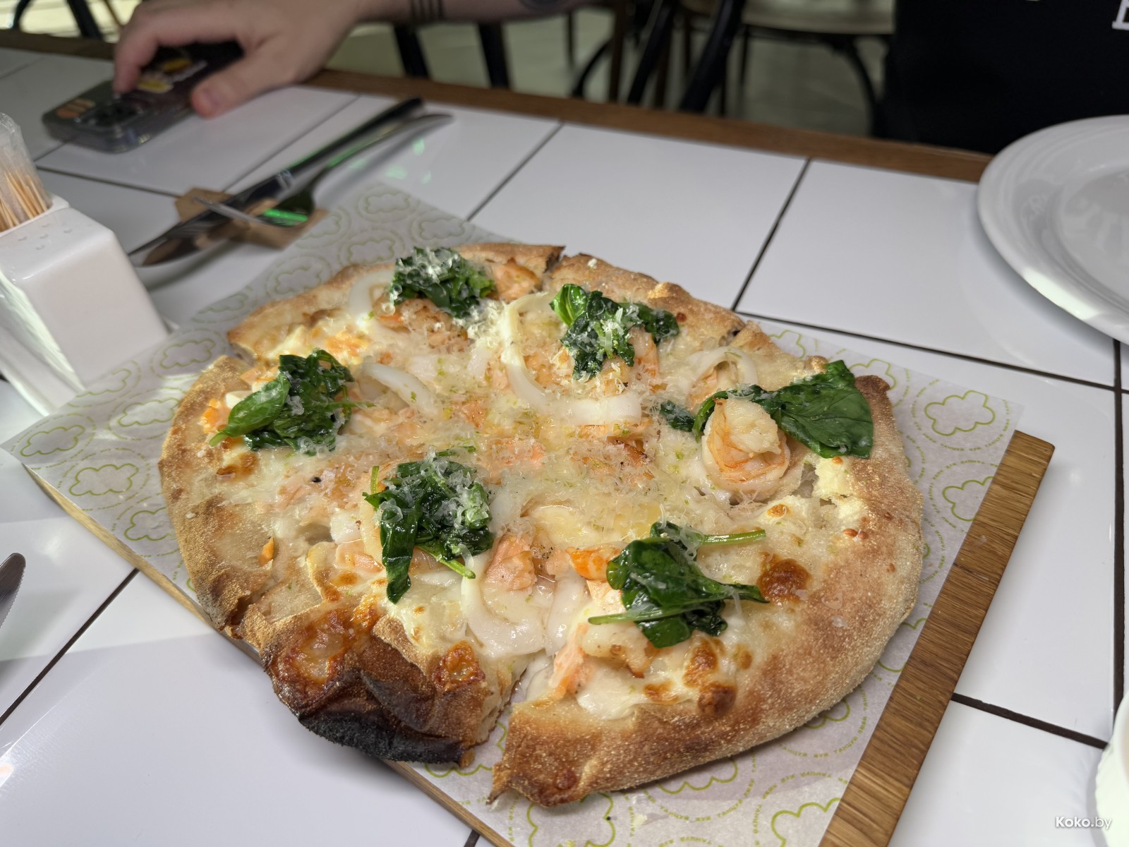 По тесту вопросов не имею: пышное, воздушное, ненасытное, сверху микс ошпаренных кальмаров, креветок и лосося с нотками сока лимона.