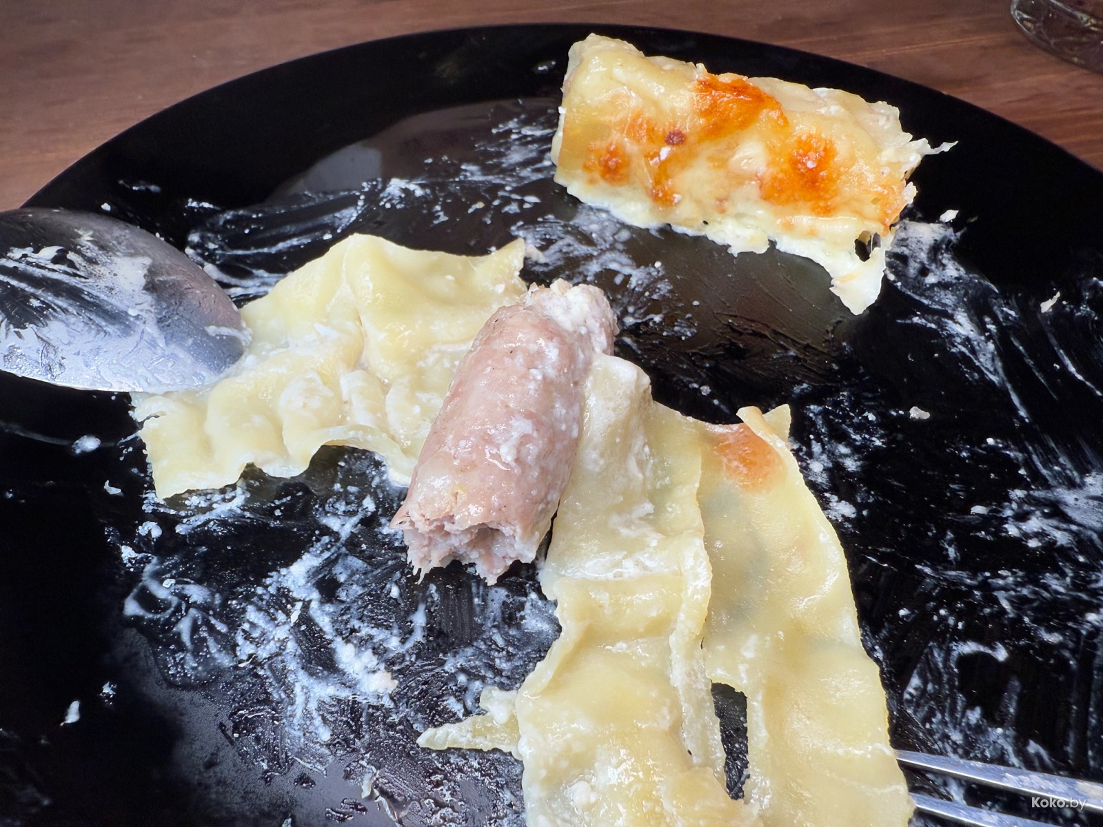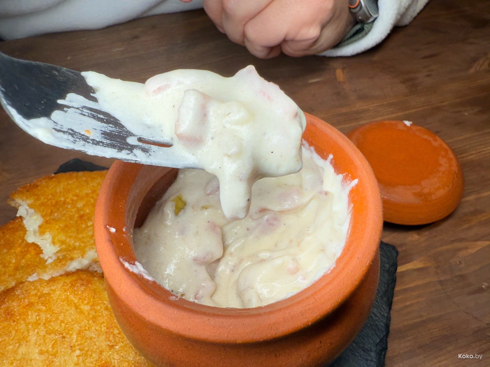 1. Резче всего приготовили мачанку по рецепту юных эльфов Беловежской пущи. За 19р - три круглых драника с малюпасеньким глиняным горшочком, в который чуть пролазит вилка. Что же там?
