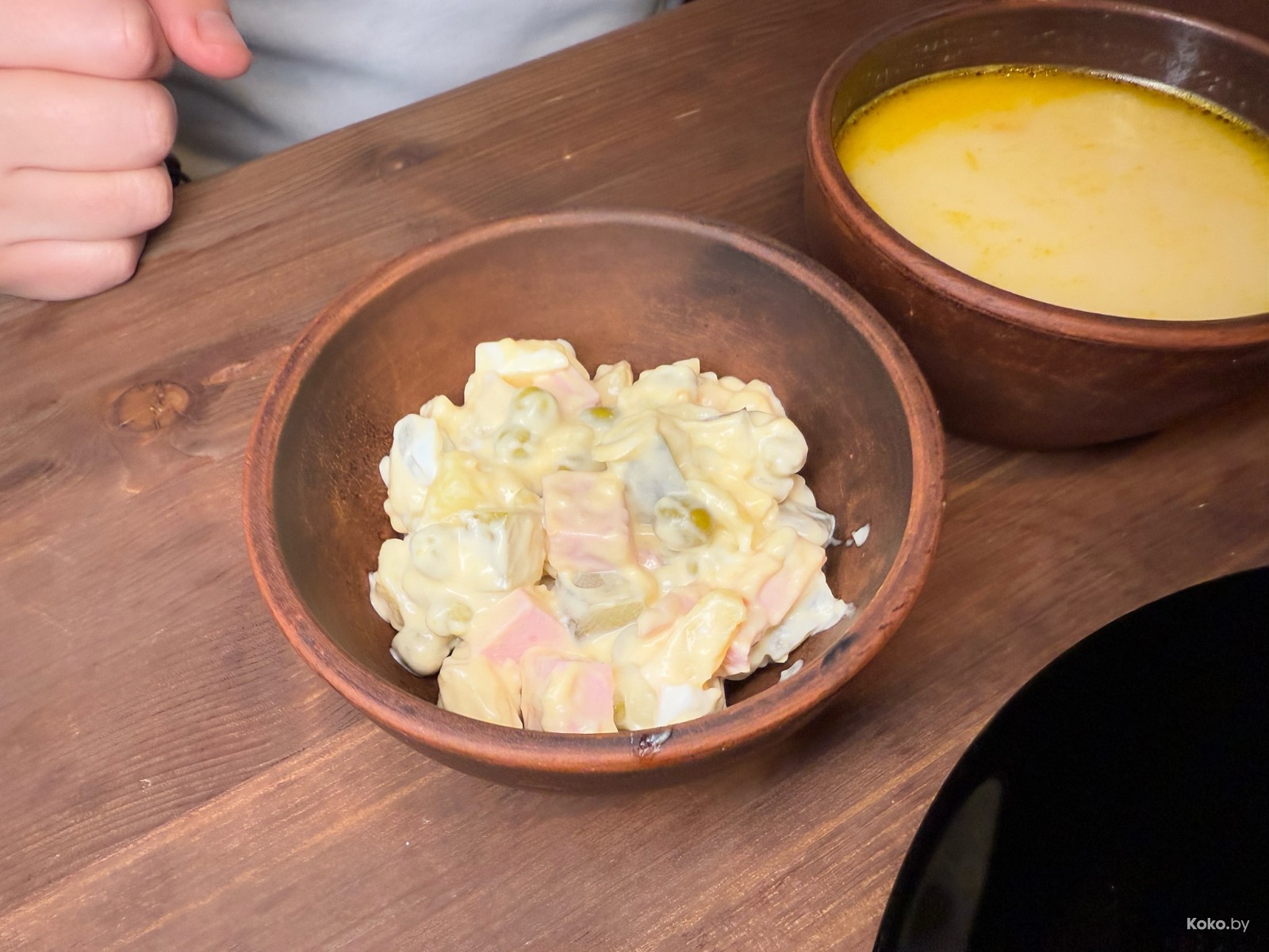Грибной суп больше сливочный, чем с грибами, шампиньоны для запаха. Колбасное Оливье по классике, фаршированные макароны под сыром - сытно и вкусно. Таки лучшее вложение 10р в обед на 7 кокобаев.