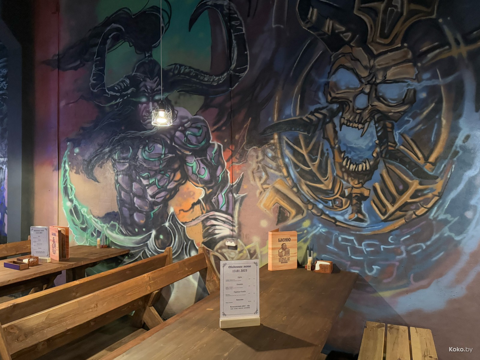 Попытались воссоздать таверну из игры, но недоиграли: не та посуда, бокалы, музыка, мало элементов дизайна. Сквот для гиков получился.