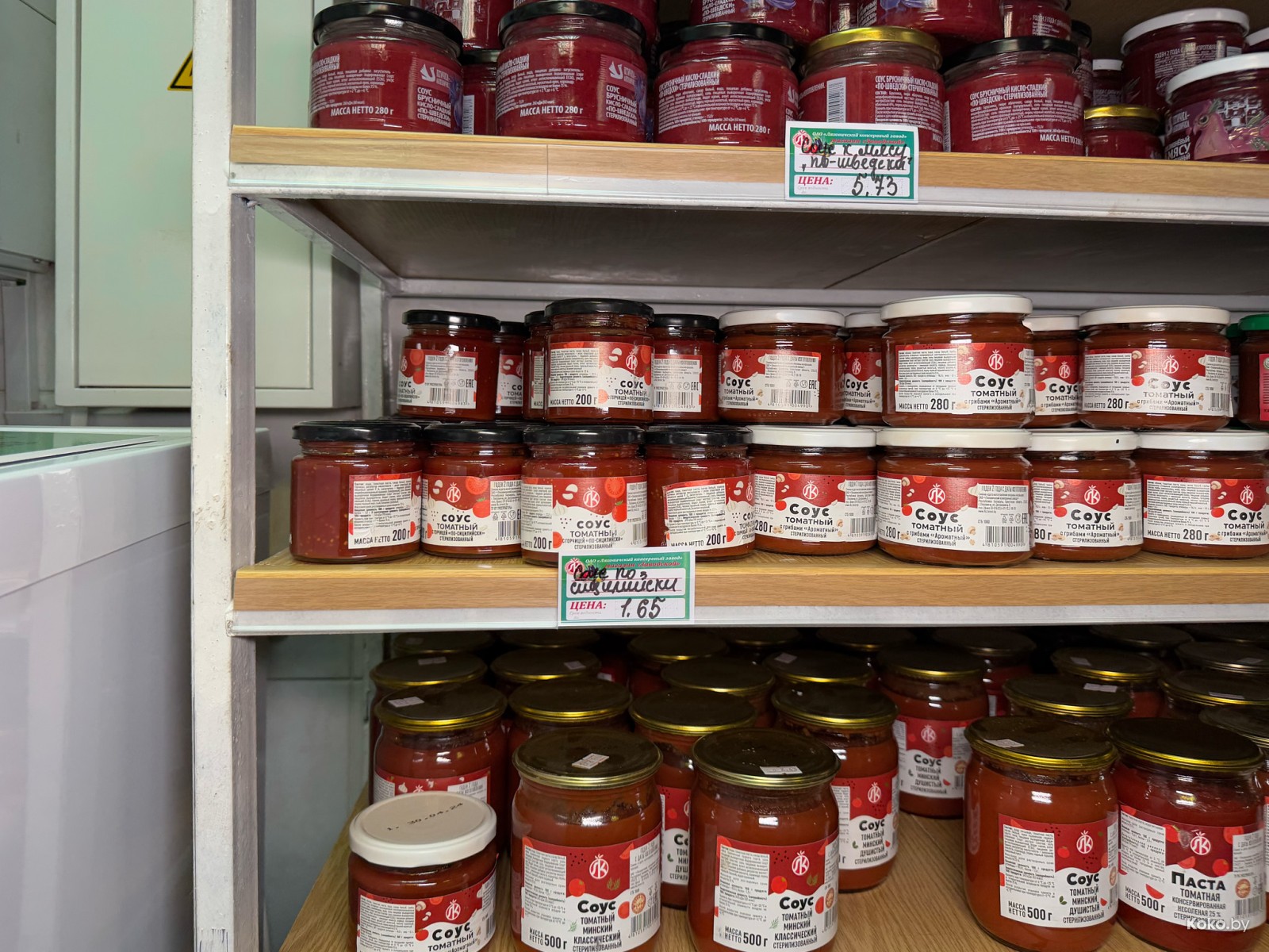 Цены на закатки, как взрыв из прошлого: борщ в банке за 2,63р, готовый свекольник - 2,73р, пюре из яблок - 2,07р, томатный соус по-сицилийски - 1,65р. Для богатых - брусничный эко-соус к мясу по-шведски за 5,73р.