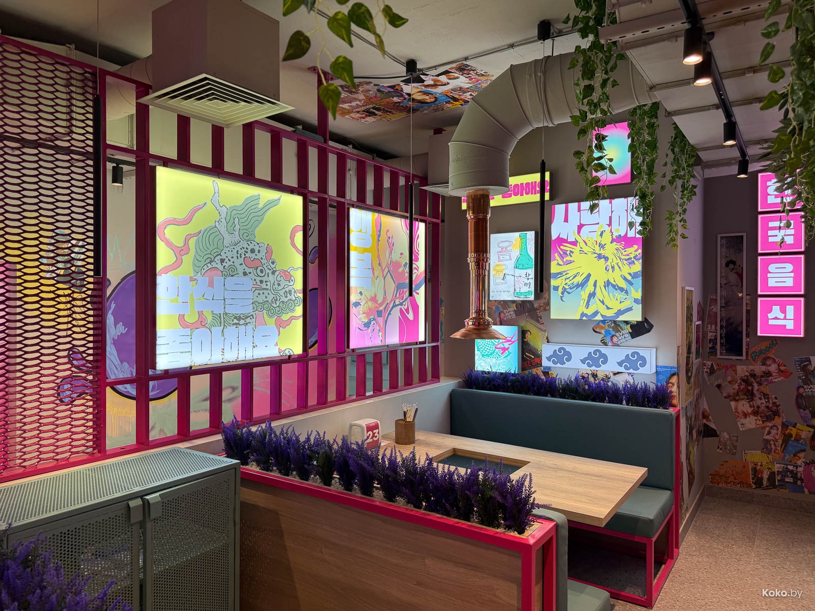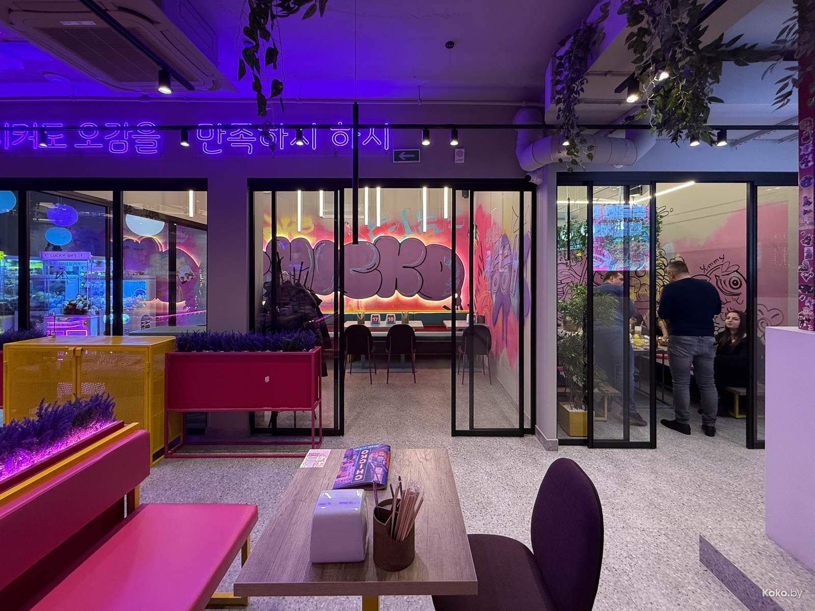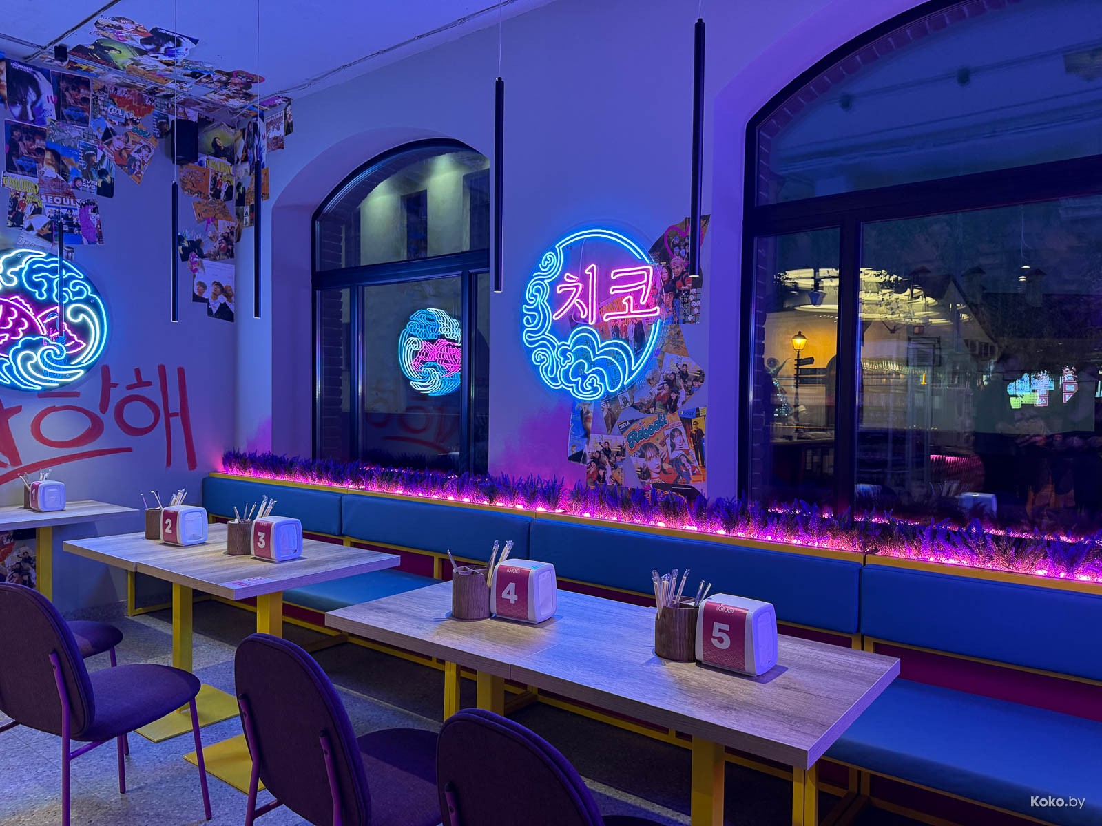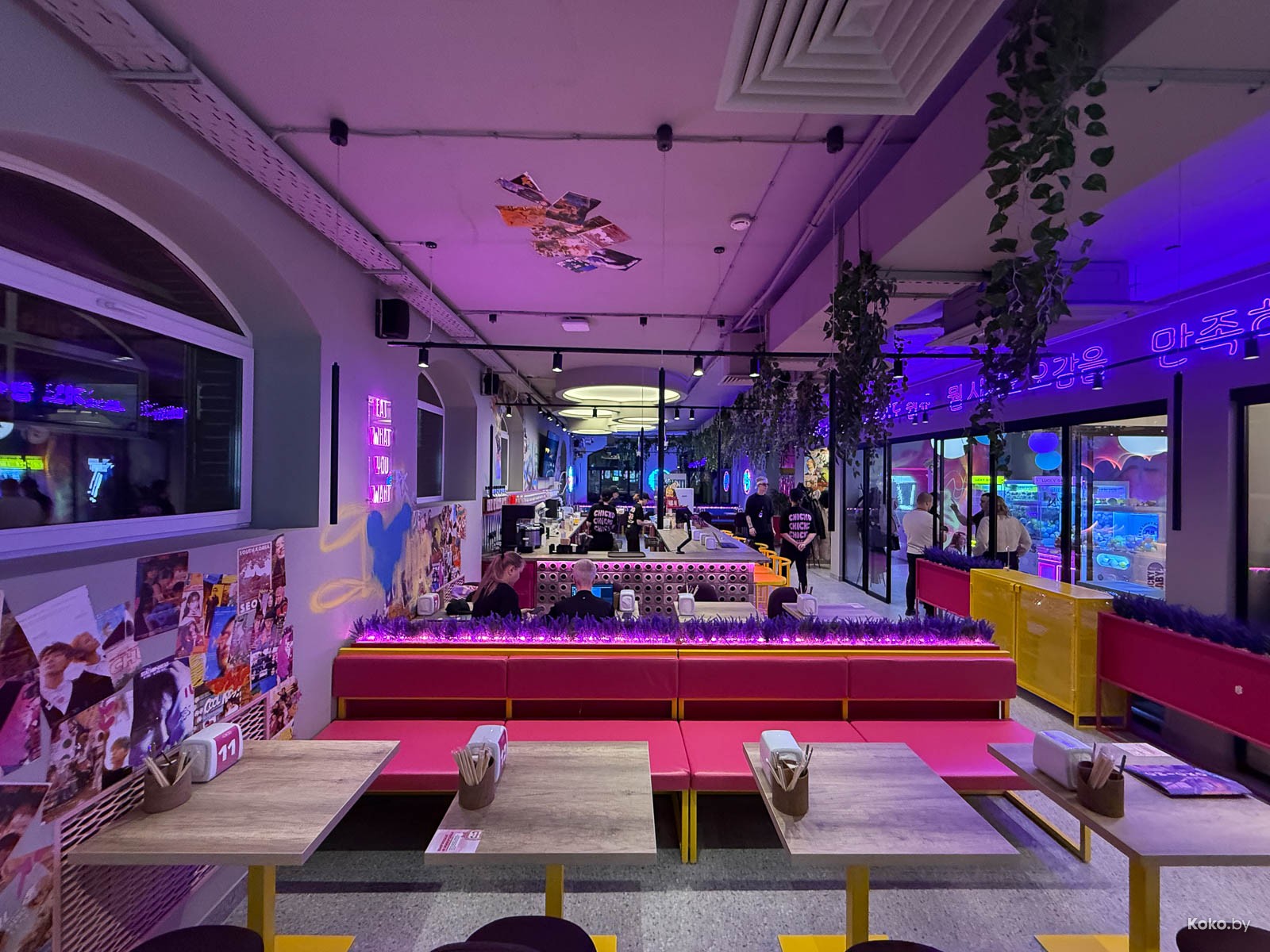 Как в корейских аниме - 100% неон, ярко, пёстро, фото-будка, автоматы с игрушками, магазин азиатских сладостей, корейский мини-бар и в столах корейский барбекю для жарки кого закажешь. Атмосфера на 10 из 10 для юных инстаграмщиков, аж в глазах рябит от удовольствия.