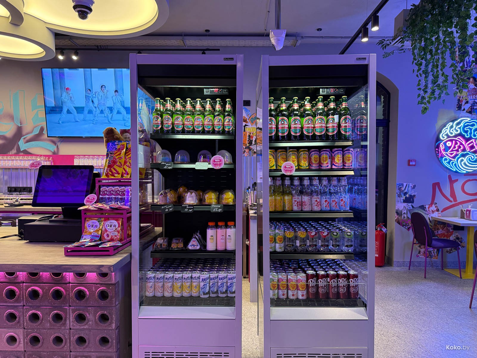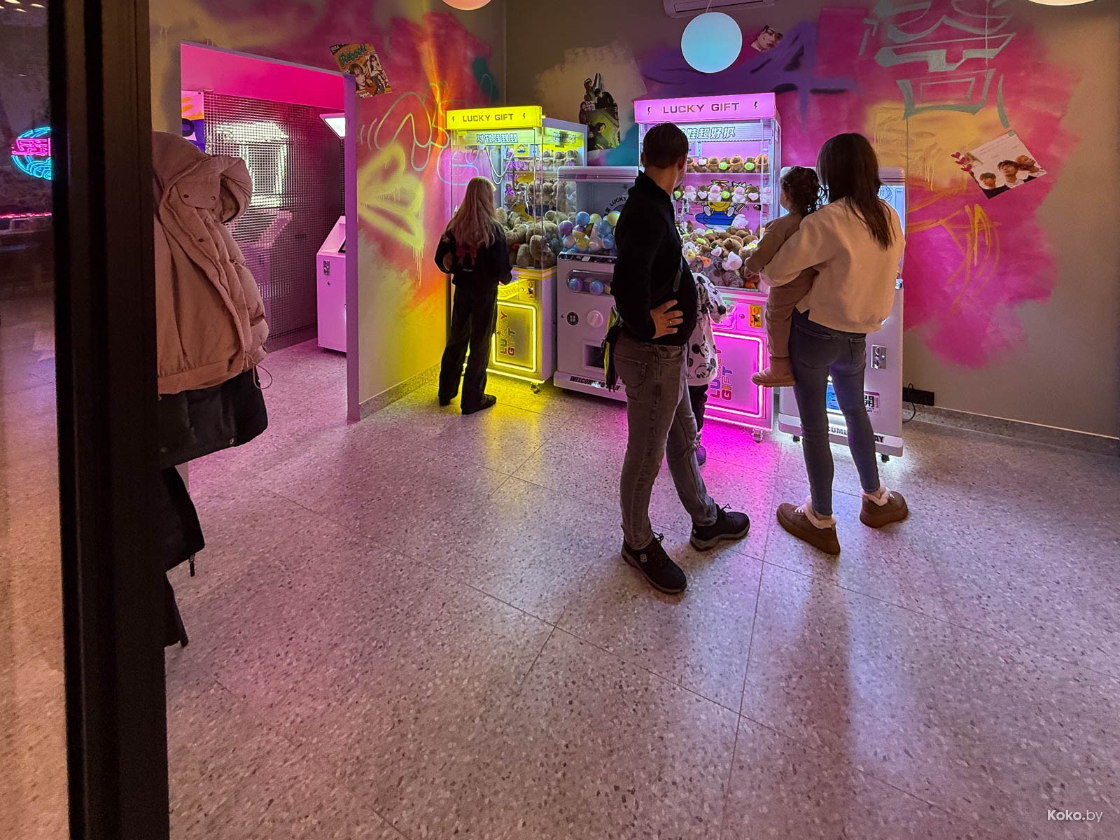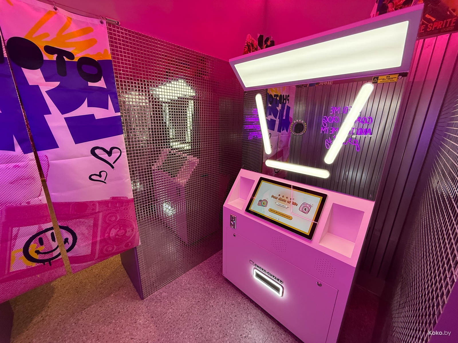 Как в корейских аниме - 100% неон, ярко, пёстро, фото-будка, автоматы с игрушками, магазин азиатских сладостей, корейский мини-бар и в столах корейский барбекю для жарки кого закажешь. Атмосфера на 10 из 10 для юных инстаграмщиков, аж в глазах рябит от удовольствия.