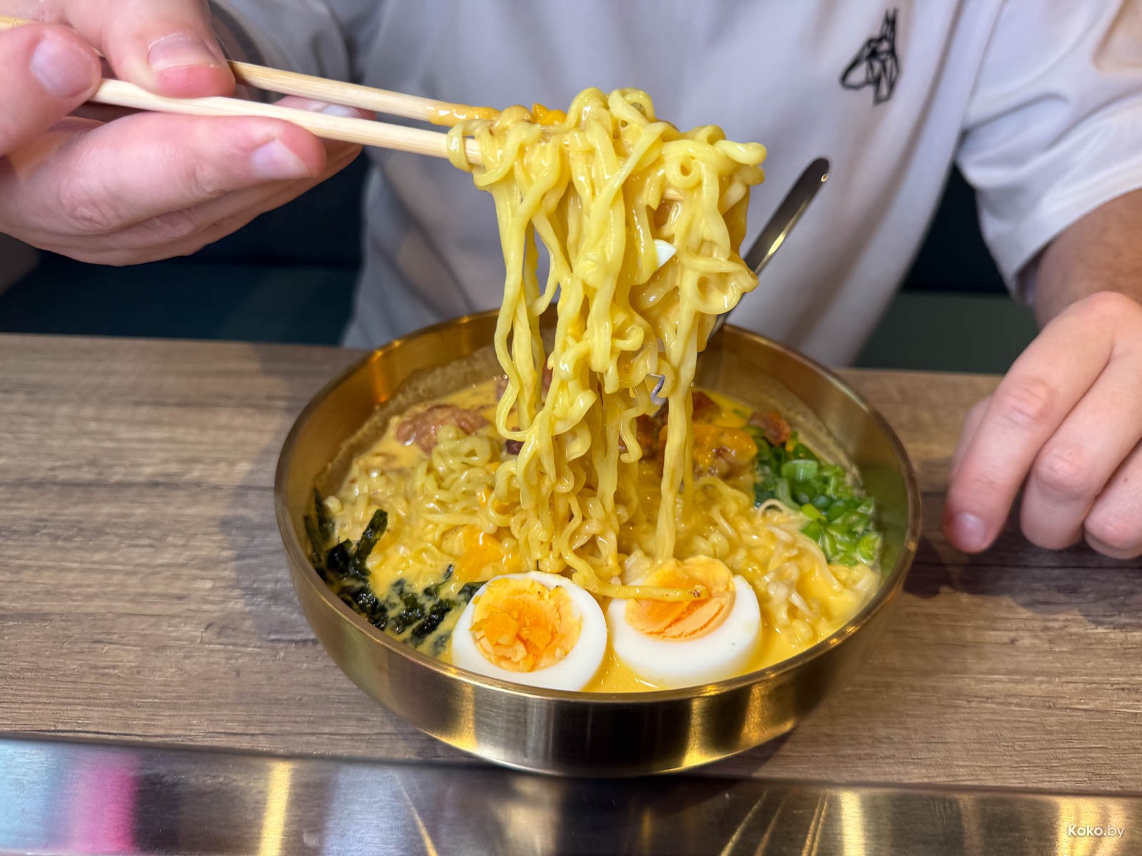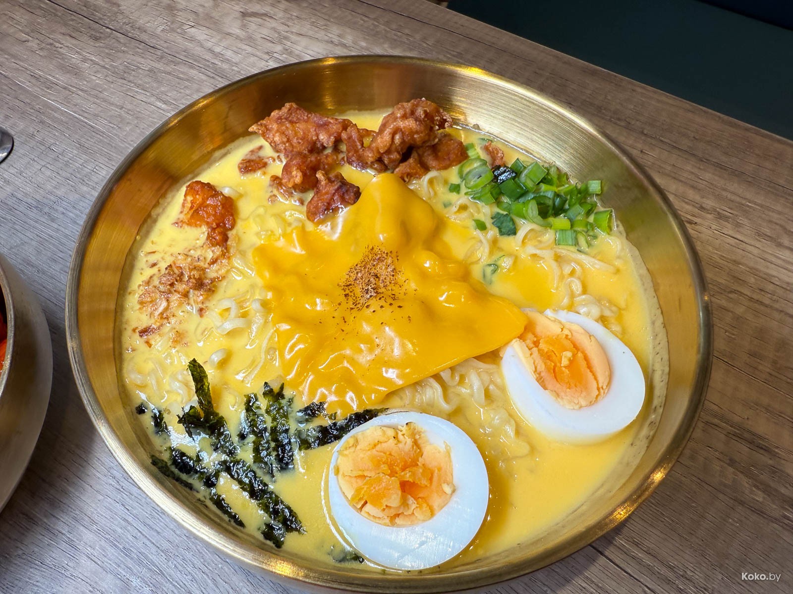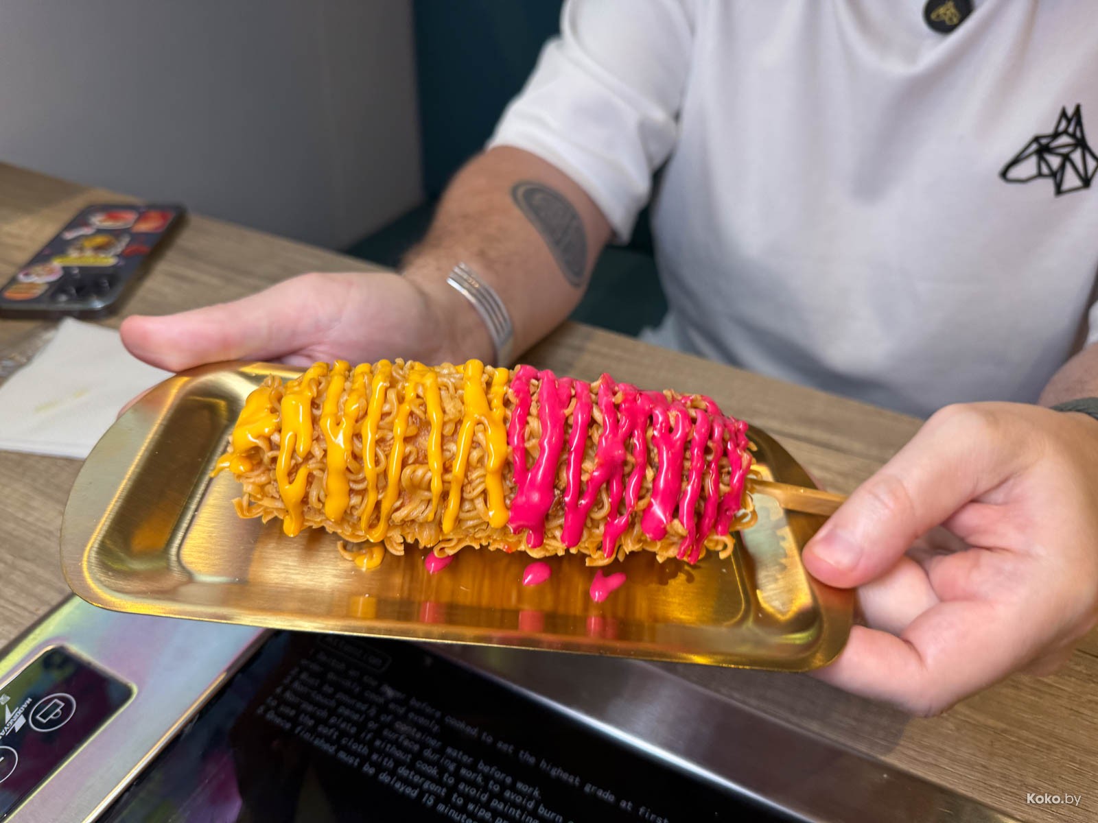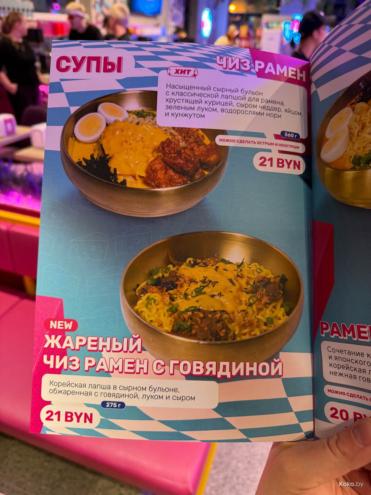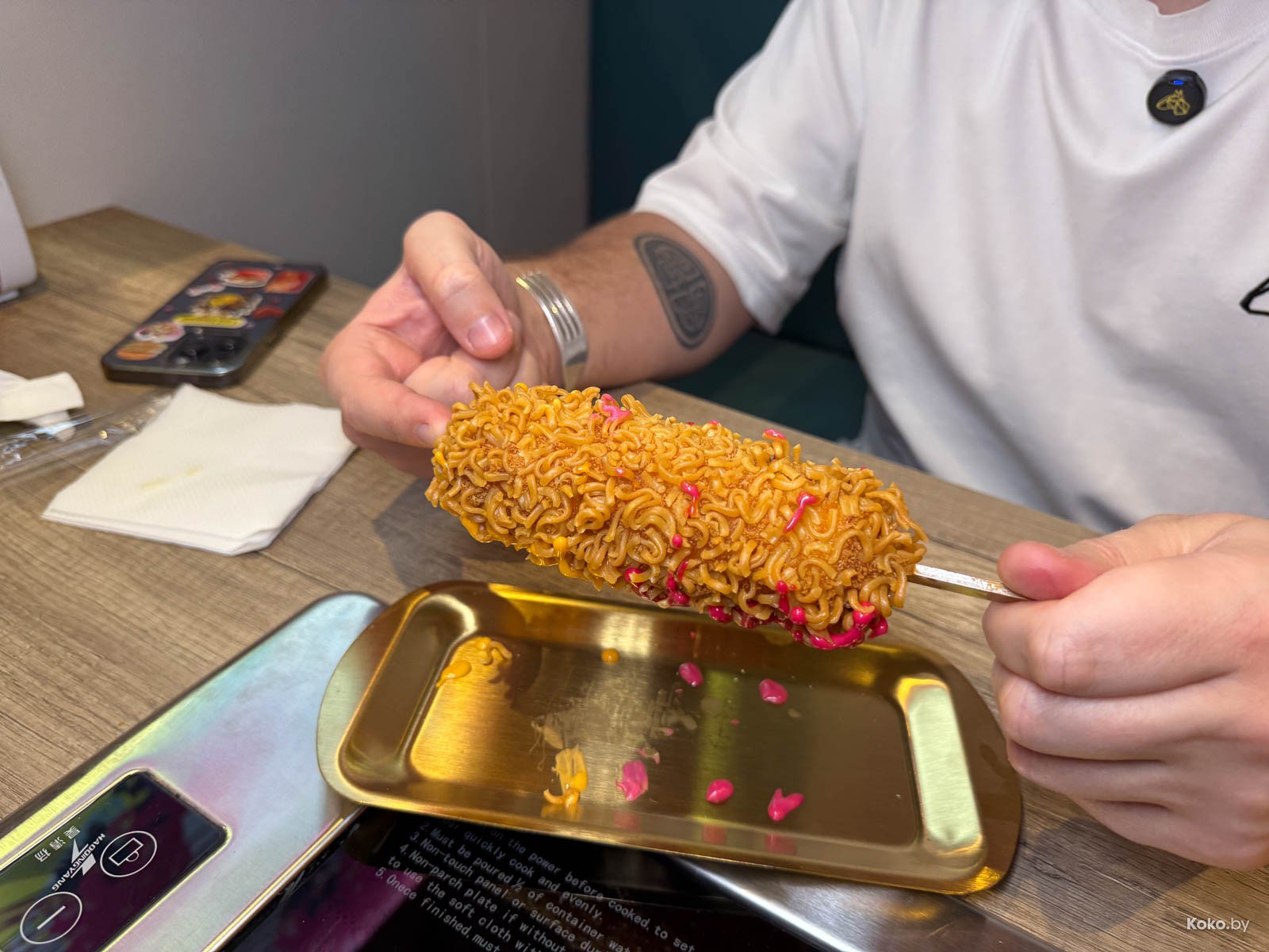 1. Точно сырный рамён за 21р, в который нужно больше бульона. И сырный корн-дог в панировке из бичпакета в двух соусах за 12р.
