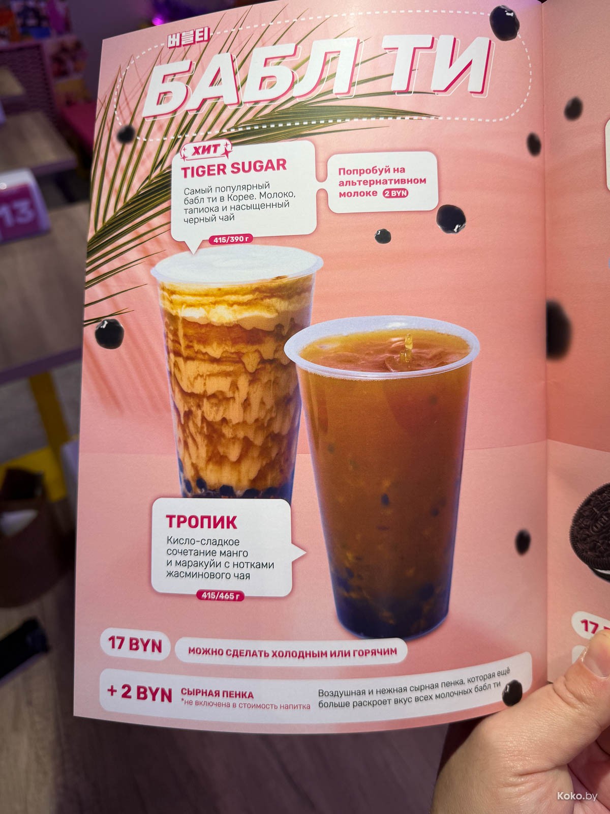 Визуально сочные фото блюд и не больно, средний чек на глаз около 40р: поесть плюс молоко тигра с шариками. В меню собрали хитовый корейский стрит-фуд, жаль, бешбармак с сашими из казы не готовят.