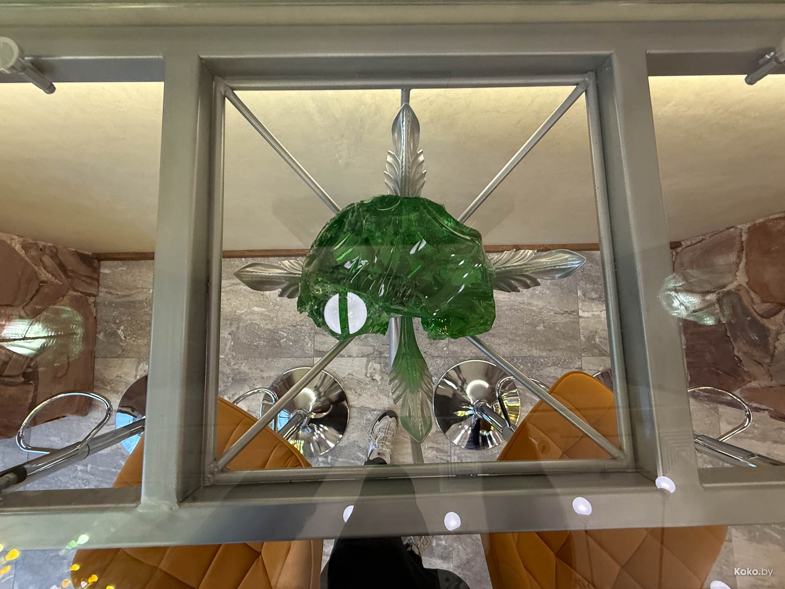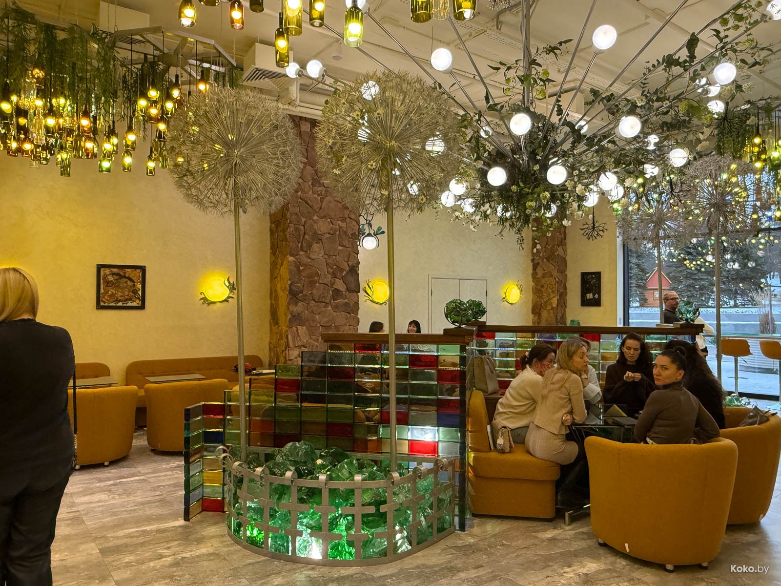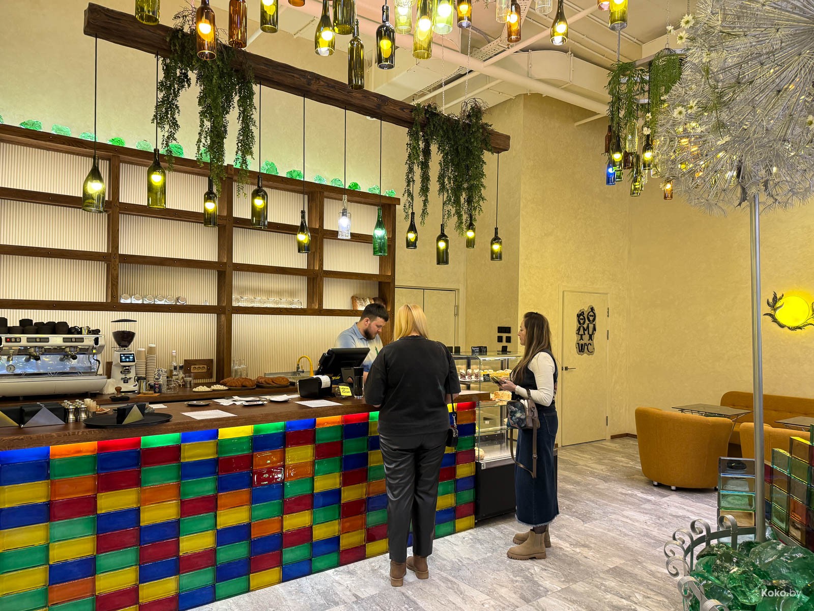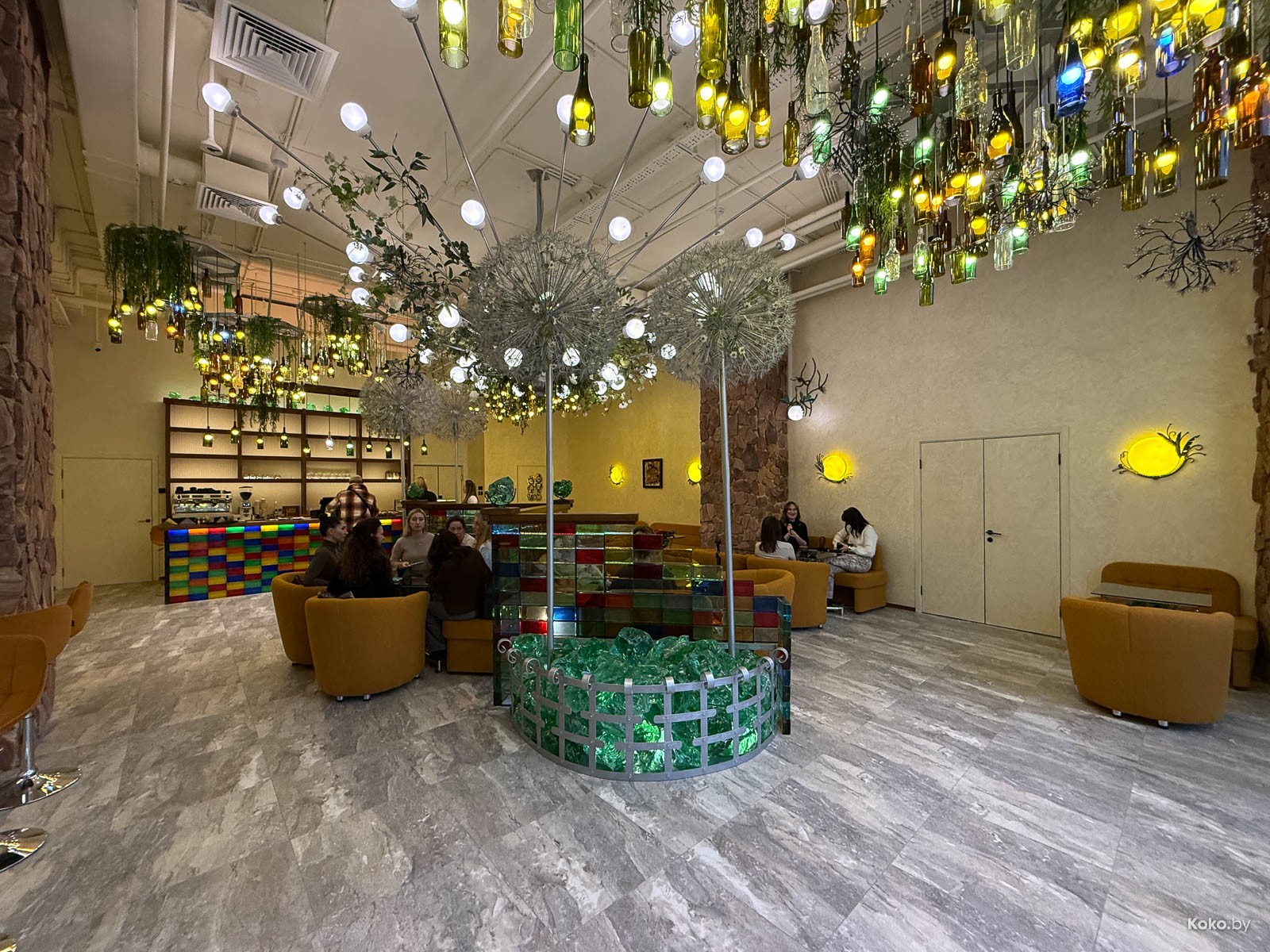 Сто процентов строили какой-нибудь лесной бар типа «Легендар», но что-то пошло не так. Кафе-пекарня, говорите? Люстры из бутылок, картины из бутылок рома Бумбу, бутылочный стеллаж за баром, пауки-лампы на стенах. Всё кричит: «Вам покислее или послаще?»