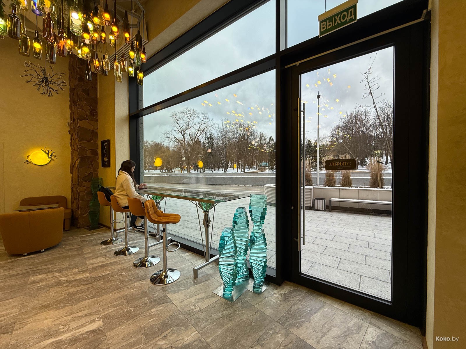 Высокие потолки, мягкие диванчики, много света, большие окна, вдоль которых барный стол для любования природой. А знаете, годно, кроме пауков, нелепых картин и стеклянных столов, как витрина в аптеке.